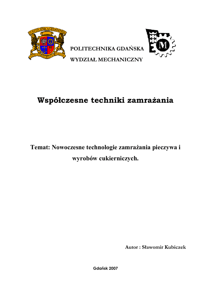 POLITECHNIKA GDAŃSKA WYDZIAŁ MECHANICZNY Współczesne techniki zamraŜania Temat: Nowoczesne technologie zamraŜania pieczywa i wyrobów cukierniczych. Autor : Sławomir Kubiczek Gdańsk 2007 Spis treści: 1) W jakim celu ma słuŜyć zamraŜanie Ŝywności. 2) Pieczywo i wyroby cukiernicze . 3) Powstawanie jak i problemy technologiczne pieczywa i wyrobów cukierniczych. 4) Problemy technologiczne pieczywa. 5) Technologia zamraŜanie i przechowywania wypieków pieczywa. 6) Technologia zamraŜanie i przechowywania wyrobów cukierniczych. 7) RozmraŜanie zamroŜonego pieczywa i wyrobów cukierniczych. 8) Wnioski . 9)Literatura: 1) W jakim celu ma słuŜyć zamraŜanie Ŝywności ? a) ZamraŜanie Ŝywności pozwoli na eksport jej za granicę. b) W okresach zwiększonego zapotrzebowania (jako interwencyjna rezerwa towarowa, uruchamiana przez piekarnie dla pokrywania niedoborów rynkowych w okresach wzmoŜonego popytu): c) przed weekendami, dniami świątecznymi, w szczytach sezonu urlopowego. d) W okresach w których z róŜnych przyczyn występują trudności w zapewnieniu ciągłości dostaw(kataklizmy, załogi statków, wypraw arktycznych, lotów kosmicznych) e) Dla klienta detalicznego(do pieczenia w domu lub marketach) 2) Pieczywo i wyroby cukiernicze: Przez pojęcie pieczywo rozumie się szeroki asortyment podstawowych produktów Ŝywnościowych, stanowiących wypieki ciasta sporządzonego z: Mąki tzw. zbóŜ chlebowych (Ŝyto, pszenica) Wody , soli jak i innych dodatków(do około 11%), Spulchnianego przy uŜyciu droŜdŜy zakwasu lub środków chemicznych Wyroby cukiernicze są produktem roślinnym o zbliŜonym charakterze róŜnica jest jedynie w innym sumarycznym udziale surowców dodatkowych(tłuszczu i cukrów- powyŜej 40%) w stosunku do masy mąki. Dzielimy je na: trwałe( m. in. herbatniki, pierniki, wafle, suchary) i nietrwałe (m. in. torty, ciasta, pączki) WyróŜnia się teŜ grupę luksusowych wyrobów półcukierniczych (chały, rogale, bułki maślane) 3) Powstawanie jak i problemy technologiczne pieczywa i wyrobów cukierniczych. Schemat produkcji pieczywa: 1. Przygotowanie i tzw. prowadzenie ciasta.(Wymieszanie mąki z odpowiednią ilością wody celem spęcznienia glutenu tworzącego szkielet ciasta, a następnie kształtowanie jego parametrów, zwłaszcza konsystencji, z dostosowaniem do warunków namnaŜania droŜdŜy) 2. Rozrost tj. fermentacja ciasta lub uformowanych z niego wyrobów.(Wydzielają się w tym procesie pęcherzyki CO2 , ulegają zatrzymaniu w cieście i powodują jego rośnięcie) 3. Wypiek w piecach piekarskich :w temperaturze 200:300oC (małe sztuki), w temperaturze 230:250oC (większe bochenki) Przebieg Wypieku: - Gdy środek produktów osiąga temp. Ok. 100oC Następuje skleikowanie i częściowy rozpad skrobi oraz ścięcie białek co powoduje usztywnienie ciasta i utrwalenie porowatej struktury pieczywa. - Gdy temp na powierzchni skórki osiąga 130-140oC skleikowana skrobia zamienia się w dekstryny, a związki białkowe częściowo hydrolizują. Dalszy wzrost temp. Powoduje powstanie brunatnych połączeń cukrów z produktami rozpadu białek a takŜe substancji melaniodowych tworzących rumianą skórkę o typowym ‘’chlebowym’’ zapachu. 4) Problemy technologiczne pieczywa. Podstawowym problemem technologicznym pieczywa są Zmiany chemiczne i fizyczne. NajwaŜniejszym czynnikiem powodującym starzenie się pieczywa oraz stratę jego naturalnych walorów jest czerstwienie. Czerstwienie – objawy: spadek wilgotności jaki i elastyczności miąŜszu ,twardnienie i podatność na kruszenie, zanik chrupkości skórki i innych cech sensorycznych. Głowna przyczyny tego nie poŜądanego zjawiska są zmiany w rozmieszczeniu wody pomiędzy węglowodanowymi i białkowymi składnikami pieczywa oraz zmiany w wewnętrznych strukturach tych składników czyli retrogradacja skrobi(przekształcenie z formy bezpostaciowej w krystaliczną z jednoczesnym wydzieleniem wody). Szybkość czerstwienia pieczywa zaleŜy od wielu czynników m. in. rodzaju produktu, jakości uŜytej mąki i dodatków do ciasta, przebiegu procesów produkcji, rodzaju opakowania, warunków przechowywania i zamraŜania. Zapobieganie problemom technologicznym pieczywa Próby ograniczenia intensywności czerstwienia jak i poprawy jakości i trwałości pieczywa przy zastosowania tradycyjnych dla piekarstwa zabiegów. Czyli stosowanie w tym celu dodatkowych określonych substancji oraz tzw. polepszaczy. Nie rozwiązały w pełni problemu co skłoniło branŜe piekarską do zainteresowania się moŜliwościami jakie w tym zakresie stwarzało wykorzystanie niskich temperatur. GdyŜ jak się okazało szybkość procesów czerstwienia jest silnie zaleŜna od temperatury 5) Technologia zamraŜanie i przechowywania wypieków pieczywa. Doświadczalnie ustalono wpływ temperatury na przebieg czerstwienia wypieczonego ciasta. Jak wynika z wykresu proces ten rozpoczyna się krótko po wyjęciu z pieca i wystudzeniu do około 60 oC i trwa z nasilającą się w miarę jego schładzania dynamiką w całym zakresie temperatur plusowych. Przy temperaturze wewnętrznej od -2 oC do -3 oC szybkość czerstwienia osiąga maksimum o z dalszym spadkiem temperatury silnie maleje, ulegając efektywnemu zahamowaniu poniŜej -7 oC głownie w wyniku przerwania retrogradacji skrobi(tj. jej przekształcenie z formy bezpostaciowej w krystaliczną z jednoczesnym wydzieleniem wody).W temperaturze -7 oC rozpoczyna się wymarzanie zawartej w pieczywie wody i ograniczenie całokształtu wszystkich innych przemian. W praktyce technologicznej cały wierzchołek wykresu od ok. 10 oC do -7 oC, w którego obszarze mają miejsca najbardziej intensywne procesy starzenia produktów piekarskich uznany został za krytyczny, z zaleceniem aby zarówno w cyklach zamraŜania jaki i rozmraŜania pieczywa dąŜyć do jego przechodzenia tak szybko jak to jest moŜliwe. Za Optymalny czas uwaŜa się za moment osiągnięcia prze