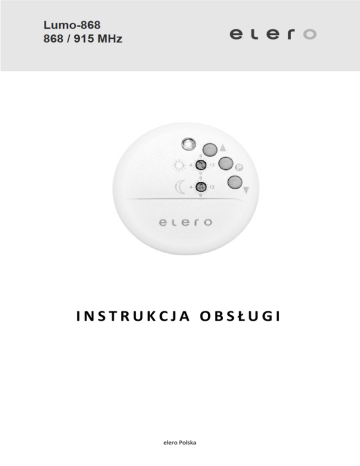 INSTRUKCJA OBSŁUGI elero Polska Spis treści 1 Informacje ogólne ........................................................................................................................ 4 1.1 Uwagi do instrukcji obsługi........................................................................................................ 4 1.2 Standardy i wskazówki .............................................................................................................. 4 1.3 Przeznaczenie ............................................................................................................................ 4 1.4 Niewłaściwe użycie możliwe do przewidzenia .......................................................................... 5 1.5 Gwarancja i odpowiedzialność .................................................................................................. 5 1.6 Obsługa klienta producenta ...................................................................................................... 5 2 Bezpieczeństwo ............................................................................................................................ 6 2.1 Ogólne informacje o bezpieczeństwie ...................................................................................... 6 2.2 Zasady bezpieczeństwa ............................................................................................................. 6 2.3 Ogólne obowiązki operatora ..................................................................................................... 6 2.4 Wymagania dotyczące personelu.............................................................................................. 7 2.5 Instrukcje bezpieczeństwa o stanie technicznym ..................................................................... 7 2.6 Wskazówki bezpieczeństwa dotyczące obsługi ......................................................................... 7 3 Opis produktu ............................................................................................................................... 8 3.1 Ogólne informacje ..................................................................................................................... 8 3.2 Objaśnienie urządzenia ............................................................................................................. 8 3.3 Cechy produktu ......................................................................................................................... 8 3.4 Wersje produktu........................................................................................................................ 8 3.5 Zakres dostawy ......................................................................................................................... 9 3.6 Specyfikacje ............................................................................................................................... 9 4 Objaśnienie funkcji ..................................................................................................................... 10 4.1 Funkcje Lumo-868 ................................................................................................................... 10 4.2 Dwukierunkowy system radiowy ............................................................................................ 10 4.3 Jednokierunkowy system radiowy .......................................................................................... 10 4.4 Jednostka grupy sterującej ...................................................................................................... 10 4.5 Uruchomienie .......................................................................................................................... 10 4.5.1 Oznaczenie stanu wskaźnika światła (LED)........................................................................... 11 4.5.2 Otwieranie Lumo-868 ........................................................................................................... 11 4.5.3 Zamykanie Lumo-868 ........................................................................................................... 11 4.5.4 Mocowanie wspornika okna ................................................................................................ 11 4.7 Ustawienie przełącznika kodu ................................................................................................. 12 4.8 Czujnik funkcji słońca i zmierzchu ........................................................................................... 13 2 elero Polska 4.8.1 Wyświetlacz i wybór trybu ................................................................................................... 13 4.8.2 Wskaźnik światła .................................................................................................................. 13 4.9 Ustawienie trybu pracy ........................................................................................................... 13 4.9.1 Funkcja ochrony słońca (przełącznik kodu 1) ....................................................................... 14 4.9.2 Funkcja zmierzchu (włącznik kodu 2) ................................................................................... 15 4.9.3 Funkcja stłuczenia szkła (przełącznik kodu 3)....................................................................... 16 4.9.4 Brak funkcji (przełącznik kodu 4) .......................................................................................... 16 4.9.5 Tryb testu.............................................................................................................................. 16 4.10 Zasilanie / wymiana baterii ................................................................................................... 17 4.11 Czyszczenie i konserwacja produktu ..................................................................................... 17 5 KE Deklaracja zgodności .....................