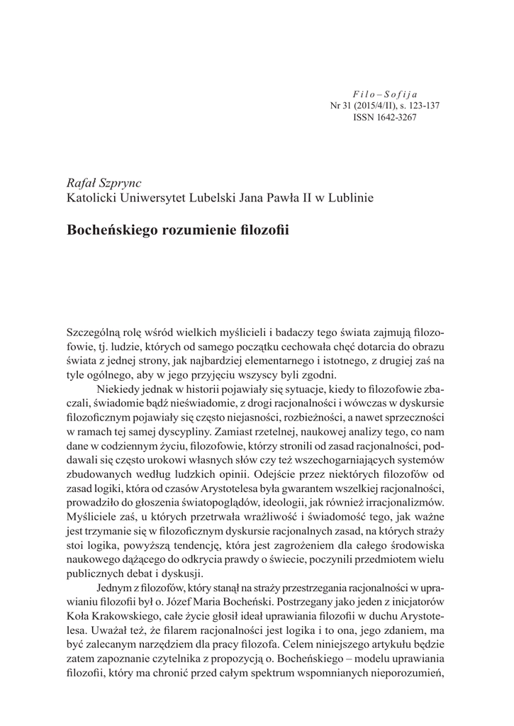 Filo– Sofija Nr 31 (2015/4/II), s. 123-137 ISSN 1642-3267 Rafał Szprync Katolicki Uniwersytet Lubelski Jana Pawła II w Lublinie Bocheńskiego rozumienie filozofii Szczególną rolę wśród wielkich myślicieli i badaczy tego świata zajmują filozofowie, tj. ludzie, których od samego początku cechowała chęć dotarcia do obrazu świata z jednej strony, jak najbardziej elementarnego i istotnego, z drugiej zaś na tyle ogólnego, aby w jego przyjęciu wszyscy byli zgodni. Niekiedy jednak w historii pojawiały się sytuacje, kiedy to filozofowie zbaczali, świadomie bądź nieświadomie, z drogi racjonalności i wówczas w dyskursie filozoficznym pojawiały się często niejasności, rozbieżności, a nawet sprzeczności w ramach tej samej dyscypliny. Zamiast rzetelnej, naukowej analizy tego, co nam dane w codziennym życiu, filozofowie, którzy stronili od zasad racjonalności, poddawali się często urokowi własnych słów czy też wszechogarniających systemów zbudowanych według ludzkich opinii. Odejście przez niektórych filozofów od zasad logiki, która od czasów Arystotelesa była gwarantem wszelkiej racjonalności, prowadziło do głoszenia światopoglądów, ideologii, jak również irracjonalizmów. Myśliciele zaś, u których przetrwała wrażliwość i świadomość tego, jak ważne jest trzymanie się w filozoficznym dyskursie racjonalnych zasad, na których straży stoi logika, powyższą tendencję, która jest zagrożeniem dla całego środowiska naukowego dążącego do odkrycia prawdy o świecie, poczynili przedmiotem wielu publicznych debat i dyskusji. Jednym z filozofów, który stanął na straży przestrzegania racjonalności w uprawianiu filozofii był o. Józef Maria Bocheński. Postrzegany jako jeden z inicjatorów Koła Krakowskiego, całe życie głosił ideał uprawiania filozofii w duchu Arystotelesa. Uważał też, że filarem racjonalności jest logika i to ona, jego zdaniem, ma być zalecanym narzędziem dla pracy filozofa. Celem niniejszego artykułu będzie zatem zapoznanie czytelnika z propozycją o. Bocheńskiego – modelu uprawiania filozofii, który ma chronić przed całym spektrum wspomnianych nieporozumień, 124 Rafał Szprync jak też zachęta dla każdego adepta filozofii do tego, aby względem poruszanych w tymże artykule zagadnień nie przyjmował postawy człowieka naiwnego. Specyfika uprawiania filozofii Podejmując próbę uchwycenia specyfiki rozumienia filozofii przez o. Józefa Bocheńskiego, należy już w pierwszym zdaniu zwrócić uwagę na absolutnie podstawową dla niego tezę, iż filozofia to przede wszystkim nauka. Dogłębna analiza zagadnienia nakazuje w tym miejscu jednak zaznaczyć, iż z czasem, Bocheński za naukową uznawał już tylko filozofię analityczną, a w zasadzie jej naukowe narzędzie, którego mianem określił logikę1. Jej charakterystyka będzie podjęta w paragrafie trzecim. Powyższe założenie posiadania przez filozofię statusu nauki może w pierwszej chwili wytworzyć pokusę szukania bliższego jej zdefiniowania w kontekście cech i właściwości ściśle przysługujących nauce jako takiej. Jednak takie rozumowanie, zdaniem ojca Bocheńskiego, byłoby błędne, gdyż filozofia to nauka, która ma co prawda cechy wspólne z innymi naukami szczegółowymi, ale posiada także swoje własne, specyficzne przymioty, czyniące z niej naukę uniwersalną. […] nie powinno się utożsamiać filozofii z żadną z nauk szczegółowych ani zawężać jej do jakiejkolwiek szczegółowej dziedziny. Filozofia jest w pewnym sensie nauką uniwersalną, jej przedmiot nie jest ograniczony, jak w innych dyscyplinach do czegoś określonego.2 Refleksja nad powyższym stwierdzeniem Bocheńskiego rodzi prima facie pytanie dotyczące podobieństw i różnic filozofii jako nauki w stosunku do innych nauk szczegółowych. Otóż niewątpliwym podobieństwem jest to, iż dość często zdarza się, że zarówno nauki szczegółowe, jak i filozofia mają wspólny przedmiot zainteresowań, na którego podstawie tworzą swoje hipotezy czy też teorie. Zatem różnica między filozofią a nauką szczegółową nie tkwi w przedmiocie, ale w metodzie i punkcie widzenia. Józef M. Bocheński stwierdza, że filozof nie powinien wahać się korzystać z każdej dostępnej mu metody poznania. Filozof nie może być zatem, np. jak fizyk, biolog bądź też przedstawiciel innej dowolnej nauki szczegółowej, zobowiązany do tego, aby sprowadzać wyniki swej pracy wyłącznie do zjawisk zmysłowo-postrzegalnych, wyłącznie do psychicznych itd., lecz powinien korzystać z wglądu w to, co dane, także za pośrednictwem innych metod. Poza tym zostało powiedziane, że filozofia różni się od innych dyscyplin własnym, specyficznym punktem widzenia. Kiedy filozof dokonuje refleksji nad 1 Por. W. Wierzejski, Światopogląd i ideologia polityczna a filozofia. O filozofii politycznej o. Józefa M. Bocheńskiego, „Filo-Sofia”, nr 21 (2013/2), s. 213; Bocheński, Powszechna Encyklopedia Filozofii (PEF), Polskie Towarzystwo Tomasza z Akwinu, Lublin 2000, t. 1, s. 607. 2 J. M. Bocheński, Ku filozoficznemu myśleniu, Antyk – Marcin Dybowski, Komorów 2009, s. 19. Bocheńskiego rozumienie filozofii 125 jakimś określonym przedmiotem, rozpatruje go zawsze i wyłącznie ze stanowiska granicznego, pod kątem jego cech podstawowych3. Gdzie inne nauki się zatrzymują, gdzie rezygnując z dalszych pytań przyjmują pewne założenia, tam filozof dopiero zaczyna pytać. Nauki poznają – on zaś pyta, czym jest poznanie; inni formułują prawa – on zaś stawia pytanie, czym jest prawo. Szarzy ludzie i politycy mówią o sensie i celowości – filozof pyta czym jest sens i cel. Dzięki temu filozofia jest nauką radykalną – w tym znaczeniu, że stara się dotrzeć do korzeni, głębiej niż jakakolwiek inna nauka; że tam gdzie inne nauki są zaspokojone, filozof chce dalej dociekać i badać.4 Chcąc wydobyć esencję z wypo