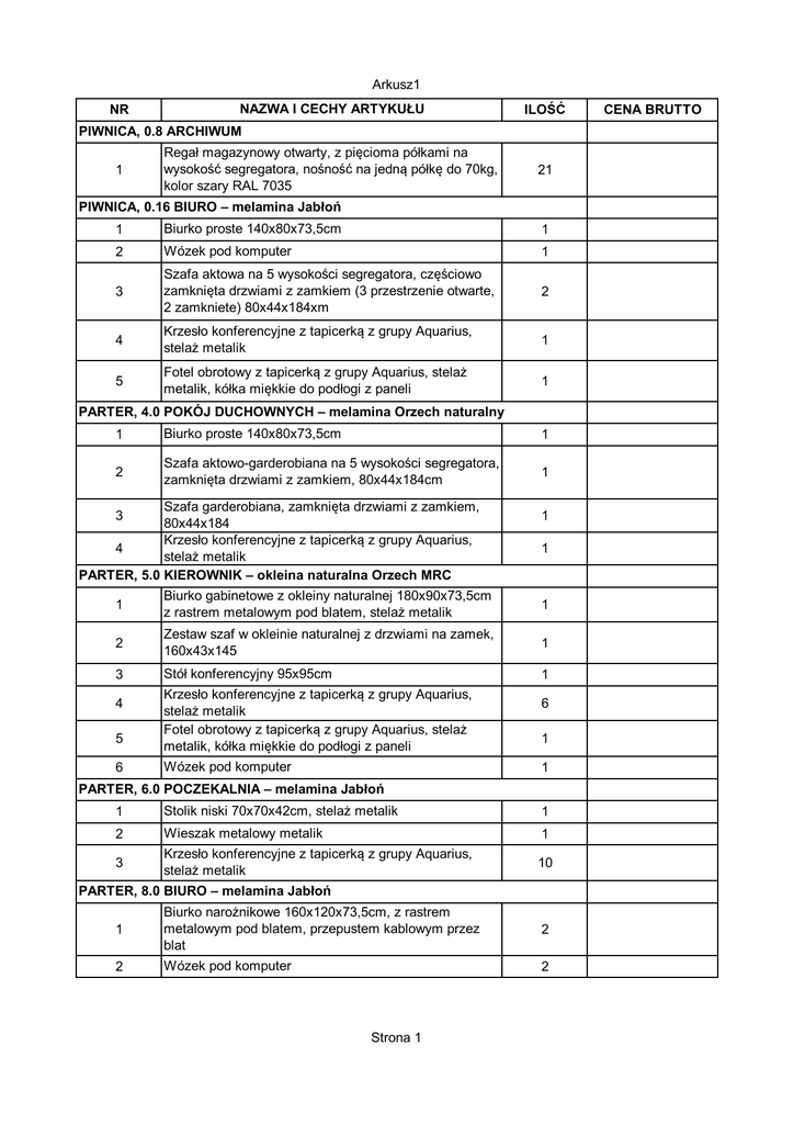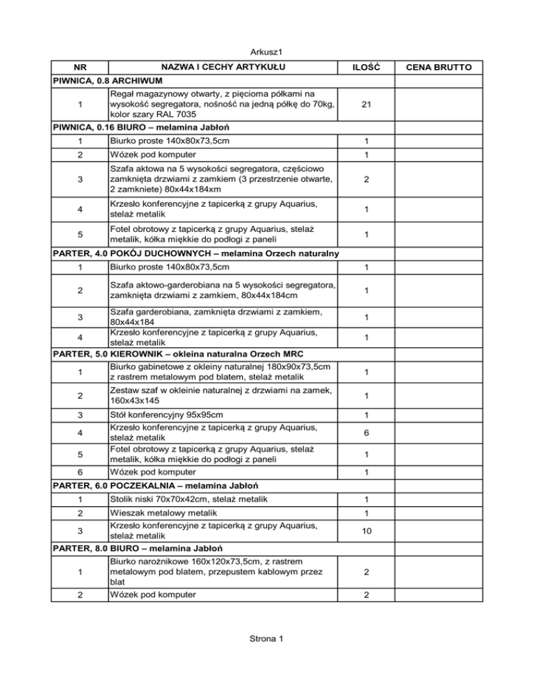 Arkusz1 NR NAZWA I CECHY ARTYKUŁU ILOŚĆ PIWNICA, 0.8 ARCHIWUM 1 Regał magazynowy otwarty, z pięcioma półkami na wysokość segregatora, nośność na jedną półkę do 70kg, kolor szary RAL 7035 21 PIWNICA, 0.16 BIURO – melamina Jabłoń 1 Biurko proste 140x80x73,5cm 1 2 Wózek pod komputer 1 3 Szafa aktowa na 5 wysokości segregatora, częściowo zamknięta drzwiami z zamkiem (3 przestrzenie otwarte, 2 zamkniete) 80x44x184xm 2 4 Krzesło konferencyjne z tapicerką z grupy Aquarius, stelaż metalik 1 5 Fotel obrotowy z tapicerką z grupy Aquarius, stelaż metalik, kółka miękkie do podłogi z paneli 1 PARTER, 4.0 POKÓJ DUCHOWNYCH – melamina Orzech naturalny 1 Biurko proste 140x80x73,5cm 1 2 Szafa aktowo-garderobiana na 5 wysokości segregatora, zamknięta drzwiami z zamkiem, 80x44x184cm 1 Szafa garderobiana, zamknięta drzwiami z zamkiem, 80x44x184 Krzesło konferencyjne z tapicerką z grupy Aquarius, 4 stelaż metalik PARTER, 5.0 KIEROWNIK – okleina naturalna Orzech MRC 3 1 1 1 Biurko gabinetowe z okleiny naturalnej 180x90x73,5cm z rastrem metalowym pod blatem, stelaż metalik 1 2 Zestaw szaf w okleinie naturalnej z drzwiami na zamek, 160x43x145 1 3 Stół konferencyjny 95x95cm 1 4 5 6 Krzesło konferencyjne z tapicerką z grupy Aquarius, stelaż metalik Fotel obrotowy z tapicerką z grupy Aquarius, stelaż metalik, kółka miękkie do podłogi z paneli Wózek pod komputer 6 1 1 PARTER, 6.0 POCZEKALNIA – melamina Jabłoń 1 Stolik niski 70x70x42cm, stelaż metalik 1 2 Wieszak metalowy metalik 1 3 Krzesło konferencyjne z tapicerką z grupy Aquarius, stelaż metalik 10 PARTER, 8.0 BIURO – melamina Jabłoń 1 Biurko narożnikowe 160x120x73,5cm, z rastrem metalowym pod blatem, przepustem kablowym przez blat 2 2 Wózek pod komputer 2 Strona 1 CENA BRUTTO Arkusz1 3 Kontener dostawiany do wysokości blatu, 4 szuflady z zamkiem centralnym, piórnik nakładany na pierwszą szufladę 2 4 Szafa aktowa na 5 wysokości segregatora, częściowo zamknięta drzwiami z zamkiem (3 przestrzenie otwarte, 2 zamkniete) 80x44x184xm 4 5 Krzesło konferencyjne z tapicerką z grupy Aquarius, stelaż metalik 2 6 Fotel obrotowy z tapicerką z grupy Aquarius, stelaż metalik, kółka miękkie do podłogi z paneli 2 PARTER, 13,0 – POMIESZCZENIE NA WIEŃCE 1 Wieszaki na wieńce mocowane na ścianie 4 PARTER, 17,0 – SZATNIA 1 Szafki trójdzielne na ubrania robocze kolor beż ( typ Sum 331W lub równoważne) 6 2 Szafki dwudzielne na ubrania robocze metalowe kolor beż ( typ Sum 321W lub równoważne) 2 3 Ławka z wieszakiem na 5 osób - siedzisko drewniane (buk) stelaż metalowy kolor beż ( typ Łsz1a lub równoważny) 1 4 Ławka na 5 osób - siedzisko drewniane (buk) stelaż metalowy w kolorze beż ( typ Łsz3a lub równoważna) 1 PARTER, 20,0 – POMIESZCZENIE SOCJALNE DLA PRACOWNIKÓW 1 Meble kuchenne stojące i wiszące o dł. do 3,0 mb białe) , bez obudowy pod zlewozmywak 2 Stół kuchenny na 10 osób - blat biały, stelaż metalowy malowany na biało 1 3 Krzesła - siedzisko białe, stelaż metalowy malowany na biało 10 WARTOŚĆ OGÓŁEM Strona 2 ( 1 kpl Arkusz1 Strona 3 Arkusz1 Strona 4