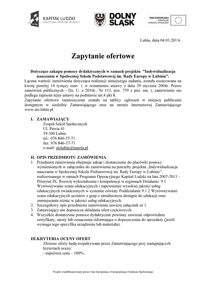 Zapytanie ofertowe - Zespół Szkół Społecznych w Lubinie