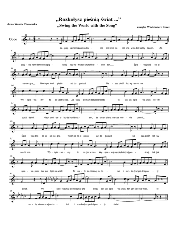 „Rozkołysz pieśnią świat ...” słowa Wanda Chotomska „Swing the World with the Song” Za − graj − cie nam dzwony od se − graj − cie nam dzwony najpię − se−rce gra__ Niech po le−ci Wy − śpie − wa − my budzi dzień. Śpie − waj dziś to świat. roz−ko − łyszcie wszystkie je pieśń aż do co jest w nas. co ci se−rce gra, wa ptak, tak jak śpie−wa wiatr. Wy − tem, to te, aż do co jest w nas. ściej, i roz− ko−łysz pie−śnią ca da gwiazd. pieśń _ Na Wy − śpie − waj naj−pię−kniej naj−pro − ści − − sza pieśń lot wy − ściej, i roz − ko−łysz pie−śnią ca tak jak śpie − wa ptak, tak jak śpie−wa wiatr. − ły co ci tak jak śpie − wa ptak kie − dy ta skrzy− dla−ta na−sza mło − Te nu − ty sło−necznej ra− do ści Śpie − waj dziś Za− − sza pieśń lot wy −so −ki ma. Za − graj − cie nam skrzypce skrzydla − śpie − waj naj−pię−kniej naj−pro − nu − ty sło−necznej ra−do − den ton___ Na niech po −le−ci pieśń Wy − śpie − wa − my − sre−brne se − rce ma w so−bie każdy dzwon. gwiazd. Niech słoń − ce o bu−dzi nad świa − so − ki ma. śpie − kniej rca muzyka Włodzimierz Korcz świat tak jak − ły Te