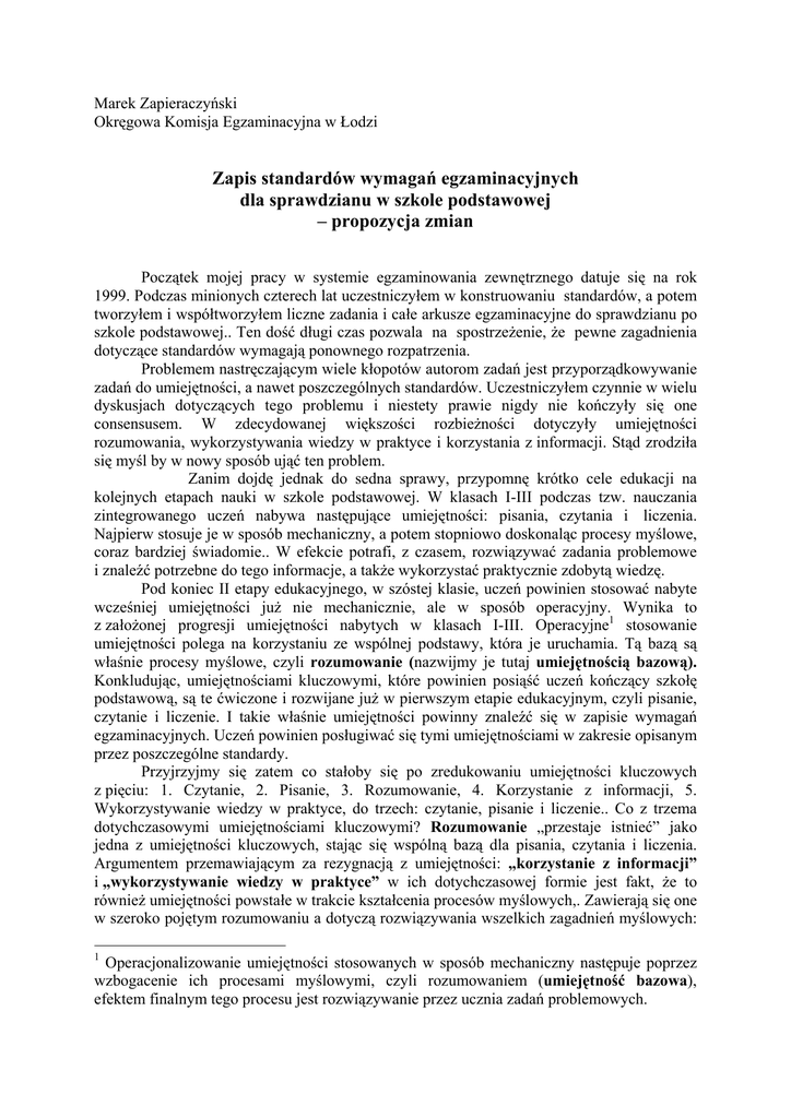 Marek Zapieraczyński Okręgowa Komisja Egzaminacyjna w Łodzi Zapis standardów wymagań egzaminacyjnych dla sprawdzianu w szkole podstawowej – propozycja zmian Początek mojej pracy w systemie egzaminowania zewnętrznego datuje się na rok 1999. Podczas minionych czterech lat uczestniczyłem w konstruowaniu standardów, a potem tworzyłem i współtworzyłem liczne zadania i całe arkusze egzaminacyjne do sprawdzianu po szkole podstawowej.. Ten dość długi czas pozwala na spostrzeżenie, że pewne zagadnienia dotyczące standardów wymagają ponownego rozpatrzenia. Problemem nastręczającym wiele kłopotów autorom zadań jest przyporządkowywanie zadań do umiejętności, a nawet poszczególnych standardów. Uczestniczyłem czynnie w wielu dyskusjach dotyczących tego problemu i niestety prawie nigdy nie kończyły się one consensusem. W zdecydowanej większości rozbieżności dotyczyły umiejętności rozumowania, wykorzystywania wiedzy w praktyce i korzystania z informacji. Stąd zrodziła się myśl by w nowy sposób ująć ten problem. Zanim dojdę jednak do sedna sprawy, przypomnę krótko cele edukacji na kolejnych etapach nauki w szkole podstawowej. W klasach I-III podczas tzw. nauczania zintegrowanego uczeń nabywa następujące umiejętności: pisania, czytania i liczenia. Najpierw stosuje je w sposób mechaniczny, a potem stopniowo doskonaląc procesy myślowe, coraz bardziej świadomie.. W efekcie potrafi, z czasem, rozwiązywać zadania problemowe i znaleźć potrzebne do tego informacje, a także wykorzystać praktycznie zdobytą wiedzę. Pod koniec II etapy edukacyjnego, w szóstej klasie, uczeń powinien stosować nabyte wcześniej umiejętności już nie mechanicznie, ale w sposób operacyjny. Wynika to z założonej progresji umiejętności nabytych w klasach I-III. Operacyjne1 stosowanie umiejętności polega na korzystaniu ze wspólnej podstawy, która je uruchamia. Tą bazą są właśnie procesy myślowe, czyli rozumowanie (nazwijmy je tutaj umiejętnością bazową). Konkludując, umiejętnościami kluczowymi, które powinien posiąść uczeń kończący szkołę podstawową, są te ćwiczone i rozwijane już w pierwszym etapie edukacyjnym, czyli pisanie, czytanie i liczenie. I takie właśnie umiejętności powinny znaleźć się w zapisie wymagań egzaminacyjnych. Uczeń powinien posługiwać się tymi umiejętnościami w zakresie opisanym przez poszczególne standardy. Przyjrzyjmy się zatem co stałoby się po zredukowaniu umiejętności kluczowych z pięciu: 1. Czytanie, 2. Pisanie, 3. Rozumowanie, 4. Korzystanie z informacji, 5. Wykorzystywanie wiedzy w praktyce, do trzech: czytanie, pisanie i liczenie.. Co z trzema dotychczasowymi umiejętnościami kluczowymi? Rozumowanie „przestaje istnieć” jako jedna z umiejętności kluczowych, stając się wspólną bazą dla pisania, czytania i liczenia. Argumentem przemawiającym za rezygnacją z umiejętności: „korzystanie z informacji” i „wykorzystywanie wiedzy w praktyce” w ich dotychczasowej formie jest fakt, że to również umiejętności powstałe w trakcie kształcenia procesów myślowych,. Zawierają się one w szeroko pojętym rozumowaniu a dotyczą rozwiązywania wszelkich zagadnień myślowych: 1 Operacjonalizowanie umiejętności stosowanych w sposób mechaniczny następuje poprzez wzbogacenie ich procesami myślowymi, czyli rozumowaniem (umiejętność bazowa), efektem finalnym tego procesu jest rozwiązywanie przez ucznia zadań problemowych. wnioskowania, dowodzenia, wyjaśniania, interpretowania i stosowania odpowiedniej wiedzy... Ich wyodrębnienie przez twórców standardów wymagań egzaminacyjnych wynikało z chęci wskazania kierunku, w jakim należy operacjonalizować umiejętności kluczowe. Zatem wykreślone przeze mnie trzy umiejętności kluczowe tworzą szeroką bazę operacyjną dla : czytania, pisania i liczenia. Tą podstawą jest szerzej ujmowane rozumowanie. Idąc dalej tym tokiem myślenia można sobie wyobrazić korektę standardów polegającą na przeniesieniu ich do nowych umiejętności. Proponuję następujący zmiany w zapisie standardów wymagań dla uczniów szkoły podstawowej: 1. Standardy opisujące umiejętność „rozumowanie”. 3.2 - uczeń przedstawia przyczyny i skutki wydarzeń i zjawisk: a) domyśla się przyczyn, przewiduje skutki wydarzeń bliskich życiu i swoim doświadczeniom, b) wskazuje główne przyczyny i skutki doniosłych wydarzeń w historii Polski, c) wyjaśnia przyczyny i skutki zmian, które zachodzą w środowisku w wyniku działalności człowieka, 3.3 – uczeń określa znaczenie osiągnięć człowieka dla rozwoju cywilizacyjnego: a) wyjaśnia na prostych przykładach zmiany cywilizacyjne, jakie nastąpiły na przestrzeni dziejów, b) opisuje najważniejsze osiągnięcia, które składają się na polskie dziedzictwo kulturowe 3.4 - uczeń wyraża własne opinie i próbuje je uzasadnić wyjaśniając swoje stanowisko, używa odpowiednich argumentów, powinny obrazować umiejętność „pisania”, wynika to z ich konstrukcji implikującej potrzebę dłuższej wypowiedzi. Podobnie rzecz ma się ze standardem: 3.7 – uczeń dostrzega prawidłowości, opisuje je i sprawdza na przykładach: a) opisuje zjawiska o charakterze powtarzalnym spotykane w najbliższym otoczeniu, b) na podstawie opisu zjawiska mającego charakter prawidłowości wnioskuje o dalszym jego przebiegu, wymaga on jednak doprecyzowania (wydaje się, że jest tu miejsce na treści przyrodnicze) Zadanie rozszerzonej odpowiedzi (RO) o treściach polonistycznych zdobyło już sobie poczesne miejsce w sprawdzianie, jego prawidłowe rozwiązanie może przynieść uczniowi nawet 25% możliwych do zdobycia punktów. Przesunięcie wspomnianych wyżej standardów spowoduje wyraźniejsze ukazanie możliwości konstruowania zadań RO o treściach przedmiotowych innych niż wyłącznie polonistyczne. Pozostałe standardy przypisane dotychczas rozumowaniu opisują w za