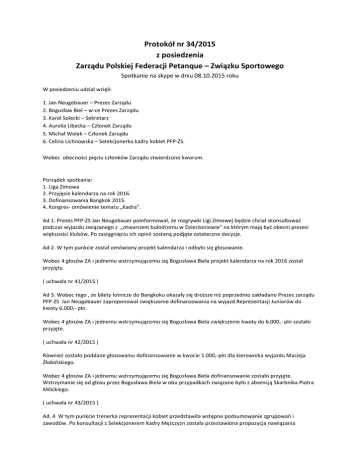 Protokół nr 34/2015 z posiedzenia Zarządu Polskiej Federacji Petanque – Związku Sportowego Spotkanie na skype w dniu 08.10.2015 roku W posiedzeniu udział wzięli: 1. Jan Neugebauer – Prezes Zarządu 2. Bogusław Biel – w-ce Prezes Zarządu 3. Karol Solecki – Sekretarz 4. Aurelia Libecka – Członek Zarządu 5. Michał Wolak – Członek Zarządu 6. Celina Lichnowska – Selekcjonerka kadry kobiet PFP-ZS. Wobec obecności pięciu członków Zarządu stwierdzono kworum. Porządek spotkania: 1. Liga Zimowa 2. Przyjęcie kalendarza na rok 2016. 3. Dofinansowania Bangkok 2015. 4. Kongres- omówienie tematu „Kadra”. Ad 1. Prezes PFP-ZS Jan Neugebauer poinformował, że rozgrywki Ligi Zimowej będzie chciał skonsultować podczas wyjazdu związanego z „otwarciem bulodromu w Dzierżoniowie” na którym mają być obecni prezesi większości klubów. Po zasięgnięciu ich opinii zostaną podjęte ostateczne decyzje. Ad 2. W tym punkcie został omówiony projekt kalendarza i odbyło się głosowanie. Wobec 4 głosów ZA i jednemu wstrzymującemu się Bogusława Biela projekt kalendarza na rok 2016 został przyjęty. ( uchwała nr 41/2015 ) Ad 3. Wobec tego , że bilety lotnicze do Bangkoku okazały się droższe niż poprzednio zakładano Prezes zarządu PFP-ZS Jan Neugebauer zaproponował zwiększenie dofinansowania na wyjazd Reprezentacji Juniorów do kwoty 6.000,- pln. Wobec 4 głosów ZA i jednemu wstrzymującemu się Bogusława Biela zwiększenie kwoty do 6.000,- pln zostało przyjęte. ( uchwała nr 42/2015 ) Również zostało poddane głosowaniu dofinansowanie w kwocie 1.000,-pln dla kierownika wyjazdu Macieja Żłobińskiego. Wobec 4 głosów ZA i jednemu wstrzymującemu się Bogusława Biela dofinansowanie zostało przyjęte. Wstrzymanie się od głosu przez Bogusława Biela w obu przypadkach związane było z absencją Skarbnika Piotra Milickiego. ( uchwała nr 43/2015 ) Ad. 4 W tym punkcie trenerka reprezentacji kobiet przedstawiła wstępne podsumowanie zgrupowań i zawodów. Po konsultacji z Selekcjonerem Kadry Mężczyzn została przestawiona propozycja nawiązania współpracy z psychologiem sportowym. Opierając się na obserwacjach startów naszych zawodników jak również innych dyscyplin sportowych taka współpraca mogłaby przyczynić się do osiągania lepszych wyników na arenie międzynarodowej. Wkrótce zostaną przedstawione dokładne założenia takiej współpracy tzn. ilość spotkań, koszta itd… Na tym posiedzenie zakończono. Sekretarz Karol Solecki Prezes PFP Jan Neugebauer