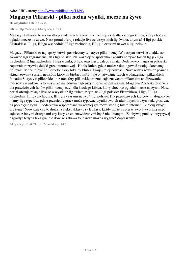 Adres URL strony http://www.publikuj.org/11893 Magazyn Piłkarski - piłka nożna wyniki, mecze na żywo ID artykułu: 11893 / 2036 URL: http://www.publikuj.org/11893 Magazyn Piłkarski to serwis dla prawdziwych fanów piłki nożnej, czyli dla każdego kibica, który choć raz oglądał mecze na żywo. Nasz portal oferuje relacje live ze wszystkich lig świata, z tym aż 4 ligi polskie: Ekstraklasa, I liga, II liga wschodnia, II liga zachodnia, III ligi i czasami nawet 4 ligi polskie. Magazyn Piłkarski to najlepszy serwis poświęcony tematyce piłki nożnej. W naszym serwisie znajdziesz zarówno ligi zagraniczne jak i ligi polskie. Najważniejsze spotkania i wyniki na żywo takich lig jak liga wschodnia, 2 liga zachodnia, I liga wyniki, 3 liga, oraz ligi z całego świata. Dodatkowo magazyn piłkarski zapewnia rozrywkę dzięki grze internetowej - Hools Rulez, gdzie możesz dopingować swojej ukochanej drużynie. Może to być Fc Barcelona czy lokalny klub z Twojej miejscowości. Nasz serwis również posiada aktualizowany system newsów, który na bieżąco informuje o najważniejszych wydarzeniach piłkarskich. Ponadto Statystyki piłkarskie oraz transfery piłkarskie urozmaicają znawcom piłkarskim analizowanie meczów i wyników, a to wszystko na jednym najlepszym serwisie piłkarskim. Magazyn Piłkarski to serwis dla prawdziwych fanów piłki nożnej, czyli dla każdego kibica, który choć raz oglądał mecze na żywo. Nasz portal oferuje relacje live ze wszystkich lig świata, z tym aż 4 ligi polskie: Ekstraklasa, I liga, II liga wschodnia, II liga zachodnia, III ligi i czasami nawet 4 ligi polskie. Dla prawdziwych kibiców i nałogowców mamy ligę typerów, gdzie przeciętny gracz może typować wyniki swoich ulubionych drużyn bądź głosować na potknięcia rywali, dodatkowo wspomniana wcześniej gra może stać się hitem internetu! kibicuj swojej drużynie! Nieważne czy to drużyna z ekstraklasy czy B klasy, każdy może wspierać swoją wybraną mieć sojusze z innymi drużynami czy kosy ze znienawidzonymi bądź nielubianymi. Zdobywaj punkty i wygrywaj nagrody! Jedyna taka gra, nie dość że zabawa to jeszcze można wygrać! Zapraszamy Aktywacja: 23/02/11 09:22, odsłony: 1470 Strona 1 / 1
