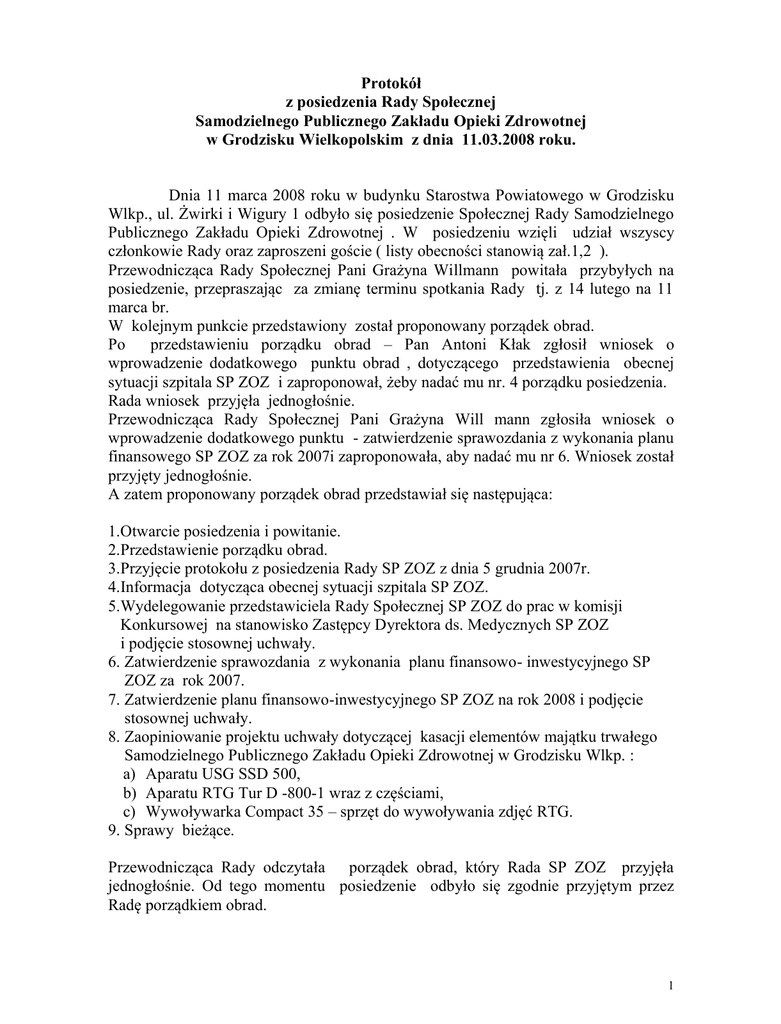 Protokół z posiedzenia Rady Społecznej Samodzielnego Publicznego Zakładu Opieki Zdrowotnej w Grodzisku Wielkopolskim z dnia 11.03.2008 roku. Dnia 11 marca 2008 roku w budynku Starostwa Powiatowego w Grodzisku Wlkp., ul. Żwirki i Wigury 1 odbyło się posiedzenie Społecznej Rady Samodzielnego Publicznego Zakładu Opieki Zdrowotnej . W posiedzeniu wzięli udział wszyscy członkowie Rady oraz zaproszeni goście ( listy obecności stanowią zał.1,2 ). Przewodnicząca Rady Społecznej Pani Grażyna Willmann powitała przybyłych na posiedzenie, przepraszając za zmianę terminu spotkania Rady tj. z 14 lutego na 11 marca br. W kolejnym punkcie przedstawiony został proponowany porządek obrad. Po przedstawieniu porządku obrad – Pan Antoni Kłak zgłosił wniosek o wprowadzenie dodatkowego punktu obrad , dotyczącego przedstawienia obecnej sytuacji szpitala SP ZOZ i zaproponował, żeby nadać mu nr. 4 porządku posiedzenia. Rada wniosek przyjęła jednogłośnie. Przewodnicząca Rady Społecznej Pani Grażyna Will mann zgłosiła wniosek o wprowadzenie dodatkowego punktu - zatwierdzenie sprawozdania z wykonania planu finansowego SP ZOZ za rok 2007i zaproponowała, aby nadać mu nr 6. Wniosek został przyjęty jednogłośnie. A zatem proponowany porządek obrad przedstawiał się następująca: 1.Otwarcie posiedzenia i powitanie. 2.Przedstawienie porządku obrad. 3.Przyjęcie protokołu z posiedzenia Rady SP ZOZ z dnia 5 grudnia 2007r. 4.Informacja dotycząca obecnej sytuacji szpitala SP ZOZ. 5.Wydelegowanie przedstawiciela Rady Społecznej SP ZOZ do prac w komisji Konkursowej na stanowisko Zastępcy Dyrektora ds. Medycznych SP ZOZ i podjęcie stosownej uchwały. 6. Zatwierdzenie sprawozdania z wykonania planu finansowo- inwestycyjnego SP ZOZ za rok 2007. 7. Zatwierdzenie planu finansowo-inwestycyjnego SP ZOZ na rok 2008 i podjęcie stosownej uchwały. 8. Zaopiniowanie projektu uchwały dotyczącej kasacji elementów majątku trwałego Samodzielnego Publicznego Zakładu Opieki Zdrowotnej w Grodzisku Wlkp. : a) Aparatu USG SSD 500, b) Aparatu RTG Tur D -800-1 wraz z częściami, c) Wywoływarka Compact 35 – sprzęt do wywoływania zdjęć RTG. 9. Sprawy bieżące. Przewodnicząca Rady odczytała porządek obrad, który Rada SP ZOZ przyjęła jednogłośnie. Od tego momentu posiedzenie odbyło się zgodnie przyjętym przez Radę porządkiem obrad. 1 W dalszej części posiedzenia przewodnicząca Rady wystąpiła o przyjęcie protokołu posiedzenia z dnia 5 grudnia 2007 roku. Mając na uwadze fakt, iż jest on publikowany na stronie internetowej Starostwa – BIP oraz braku zgłoszonych do protokołu uwag zaproponowała jego przyjęcie przez głosowanie. Protokół został przyjęty jednogłośnie. ad.4 W kolejnym punkcie posiedzenia przewodnicząca przedstawiła wszystkim zebranym sytuację szpitala SP ZOZ. Dnia 28 grudnia 2007 roku dotychczasowy Dyrektor SP ZOZ – Pani Barbara Rożyńska – Szumska złożyła wypowiedzenie ze stanowiska Dyrektora z zachowaniem 6- miesięcznego okresu wypowiedzenia. Z początkiem stycznia 2008 roku złożyła do Zarządu Powiatu prośbę o skrócenie terminu wypowiedzenia i rozwiązanie stosunku pracy z dniem 15 stycznia 2008 roku na zasadzie porozumienia stron. Jako uzasadnienie podała fakt, że zamierza kontynuować swoje zatrudnienia na stanowisku ordynatora oddziału noworodkowego. Zarząd przychylił się do prośby Pani Dyrektor i rozwiązał stosunek pracy z dniem 15 stycznia 2008 roku. Dnia 16 stycznia Zarząd powierzył funkcję Dyrektora SP ZOZ Panu Zbigniewowi Heydrychowi, który spełniał wszystkie wymogi formalne do objęcia tej funkcji i zarządzania Samodzielnym Publicznym Zakładem Opieki Zdrowotnej .Powołany na to stanowisko Dyrektor po miesiącu czasu złożył wypowiedzenie z zachowaniem 3 - miesięcznego okresu wypowiedzenia. W chwili obecnej Dyrektor SP ZOZ przebywa na zwolnieniu lekarskim, które trwa od 5 marca . W dniu dzisiejszym Zarząd podjął decyzję o rozpisaniu konkursu na stanowisko Dyrektora Szpitala, który zostanie rozstrzygnięty w połowie miesiąca kwietnia. Po tych wyjaśnieniach rozpoczęła się dyskusja. Członek Rady Pan Marek Kinecki – jakie argumenty przedstawił Dyrektor przy zwolnieniu ?. Pani Przewodnicząca Rady Grażyna Willmann – roszczenia finansowe pracowników oraz nie przekazanie szpitala protokołem zdawczo - odbiorczym. Pytanie Członka Rady Pana Antoniego Kłaka skierowane do Pana Józefa Jerzego Sieradzana : Czy przejmując Urząd Burmistrza przejmował Pan wszystko spisem inwentarza? Członek Rady Józef Jerzy Sieradzan - Tak. Członek Rady Pan Józef Jerzy Sieradzan – W szpitalu musi być Dyrektor i Jego zastępca. To, że nasz szpital nie ma zastępcy dyrektora, był to też błąd Rady Społecznej. Członek Rady Pan Piotr Halasz - jak Zarząd widzi możliwość funkcjonowania SP ZOZ – jako spółka ze 100% udziałem Powiatu. Przewodnicząca Rady Grażyna Willmann – na dzień dzisiejszy szpital musi być stabilny. Członek Rady Pan Józef Jerzy Sieradzan – obserwuje się co raz częstsze zjawisko zainteresowania kapitału niemieckiego wykupem instytucji służby zdrowia. Członek Rady Pan Antoni Kłak – podkreśla brak punktów w obecnym porządku obrad w stosunku do poprzedniego zaproszenia tj. z dnia 14 lutego 2008r., a mianowicie: - brak urzędującego Dyrektora na Radzie Społecznej , tym samym brak 2 możliwości rozmowy z Dyrektorem, - zwolnienie lekarskie było sygnalizowane na Sesji Rady Powiatu, - na posiedzenie Rady złożone zostały bardzo ważne dokumenty brak podpisu Dyrektora – nie wiadomo o co chodzi ?. Odpowiedź : Przewodnicząca Rady Grażyna Willmann - Zgodnie ze Statutem w razie nieobecności Dyrektora obowiązki pełni Pełnomocnika ds. Zarządzania Jakością . A w razie jego nieobecności - Główny Księgowy lub inna osoba wyznaczona przez dyrektora. Co do zwolnienia lekarskiego Starosta był informowany telefonicznie, natomiast zwolnienie lek