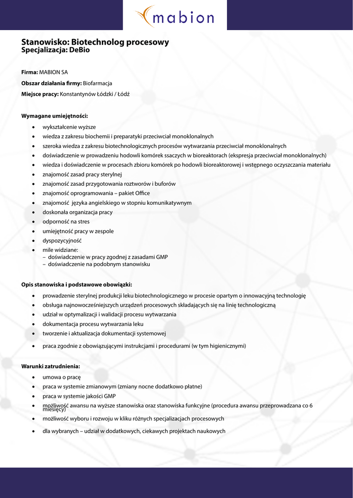 Stanowisko: Biotechnolog procesowy Specjalizacja: DeBio Firma: MABION SA Obszar działania firmy: Biofarmacja Miejsce pracy: Konstantynów Łódzki / Łódź Wymagane umiejętności: • wykształcenie wyższe • wiedza z zakresu biochemii i preparatyki przeciwciał monoklonalnych • szeroka wiedza z zakresu biotechnologicznych procesów wytwarzania przeciwciał monoklonalnych • doświadczenie w prowadzeniu hodowli komórek ssaczych w bioreaktorach (ekspresja przeciwciał monoklonalnych) • wiedza i doświadczenie w procesach zbioru komórek po hodowli bioreaktorowej i wstępnego oczyszczania materiału • znajomość zasad pracy sterylnej • znajomość zasad przygotowania roztworów i buforów • znajomość oprogramowania – pakiet Office • znajomość języka angielskiego w stopniu komunikatywnym • doskonała organizacja pracy • odporność na stres • umiejętność pracy w zespole • dyspozycyjność • mile widziane: – doświadczenie w pracy zgodnej z zasadami GMP – doświadczenie na podobnym stanowisku Opis stanowiska i podstawowe obowiązki: • prowadzenie sterylnej produkcji leku biotechnologicznego w procesie opartym o innowacyjną technologię • obsługa najnowocześniejszych urządzeń procesowych składających się na linię technologiczną • udział w optymalizacji i walidacji procesu wytwarzania • dokumentacja procesu wytwarzania leku • tworzenie i aktualizacja dokumentacji systemowej • praca zgodnie z obowiązującymi instrukcjami i procedurami (w tym higienicznymi) Warunki zatrudnienia: • umowa o pracę • praca w systemie zmianowym (zmiany nocne dodatkowo płatne) • praca w systemie jakości GMP • możliwość awansu na wyższe stanowiska oraz stanowiska funkcyjne (procedura awansu przeprowadzana co 6 miesięcy) • możliwość wyboru i rozwoju w kliku różnych specjalizacjach procesowych • dla wybranych – udział w dodatkowych, ciekawych projektach naukowych Wymogi formalne zgłoszenia: CV ze zdjęciem, list motywacyjny, format tytułu maila: NAZWISKO_IMIĘ_ETAT Prosimy o dopisanie następującej klauzuli: „Wyrażam zgodę na przetwarzanie moich danych osobowych zawartych w ofercie pracy dla potrzeb niezbędnych do realizacji procesu rekrutacji (zgodnie z Ustawą z dnia 29.08.97 r. o Ochronie Danych Osobowych DzU nr 133 poz. 833)” Termin składania zgłoszeń drogą e-mailową: 12.01.2017 r. (I termin) i 23.02.2017 r. (II termin) Spotkanie rekrutacyjne odbędzie się: 20.01.2017 r. (I termin) i 02.03.2017 r. (II termin) Nadesłanie zgłoszenia jest potwierdzeniem dyspozycyjności w ww. terminach. Zastrzegamy sobie prawo do kontaktu tylko z wybranymi osobami. Kontakt: [email protected] ul. gen. Mariana Langiewicza 60 95-050 Konstantynów Łódzki http://www.mabion.eu