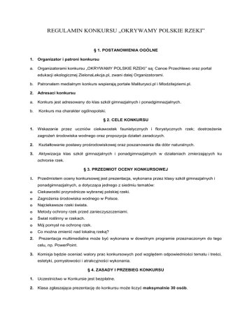 REGULAMIN KONKURSU „OKRYWAMY POLSKIE RZEKI” § 1. POSTANOWIENIA OGÓLNE 1. Organizator i patroni konkursu a. Organizatorami konkursu „OKRYWAMY POLSKIE RZEKI” są: Canoe Przechlewo oraz portal edukacji ekologicznej ZielonaLekcja.pl, zwani dalej Organizatorami. b. Patronatem medialnym konkurs wspierają portale Maliturysci.pl i Mlodzitejziemi.pl. 2. Adresaci konkursu a. Konkurs jest adresowany do klas szkół gimnazjalnych i ponadgimnazjalnych. b. Konkurs ma charakter ogólnopolski. § 2. CELE KONKURSU 1. Wskazanie przez uczniów ciekawostek faunistycznych i florystycznych rzek; dostrzeżenie zagrożeń środowiska wodnego oraz propozycja działań zaradczych. 2. Kształtowanie postawy prośrodowiskowej oraz poszanowania dla dóbr naturalnych. 3. Aktywizacja klas szkół gimnazjalnych i ponadgimnazjalnych w działaniach zmierzających ku ochronie rzek. § 3. PRZEDMIOT OCENY KONKURSOWEJ 1. Przedmiotem oceny konkursowej jest prezentacja, wykonana przez klasy szkół gimnazjalnych i ponadgimnazjalnych, a dotycząca jednego z siedmiu tematów: o Ciekawostki przyrodnicze wybranej polskiej rzeki. o Zagrożenia środowiska wodnego w Polsce. o Najciekawsze rzeki świata. o Metody ochrony rzek przed zanieczyszczeniami. o Świat roślinny w rzekach. o Mój pomysł na ochronę rzek. o Co można zmienić nad lokalną rzeką? 2. Prezentacja multimedialna może być wykonana w dowolnym programie przeznaczonym do tego celu, np. PowerPoint. 3. Komisja będzie oceniać walory prac konkursowych pod względem odpowiedniości tematu i treści, estetyki, pomysłowości i atrakcyjności wykonania. § 4. ZASADY I PRZEBIEG KONKURSU 1. Uczestnictwo w Konkursie jest bezpłatne. 2. Klasa zgłaszająca prezentację do konkursu może liczyć maksymalnie 30 osób. 3. Zgłoszona może być praca wykonana wyłącznie na cele konkursu, którego dotyczy niniejszy regulamin. Zgłoszenia dokonuje dyrektor szkoły lub nauczyciel z upoważnienia dyrektora szkoły. 4. Praca konkursowa powinna być na pierwszym slajdzie opatrzona metryczką (nazwa szkoły, miejscowość, imię i nazwisko opiekuna, nazwa klasy). 5. Wraz z pracą konkursową należy dostarczyć kartę zgłoszenia. Prace bez podpisanej Karty Zgłoszenia nie będą oceniane. 6. Przesyłanie prac konkursowych wraz ze skanem podpisanej karty zgłoszenia i oświadczenia dyrektora powinno nastąpić do 25 maja 2010 r. (liczy się data stempla pocztowego) na adres: [email protected], w temacie proszę wpisać: Odkrywamy polskie rzeki. 7. Prace oceni Komisja Konkursowa powołana przez oraz portal ZielonaLekcja.pl i Canoe Przechlewo. 8. Zostaną wyłonieni laureaci miejsc I, II i III. 9. Klasie, która zajmie miejsce I zostanie przyznana główna nagroda. Laureaci miejsca II i III otrzymają nagrody pocieszenia. Szkołom klas, które zwyciężą rywalizację zostaną przekazane dyplomy. Opiekunom – nauczycielom zgłaszającym się z klasami, zostaną przekazane zaświadczenia o udziale. 10. Wyniki zostaną ogłoszone na stronach internetowych organizatorów. § 5. SPOSÓB I TERMIN OGŁOSZENIA WYNIKÓW 1. Rozstrzygniecie konkursu nastąpi najpóźniej 31 maja 2010 r. 2. Wyniki konkursu będą podane do wiadomości uczestników konkursu na stronie internetowej www.zielonalekcja.pl 3. Laureaci zostaną powiadomieni telefonicznie lub przez pocztę elektroniczną e-mail. § 6. NAGRODY 1. Laureaci konkursu otrzymają dyplom oraz nagrodę. 2. Sponsorami nagród są: - Canoe Przechlewo (nagroda główna: organizacja jednodniowego spływu kajakowego dla zwycięskiej klasy) - Wydawnictwo LektorKlett Sp. z o.o. (nagrody pocieszenia: książki dla laureatów II i III miejsca) § 7. UWAGI KOŃCOWE 1. Wyniki konkursu zatwierdzone przez Komisję Konkursową są ostateczne. Nie przysługuje odwołanie od decyzji Komisji Konkursowej. 2. Nagrodzone i wyróżnione prace przechodzą na własność Organizatora. Prace zgłoszone do konkursu nie będą zwracane autorom. Równocześnie dopuszcza się możliwość zwrotu w szczególnych przypadkach, na wniosek autora. 3. Organizator zastrzega sobie prawo do bezpłatnego korzystania z prac konkursowych, a szczególnie ich publikowania na stronach internetowych Organizatorów i Patronów Konkursu. 4. Nadesłanie prac na Konkurs jest jednoznaczne z uznaniem niniejszego Regulaminu oraz wyrażeniem zgody na publikowanie danych osobowych Abrys Sp. z o.o. i Canoe Przechlewo w celach związanych z Konkursem, zgodnie z ustawą z dnia 28.08.1997 r. o ochronie danych osobowych (Dz. U. z 2002 r. Nr 101 poz. 926). ZAŁĄCZNIKI Załącznik Nr 1- KARTA ZGŁOSZENIA UCZESTNICTWA W KONKURSIE Załącznik Nr 2 – OŚWIADCZENIE DYREKTORA SZKOŁY Dodatkowe informacje na temat konkursu: Informacji na temat konkursu udziela: Portal ZielonaLekcja.pl tel. (61) 655-81-34 Emilia Seweryn e-mail: [email protected] Załącznik 1. KARTA ZGŁOSZENIA UCZESTNICTWA W KONKURSIE (wypełnia opiekun klasy) …………………………………………………………………………………………………………………………………… /nazwa szkoły/ …………………………………………………………………………………………………………………………………… /adres szkoły/ numer telefonu / adres e-mail / …………………………………………………………………………………………………………………………………… /imię i nazwisko opiekuna klasy z ramienia szkoły / …………………………………………………………………………………………………………………………………… / klasa/ Uczniowie klasy biorącej udział w konkursie: Lp. Imię i nazwisko Lp. 1. 16. 2. 17. 3. 18. 4. 19. 5. 20. 6. 21. 7. 22. 8. 23. 9. 24. 10. 25. 11. 26. 12. 27. 13. 28. 14. 29. 15. 30. Imię i nazwisko Załącznik 2. OŚWIADCZENIE DYREKTORA SZKOŁY, DO KTÓREJ UCZĘSZCZA ZGŁASZANA DO KONKURSU KLASA: Oświadczam, że: a. zapoznałem (am) się z Regulaminem K