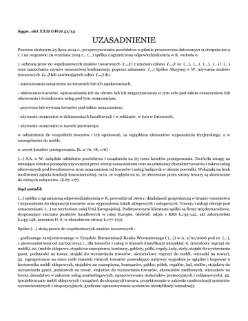 Sygn. akt XXII GWzt 51/14 UZASADNIENIE Pozwem złożonym 25 lipca 2014 r., po sprecyzowaniu powództwa w piśmie procesowym datowanym 11 sierpnia 2014 r. i na rozprawie 29 września 2014 r., (...) spółka z ograniczoną odpowiedzialnością w K. wniosła o: 1. ochronę praw do wspólnotowych znaków towarowych (...) i z użyciem członu (...): nr (...), (...), (...), (...) i (...) oraz zaniechanie czynów nieuczciwej konkurencji, poprzez zakazanie (...) Spółce Akcyjnej w W. używania znaków towarowych (...) lub zawierających człon (...) do: - umieszczania oznaczenia na towarach lub ich opakowaniach, - oferowania towarów, wprowadzania ich do obrotu lub ich magazynowania w tym celu pod takim oznaczeniem lub oferowania i świadczenia usług pod tym oznaczeniem, - przywozu lub wywozu towarów pod takim oznaczeniem, - używania oznaczenia w dokumentach handlowych i w reklamie, w tym w Internecie, - używania oznaczenia w nazwie pozwanego; w odniesieniu do wszystkich towarów i ich opakowań, za wyjątkiem elementów wyposażenia fryzjerskiego, a w szczególności do mebli; 2. zwrot kosztów postępowania. (k. 2-76, 78, 176) (...) S.A. w W. zażądała oddalenia powództwa i zasądzenia na jej rzecz kosztów postępowania. Zwróciła uwagę na istniejące różnice pomiędzy używanymi przez strony oznaczeniami oraz na odmienny charakter towarów i zakres usług oferowanych pod kwestionowa-nym oznaczeniem od towarów i usług będących w ofercie powódki. Wskazała na brak możliwości zajścia konfuzji konsumenckiej, m.in. ze względu na to, że oferowane przez strony towary są skierowane do różnych nabywców. (k.87-117) Sąd ustalił: (...) spółka z ograniczoną odpowiedzialnością w K. prowadzi od 1999 r. działalność gospodarczą w branży wzornictwa i wyposażenia do ekspozycji towarów oraz wyposażenia lokali sklepowych i usługowych. Towary i usługi oferuje pod oznaczeniami (...) na terytorium całej Unii Europejskiej. Podstawowymi klientami spółki są firmy międzynarodowe, dysponujące sieciami punktów handlowych w całej Europie. (dowód: odpis z KRS k.135-142, akt założycielski k.143-148, zeznania D. S. w charakterze strony k.177-179) Spółce (...) służą prawa do wspólnotowych znaków towarowych : - graficznego zarejestrowanego w Urzędzie Harmonizacji Rynku Wewnętrznego ( (...)) w A. 2/01/2006 pod nr (...), z pierwszeństwem od 29/09/2004 r., dla towarów i usług w klasach klasyfikacji nicejskiej: 6. (metalowy osprzęt do mebli), 20. (meble sklepowe, stojaki na czasopisma, kontuary, gabloty, półki, regały, lady, stoły, stojaki do wystawiania gazet, podstawki na towar, stojaki do wystawiania towarów, niemetalowy osprzęt do mebli, wieszaki na towar), 35. (zgrupowanie na rzecz osób trzecich różnych towarów pozwalające nabywcy wygodnie je oglądać i kupować u hurtownika mebli sklepowych, stojaków na czasopisma, kontuarów, gablot, półek, regałów, lad, stołów, stojaków do wystawiania gazet, podstawek na towar, stojaków do wystawiania towarów, akcesoriów meblowych, wieszaków na towar, doradztwo w zakresie usług marketingowych, opracowywanie materiałów promocyjnych i reklamowych), 42. (projektowanie mebli sklepowych i urządzeń do ekspozycji towaru, projektowanie w zakresie modernizacji systemów wystawienniczych i ekspozycyjnych, graficzne opracowywanie systemów identyfikacji wizualnej); - graficznego (...) (...) (...)" \* (...) (...) (...)" \* (...) (...) (...)" \* (...) (...) (...)" \* (...)(...) (...)" \* (...) zarejestrowanego w (...) 8/04/2009 r. pod nr (...), z pierwszeństwem od 6/08/2008 r., dla towarów i usług w klasach klasyfikacji nicejskiej: 20. (meble sklepowe, stojaki na czasopisma, kontuary, gabloty, półki, regały, lady, stoły, stojaki do wystawiania gazet, podstawki na towar, stojaki do wystawiania towarów, niemetalowy osprzęt do mebli, wieszaki na towar.), 35. (zgrupowanie na rzecz osób trzecich różnych towarów pozwalające nabywcy wygodnie je oglądać i kupować u hurtownika mebli sklepowych, stojaków na czasopisma, kontuarów, gablot, półek, regałów, lad, stołów, stojaków do wystawiania gazet, podstawek na towar, stojaków do wystawiania towarów, akcesoriów meblowych, wieszaków na towar, doradztwo w zakresie usług marketingowych, opracowywanie materiałów promocyjnych i reklamowych), 42. (projektowanie mebli sklepowych i urządzeń do ekspozycji towaru, projektowanie w zakresie modernizacji systemów wystawienniczych i ekspozycyjnych, graficzne opracowywanie systemów identyfikacji wizualnej); - graficznego (...) "https://oami.europa. (...)" \* (...) "https://oami.europa. (...)" \* (...) "https://oami.europa. (...)" \* (...) "https://oami.europa. (...)" \* (...) "https://oami.europa. (...)" \* (...) zarejestrowanego w (...) 14/09/2013 r. pod nr (...), z pierwszeństwem od 1/03/2012 r., dla towarów i usług w klasach klasyfikacji nicejskiej: 20. (meble sklepowe, stojaki na czasopisma, kontuary, gabloty, półki, regały, lady, stoły, stojaki do wystawiania gazet, podstawki na towar, stojaki do wystawiania towarów, niemetalowy osprzęt do mebli, wieszaki na towar.), 35. (zgrupowanie na rzecz osób trzecich różnych towarów pozwalające nabywcy wygodnie je oglądać i kupować u hurtownika mebli sklepowych, stojaków na czasopisma, kontuarów, gablot, półek, regałów, lad, stołów, stojaków do wystawiania gazet, podsta-wek na towar, stojaków do wystawiania towarów, akcesoriów meblowych, wieszaków na towar, doradztwo w zakresie usług marketingowych, opracowywanie materiałów promocyjnych i rekla-mowych), 42. (projektowanie mebli sklepowych i urządzeń do ekspozycji towaru, projektowanie w zakresie modernizacji systemów wystawienniczych i ekspozycyjnych, graficzne opracowywanie systemów identyfikacji wizualnej); - graficznego (...) "https://oami.europa. (...)" \* (...) "https://oami.europa. (...)" \* (...) "https://oami.europa. (...)" \* (...) "https://oami.europa. (...)