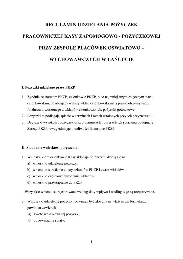 REGULAMIN UDZIELANIA POŻYCZEK PRACOWNICZEJ KASY ZAPOMOGOWO - POŻYCZKOWEJ PRZY ZESPOLE PLACÓWEK OŚWIATOWO – WYCHOWAWCZYCH W ŁAŃCUCIE I. Pożyczki udzielane przez PKZP 1. Zgodnie ze statutem PKZP, członkowie PKZP, o co najmniej trzymiesięcznym stażu członkowskim, posiadający własny wkład członkowski mają prawo otrzymywać z funduszu utworzonego z wkładów członkowskich, pożyczki gotówkowe. 2. Pożyczki te podlegają spłacie w terminach i ratach ustalonych przy ich przyznawaniu. 3. Decyzje o wysokości pożyczek oraz o warunkach i okresach ich spłacania podejmuje Zarząd PKZP, uwzględniając możliwości finansowe PKZP. II. Składanie wniosków, poręczenia 1. Wnioski, które członkowie Kasy składają do Zarządu dzielą się na: a) wnioski o udzielenie pożyczki b) wnioski o skreślenie z listy członków PKZP i zwrot wkładów c) wnioski o częściowe wycofanie wkładów d) wnioski o przystąpienie do PKZP Wszystkie wnioski są rejestrowane według daty wpływu i według tego są rozpatrywane. 2. Wniosek o udzielenie pożyczki powinien być złożony na właściwym formularzu i powinien zawierać: a) kwotę wnioskowanej pożyczki, b) zobowiązanie spłaty, 1 c) zgodę na potrącanie spłat pożyczki z wynagrodzeń, z zasiłku chorobowego, zasiłku wychowawczego, a w razie skreślenia z listy członków PKZP, zgodę na natychmiastowe uregulowanie, pozostałego do spłaty zadłużenia, d) poręczenie dwóch członków PKZP, jeżeli wnioskowana kwota pożyczki przewyższa wysokość wkładów pożyczkobiorcy; e) wniosek powinien być wypełniony czytelnie, f) wniosek można złożyć dopiero po spłaceniu pożyczki uprzednio pobranej, g) wnioski niespełniające w/w wymagań nie będą przyjmowane 3. Zasady poręczeń: a) w przypadku, gdy kwota pożyczki jest niższa od kwoty wkładów, poręczenia b) nie są wymagane, c) w przypadku, gdy kwota pożyczki przewyższa wysokość wkładów poręczycieleczłonkowie Kasy potwierdzają poręczenie własnoręcznym podpisem, d) poręczyciele obowiązani są wyrazić zgodę na potrącenie z wynagrodzenia za pracę, (zasiłku chorobowego lub wychowawczego) lub z własnych wkładów poręczonej pożyczki, w razie niespłacenia jej przez pożyczkobiorcę, e) członek PKZP może być jednocześnie poręczycielem tylko 2 pożyczek. III. Spłata pożyczek 1. Spłaty pożyczek powinny być dokonywane regularnie co miesiąc w wysokościach ustalonych przez Zarząd przy udzielaniu pożyczki. 2. Spłaty pożyczek powinny być dokonywane przez potrącenie ustalonych rat z wynagrodzeń członka, ewentualnie z zasiłków chorobowych bądź wychowawczych. 3. W przypadku niemożliwości spłaty zgodnie w punktem III.2, spłaty mogą być dokonywane na rachunek bankowy PKZP , (dotyczy to w szczególności emerytów i rencistów). 4. Maksymalny okres spłaty pożyczki nie powinien przekroczyć 30 miesięcy od momentu jej przyznania. 5. W uzasadnionych przypadkach (choroba w rodzinie lub inne zdarzenie losowe), Zarząd PKZP może na wniosek pożyczkobiorcy odroczyć spłatę pożyczki na okres od jednego do trzech miesięcy lub rozłożyć ją na większą ilość rat (maksymalnie 36 rat). 6. W przypadku niedokonania spłaty pożyczki w wyznaczonym terminie Zarząd PKZP ma prawo pokryć to zadłużenie w pierwszej kolejności z wkładów pożyczkobiorcy, a po ich 2 wyczerpaniu pozostałą częścią zadłużenia Zarząd obciąża solidarnie odpowiedzialnych poręczycieli, wzywając ich do spłaty zadłużenia w terminach obowiązujących pożyczkobiorcę. Jeżeli poręczyciele nie spłacą w tym terminie zadłużenia, Zarząd ma prawo pokryć zadłużenie z wkładów poręczycieli. 7. W razie śmierci członka PKZP jego zadłużenie podlega spłacie przez poręczycieli. Zapłaty tego zadłużenia, można dochodzić od spadkobierców zmarłego. Nieściągalne zadłużenie może być umorzone w ciężar funduszu rezerwowego. 3