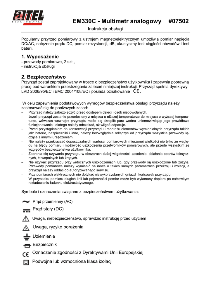 EM330C - Multimetr analogowy #07502 Instrukcja obsługi Popularny przyrząd pomiarowy z ustrojem magnetoelektrycznym umoŜliwia pomiar napięcia DC/AC, natęŜenie prądu DC, pomiar rezystancji, dB, akustyczny test ciągłości obwodów i test baterii. 1. WyposaŜenie - przewody pomiarowe, 2 szt., - instrukcja obsługi 2. Bezpieczeństwo Przyrząd został zaprojektowany w trosce o bezpieczeństwo uŜytkownika i zapewnia poprawną pracę pod warunkiem przestrzegania zaleceń niniejszej instrukcji. Przyrząd spełnia dyrektywy LVD 2006/95/EC i EMC 2004/108/EC i posiada oznakowanie . W celu zapewnienia podstawowych wymogów bezpieczeństwa obsługi przyrządu naleŜy zastosować się do poniŜszych zasad: − − − − − − − − Przyrząd naleŜy zabezpieczyć przed dostępem dzieci i osób niepowołanych. JeŜeli przyrząd zostanie przeniesiony z miejsca o niŜszej temperaturze do miejsca o wyŜszej temperaturze, wówczas wewnątrz przyrządu moŜe się skroplić para wodna uniemoŜliwiając jego prawidłowe funkcjonowanie i dlatego naleŜy odczekać, aŜ wilgoć odparuje. Przed przystąpieniem do konserwacji przyrządu i montaŜu elementów wymienialnych przyrządu takich jak: baterie, bezpieczniki i inne, naleŜy bezwzględnie odłączyć od przyrządu wszystkie przewody łączące z innymi urządzeniami. Nie naleŜy przekraczać dopuszczalnych wartości pomiarowych mierzonej wielkości nie tylko ze względu na błędy pomiaru i moŜliwość uszkodzenia przetworników pomiarowych, ale przede wszystkim ze względów bezpieczeństwa uŜytkownika. Zabrania się uŜywania przyrządu w obszarach duŜej wilgotności, zasolenia, działania oparów toksycznych, łatwopalnych lub Ŝrących. Nie uŜywać przyrządu przy widocznych uszkodzeniach lub, gdy przewody są uszkodzone lub zuŜyte. Przewody pomiarowe naleŜy wymienić na nowe o takich samych parametrach przekroju i izolacji, a przyrząd naleŜy oddać do autoryzowanego serwisu. Przy pomiarach elektrycznych nie dotykać niewykorzystanych gniazd i końcówek przyrządu. W przypadku pomiaru długich linii lub pojemności pomiar moŜe być wykonany dopiero po całkowitym rozładowaniu ładunku elektrostatycznego. Symbole i oznaczenia związane z bezpieczeństwem uŜytkowania: Prąd przemienny (AC) Prąd stały (DC) Uwaga, niebezpieczeństwo, sprawdzić instrukcję przed uŜyciem Uwaga, ryzyko poraŜenia Uziemienie Bezpiecznik Oznaczenie zgodności z Dyrektywami Unii Europejskiej Podwójna lub wzmocniona klasa izolacji 3. Budowa 1.Wskazówka, 2. Zerowanie wskazówki, 3. Zerowanie omomierza, 4. Przełącznik zmiany zakresów, 5. Gniazdo „-„, 6. Gniazdo „+”, 7. Skala Odczyt zorganizowano za pomocą pięciu skal Górna- dla odczytu rezystancji, poniŜej dla pomiarów napięć DC/AC i prądu DC, trzecia wyłącznie dla pomiaru napiecia AC na zakresie 10V, czwarta „dB” dla pomiaru w dB, piąta skala dla testów sprawności baterii.(Rys2). Przed wykonaniem pomiarów sprawdź, czy wskazówka ustawiona jest dokładnie na „0” jeŜeli inaczej to ustaw za pomocą regulatora „2” (Rys3). Podłącz przewody pomiarowe do gniazd pomiarowych odpowiednio „+” czerwony, „-„ czarny. JeŜeli wskazówka wychyla się poza granicę skali zwiększ zakres pomiarowy na wyŜszy. 4. Pomiary Pomiar napięcia stałego DC Ustaw przełącznik zakresów na , podłącz odpowiednio przewody pomiarowe (jeŜeli wskazówka wychyla się w lewo zamień miejscami punnkty przyłoŜenia przewodów pomiarowych). Dla wygodnego odczytu stosuj odpowiednio skale pomiarowe: 2,5V 0-250 wynik podziel przez 100 10V 0-10 50V 0-50 100V 0-10 wynik podziel przez 10 250V 0-250 Pomiar napięcia zmiennego AC Ustaw przełącznik zakresów na , podłącz odpowiednio przewody pomiarowe. Dla wygodnego odczytu stosuj odpowiednio skale pomiarowe: 10V 0-10 50V 0-50 100V 0-10 wynik podziel przez 10 250V 0-250 Pomiar prądu stałego DC Ustaw przełącznik zakresów na , wyłącz zasilanie obwodu pomiarowego, rozładuj wszelkie pojemności w obwodzie, podłącz odpowiednio z polaryzacją przewody pomiarowe. Dla wygodnego odczytu stosuj odpowiednio skale pomiarowe: 10 0-10 500 0-50 wynik podziel przez 10 Pomiar rezystancji Ustaw przełącznik zakresów na na krótko zewrzyj przewody pomiarowe i za pomocą pokrętła (3 ) ustaw wskazówkę na „0”. JeŜeli jest to niemoŜliwe wymień baterię zasilającą przyrząd. Podłącz przewody pomiarowe do mierzonej rezystancji. JeŜeli korzystasz np. z zakresu X10 odczytany wynik musisz pomnoŜyć x10. Pomiar ciągłości obwodu Ustaw przełącznik zakresów na . Podłącz przewody pomiarowe do mierzonego obwodu. JeŜeli rezystancja przejścia jest poniŜej 20Ω usłyszysz sygnał dźwiękowy. 2 Pomiar w dB Ustaw przełącznik zakresów jak przy pomiarze napięcia przemiennego a odczytu dokonaj na skali dB. Dla pomiarów na zakresie AC 10V odczyt w dB jest bezpośredni (-20 +22). JeŜeli odczyt przekracza +22dB zastosuj zakresy wyŜsze i dodaj do odczytu odpowiednio stały czynnik :AC50V +14dB, AC100V +20dB, AC250V +28dB. JeŜeli dokonujesz pomiaru sygnału , który zawiera składową stałą zastosuj szeregowo kondensator o pojemności 0,1uF/250V. Test baterii 1,5V oraz 9V Ustaw przełącznik zakresów na wybirajac zakres 1,5V lub 9V. Podłącz przewody pomiarowe do mierzonej baterii zachowując biegunowość (+ czerwony). Czerwone pole na skali świadczy iŜ bateria jest wyczerpana, zielone pole bateria sprawna. UWAGA! Wymiana baterii w przyrządzie moŜe być wykonana po odłączeniu przewodów pomiarowych. Instrukcja wymiany baterii: • wyłączyć zasilanie urządzenia • otworzyć pokrywę pojemnika baterii , usunąć baterie • usunięte baterie lub akumulatory składować w wyznaczonym miejscu zbiórki • zamontować nowe baterie zachowując właściwą polaryzację. Wymiana bezpiecznika Przed wymianą bezpieczników naleŜy wyłączyć miernik, odłączyć go od mierzonego obwodu oraz odłączyć sondy pomiarowe. Otworzyć