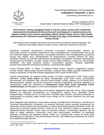 Trybunał Sprawiedliwości Unii Europejskiej KOMUNIKAT PRASOWY nr 66/14 Luksemburg, 30 kwietnia 2014 r. Kontakty z Mediami i Informacja Wyrok w sprawie C-26/13 Árpád Kásler i Hajnalka Káslerné Rábai / OTP Jelzálogbank Zrt Konsumenci, którzy zaciągają kredyt w walucie obcej, muszą mieć możliwość oszacowania konsekwencji ekonomicznych wynikających z zastosowania przy spłacie kredytu kursu (kursu sprzedaży waluty obcej) innego niż ten, który został zastosowany do obliczenia wysokości kredytu przy jego uruchomieniu (kurs kupna waluty obcej) Sąd krajowy może zastąpić nieuczciwy warunek umowny przepisem prawa krajowego, aby ustanowić równowagę między stronami umowy i zachować ważność tej ostatniej Dyrektywa w sprawie nieuczciwych warunków w umowach konsumenckich1 stanowi, że nieuczciwe warunki w umowach zawieranych przez przedsiębiorców z konsumentami nie są dla tych ostatnich wiążące. Niemniej jednak, w przypadku warunków, które określają główny przedmiot umowy oraz relację ceny i wynagrodzenia do dostarczonych w zamian towarów lub usług, dyrektywa zezwala, by państwa członkowskie przewidziały w przepisach krajowych stanowiących transpozycję tej dyrektywy, że tego rodzaju warunki będą zwolnione z oceny ich nieuczciwego charakteru, o ile będą wyrażone prostym i zrozumiałym językiem. Przepisy węgierskie, poprzez które dokonano transpozycji dyrektywy, przewidują taki wyjątek. W dniu 29 maja 2008 r. Á. Kásler i H. Káslerné Rábai zawarli z jednym z węgierskich banków umowę kredytu hipotecznego denominowanego w walucie obcej. Bank przyznał kredytobiorcom kredyt w wysokości 14 400 000 forintów węgierskich (HUF) (około 46 867 EUR). Umowa przewidywała, że ustalenie kwoty kredytu we franku szwajcarskim (CHF) miało zostać dokonane według kursu kupna tej waluty stosowanego przez bank w dniu uruchomienia finansowania. Na podstawie tego warunku kwota kredytu została ustalona na 94 240,84 CHF. Niemniej jednak, zgodnie z tą umowa wyrażona w forintach węgierskich wysokość należnych rat miesięcznych miała być określana po stosowanym przez bank kursie sprzedaży franka szwajcarskiego obowiązującym w dniu poprzedzającym dzień wymagalności raty. Małżonkowie Kásler zakwestionowali przed sądami węgierskimi warunek umowy, który pozwala bankowi na obliczanie wymagalnych rat miesięcznych według kursu sprzedaży franka szwajcarskiego. Powołali się oni na nieuczciwy charakter tego warunku, ponieważ przewiduje on zastosowanie na potrzeby spłaty kredytu kursu innego niż ten, którym posłużono się przy jego udostępnieniu. Kúria (węgierski sąd najwyższy), rozpoznający sprawę w postępowaniu kasacyjnym, zwrócił się do Trybunału Sprawiedliwości z pytaniem, czy warunek dotyczący kursów wymiany stosowanych do wykonania umowy kredytu denominowanego w walucie obcej określa główny przedmiot umowy lub odnosi się do stosunku jakości towarów i usług do ich ceny. Zmierza on także do ustalenia, czy zakwestionowany warunek można uznać za wyrażony prostym i zrozumiałym językiem, tak by mógł on zostać zwolniony z dokonania oceny jego nieuczciwego charakteru na podstawie dyrektywy. Wreszcie sąd węgierski pragnie ustalić, czy w sytuacji gdy umowa nie może dalej obowiązywać po wyłączeniu z niej nieuczciwego warunku, sąd krajowy jest uprawniony do zmiany lub uzupełnienia tego warunku. 1 Dyrektywa Rady 93/13/EWG z dnia 5 kwietnia 1993 r. w sprawie nieuczciwych warunków w umowach konsumenckich (Dz.U. L 95, s. 29). www.curia.europa.eu Trybunał przypomniał, po pierwsze, że zakaz dokonywania oceny nieuczciwego charakteru warunków odnoszących się do określenia głównego przedmiotu umowy musi podlegać wykładni zawężającej i ma zastosowanie wyłącznie do warunków określających podstawowe świadczenia w ramach danej umowy. Do Kúria należy ustalenie, czy zakwestionowany warunek umowny stanowi podstawowy element umowy zawartej przez małżeństwo Kásler. Ponadto Trybunał zauważył, że ocena nieuczciwego charakteru omawianego warunku nie może zostać wyłączona z tego względu, że warunek ten odnosi się do relacji ceny i wynagrodzenia do dostarczonych w zamian towarów lub usług. Rozpatrywany warunek ogranicza się bowiem do określenia, w celu obliczenia rat kredytu, kursu wymiany między węgierskim forintem a frankiem szwajcarskim, nie przewidując jednak świadczenia przez kredytodawcę usługi wymiany waluty. Tymczasem w braku takiej usługi ciężar finansowy wynikający z różnicy pomiędzy kursem sprzedaży i kursem kupna, który musi ponieść kredytobiorca, nie może zostać uznany za wynagrodzenie należne w zamian za usługę. Po drugie, Trybunał sprecyzował, że warunek określający główny przedmiot umowy wymyka się ocenie jego nieuczciwego charakteru tylko wówczas, gdy został on wyrażony w sposób jednoznaczny i zrozumiały. W tym względzie Trybunał podkreślił, że powyższy wymóg nie ogranicza się do jednoznaczności i zrozumiałości wyłącznie pod względem formalnym i czysto gramatycznym. Przeciwnie, umowa kredytu musi w sposób przejrzysty ukazywać powody i specyfikę mechanizmu przeliczania waluty obcej. Wobec tego do Kúria należy ustalenie, czy właściwie poinformowany oraz dostatecznie uważny konsument może, na podstawie form zachęty stosowanych przez kredytodawcę w procesie negocjacji umowy i dostarczonych na tym etapie informacji, nie tylko dowiedzieć się o istnieniu różnicy między kursem sprzedaży a kursem kupna waluty obcej, ale również oszacować skutki zastosowania kursu sprzedaży przy obliczaniu rat kredytu, a w rezultacie także całkowity koszt zaciągniętego przez siebie kredytu. Wreszcie Trybunał zauważył, że w sytuacji gdy wykreślenie nieuczciwego warunku prowadziłoby, jak ma to miejsce w niniejszej sprawie, do niemożności wykonania umowy, dyrektywa nie stoi na przeszkodzie temu, by sąd krajowy