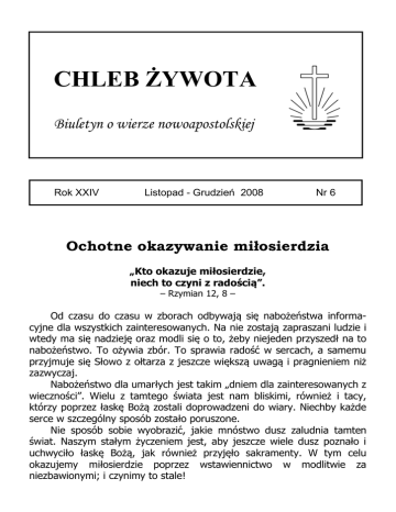 CHLEB ŻYWOTA Biuletyn o wierze nowoapostolskiej Rok XXIV Listopad - Grudzień 2008 Nr 6 Ochotne okazywanie miłosierdzia „Kto okazuje miłosierdzie, niech to czyni z radością”. – Rzymian 12, 8 – Od czasu do czasu w zborach odbywają się nabożeństwa informacyjne dla wszystkich zainteresowanych. Na nie zostają zapraszani ludzie i wtedy ma się nadzieję oraz modli się o to, żeby niejeden przyszedł na to nabożeństwo. To ożywia zbór. To sprawia radość w sercach, a samemu przyjmuje się Słowo z ołtarza z jeszcze większą uwagą i pragnieniem niż zazwyczaj. Nabożeństwo dla umarłych jest takim „dniem dla zainteresowanych z wieczności”. Wielu z tamtego świata jest nam bliskimi, również i tacy, którzy poprzez łaskę Bożą zostali doprowadzeni do wiary. Niechby każde serce w szczególny sposób zostało poruszone. Nie sposób sobie wyobrazić, jakie mnóstwo dusz zaludnia tamten świat. Naszym stałym życzeniem jest, aby jeszcze wiele dusz poznało i uchwyciło łaskę Bożą, jak również przyjęło sakramenty. W tym celu okazujemy miłosierdzie poprzez wstawiennictwo w modlitwie za niezbawionymi; i czynimy to stale! Kiedy ochotnie okazuje się miłosierdzie? Gdy czyni się to z miłości do tych dusz. Miłosierdzie jest także serdecznością, czyli okazywaniem ciepłego serca, czyli serca, które współczuje i jest wrażliwe. Oznacza to też, że nędza innych dusz dochodzi do naszego serca! To jednak nie wystarcza; musi zostać udzielona pomoc. Nasza pomoc zawarta jest w modlitwach, które niczym zaproszenie skierowane do wszystkich pragnących zbawienia dusz ze świata duchowego posyłamy do tronu Bożego, aby przez aniołów Najwyższego dusze były doprowadzone do ołtarza pomocy i łaski Bożej. Jeśli takie dusze przychodzą do domu Bożego, wtedy zostaje im udzielona Jego pomoc i miłosierdzie. Pomoc Boża, do której przyczynia się nasza prośba modlitewna, służy szukającym i pragnącym duszom do zbawienia poprzez przyjęcie Słowa i zbawiennej łaski. Dusze takie przeżywają działanie sakramentów, osiągają pokój, a w końcu mogą być zapro-wadzone do nowego miejsca w sferach wieczności. Niezbędnym warunkiem jest to, żeby te dusze uwierzyły i się nawróciły – wówczas może zadziałać miłosierdzie Boże. Trójjedyny Bóg pomaga chętnie. A czy my również pomagamy zgodnie ze słowami Apostoła Pawła do Rzymian: „Kto okazuje miłosierdzie, niech to czyni z radością”? Czy też za mało czasu na to poświęcamy? Czy w ogóle się tym nie zajmujemy? Miłość do wszystkich dusz przecież skłania nas do tego, aby czynić to, co do nas należy nawet wtedy, kiedy osobiście ich nie znamy. Bóg chce zbawić wszystkich ludzi, a tym zamiarem objęci są nie tylko ci, którzy żyją pośród nas, ale też ci, których już pośród nas nie ma. Zdolność miłowania również i tych, którzy w tamtych krainach chcą przystąpić do łaski, wynika ze szczerej miłości bliźniego i wypływa z daru Ducha Świętego. Mamy wielkie zainteresowanie tym, żeby dzieło Boże zostało szybko dokończone, żeby Jezus Chrystus wnet przyszedł i zgodnie ze swoją obietnicą zabrał swoich do siebie – tam, gdzie On jest. (por. Ew. Jana 14, 1-3) Przecież pragniemy tego! Takie wielkie dni miłosierdzia, jakimi są nabożeństwa dla umarłych, w szczególny sposób służą dokończeniu. Pomoc może zostać udzielona tym wszystkim, którzy wypatrują pomocy! Zaznanie miłosierdzia wyzwala wdzięczność i radość. Niechby radość i wdzięczność zbawionych i ułaskawionych dusz z tego i tamtego świata sprawiła w nas wiele radości i wdzięczności, także w świadomości, że stale zbliżamy się do dnia, w którym dopełni się liczba powołanych na wesele Baranka. (por. Obj. Jana 19, 7; 22, 17. 20) 2 List apostoła okręgowego Wilfrieda Klinglera do zborów Mili Bracia i Siostry, „Nie przestaję dziękować za was i wspominać was w modlitwach moich, aby Bóg Pana naszego Jezusa Chrystusa, Ojciec chwały, dał wam Ducha mądrości i objawienia ku poznaniu jego”. (Efezjan 1, 16. 17) Apostoł Paweł, gorliwy pracownik i odważny wyznawca ewangelii postrzegał Kościół jako dar Boży i dziękował za niego. To przypomina nam słowa Jezusa z arcykapłańskiej modlitwy: „…twoimi byli i mnie ich dałeś”. W podobnym sensie możemy dziękować Bogu za założenie i zachowanie Kościoła, zborów Pańskich. W ślad za Apostołem Pawłem niech także nasze uwielbienie i dziękczynienie uwidacznia się w prośbie o zachowanie i udoskonalenie w usposobieniu Chrystusa. Zależy mi bardzo na tym, aby zasadnicze myśli tegorocznego nabożeństwa zielonoświątkowego wraz z poniższym słowem przewodnim pozostały żywe i były impulsem do kształtowania naszego życia zborowego. „Umiłowani, jeżeli Bóg nas tak umiłował, i myśmy powinni nawzajem się miłować”. (1. Jana 4, 11) To wezwanie nie jest dla nas nowe, ale ponownie ma być postawiony nowy akcent. Potrzebujemy wspólnoty; bez niej dzieło Boże nie może zostać dokończone. W kolejnym wersecie jest mowa: „Boga nikt nigdy nie widział; jeżeli nawzajem się miłujemy, Bóg mieszka w nas”. Wzajemna miłość ukierunkowana jest więc też do góry. Jeżeli wzajemnie się miłujemy, to Pan pozostaje pośród nas. Niebezpiecznie jest, gdy się mówi: „Przede wszystkim, abym miał dobry stosunek do Pana Jezusa…”. Oczywiście chcemy mieć dobry stosunek do Pana. Takie staranie jest pożądane, ale jeżeli miałoby to być kosztem wspólnoty, wtedy nie odpowiada to ewangelii w naszym nowoapostolskim rozumieniu. Inne niebezpieczeństwo: Może być tak, że swoich darów nie można w pełni urzeczywistniać w zborze. Szczególnie młodzi bracia i siostry szybko się wówczas kierują na zewnątrz, gdzie być może lepiej mogą wykazać swoje dary. Nie odizolowujmy się. Nasza wspólnota musi być zawsze dla nas wartościowa, nawet wtedy, kiedy nie wszystko idzie g