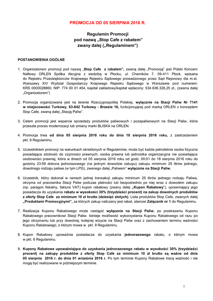 PROMOCJA OD 05 SIERPNIA 2016 R. Regulamin Promocji pod nazwą „Stop Cafe z rabatem” zwany dalej („Regulaminem”) POSTANOWIENIA OGÓLNE 1. Organizatorem promocji pod nazwą „Stop Cafe z rabatem”, zwaną dalej „Promocją” jest Polski Koncern Naftowy ORLEN Spółka Akcyjna z siedzibą w Płocku, ul. Chemików 7, 09-411 Płock, wpisana do Rejestru Przedsiębiorców Krajowego Rejestru Sądowego prowadzonego przez Sąd Rejonowy dla m.st. Warszawy XIV Wydział Gospodarczy Krajowego Rejestru Sądowego w Warszawie pod numerem: KRS 0000028860, NIP: 774 00 01 454, kapitał zakładowy/kapitał wpłacony: 534.636.326,25 zł., (zwana dalej „Organizatorem”) 2. Promocja organizowana jest na terenie Rzeczypospolitej Polskiej, wyłącznie na Stacji Paliw Nr 7141 w miejscowości Turkowy, 63-642 Turkowy - Brzezie 16, funkcjonującej pod marką ORLEN z konceptem Stop Cafe, zwaną dalej „Stacją Paliw”. 3. Celem promocji jest wsparcie sprzedaży produktów paliwowych i pozapaliwowych na Stacji Paliw, która przeszła proces modernizacji lub zmiany marki BLISKA na ORLEN. 4. Promocja trwa od dnia 05 sierpnia 2016 roku do dnia 18 sierpnia 2016 roku, z zastrzeżeniem pkt. 9 Regulaminu. 5. Uczestnikiem promocji na warunkach określonych w Regulaminie, może być każda pełnoletnia osoba fizyczna posiadająca zdolność do czynności prawnych, osoba prawna lub jednostka organizacyjna nie posiadająca osobowości prawnej, która w dniach od 05 sierpnia 2016 roku od godz. 00:01 do 18 sierpnia 2016 roku do godziny 23:59 dokona jednorazowego (na jednym dowodzie zakupu) zakupu minimum 25 litrów jednego, dowolnego rodzaju paliwa (w tym LPG), zwanego dalej „Paliwem” wyłącznie na Stacji Paliw. 6. Uczestnik, który dokonał w ramach jednej transakcji zakupu minimum 25 litrów jednego rodzaju Paliwa, otrzyma od pracownika Stacji Paliw podczas płatności lub bezpośrednio po niej wraz z dowodem zakupu (np. paragon fiskalny, faktura VAT) kupon rabatowy (zwany dalej „Kupon Rabatowy”), uprawniający jego posiadacza do uzyskania rabatu w wysokości 30% (trzydzieści procent) na zakup dowolnych produktów z oferty Stop Cafe za minimum 10 zł brutto (dziesięć złotych). Lista produktów Stop Cafe, zwanych dalej „Produktami Promocyjnymi”, za których zakup naliczany jest rabat, stanowi Załącznik nr 1 do Regulaminu. 7. Realizacja Kuponu Rabatowego może nastąpić wyłącznie na Stacji Paliw, po przekazaniu Kuponu Rabatowego pracownikowi Stacji Paliw. Istnieje możliwość wykorzystania Kuponu Rabatowego od razu po jego otrzymaniu lub przy dowolnej, kolejnej wizycie na Stacji Paliw oraz z zachowaniem terminu ważności Kuponu Rabatowego, o którym mowa w pkt. 9 Regulaminu. 8. Kupon Rabatowy upoważnia posiadacza do uzyskania jednorazowego rabatu, o którym mowa w pkt. 6 Regulaminu. 9. Kupony Rabatowe upoważniające do uzyskania jednorazowego rabatu w wysokości 30% (trzydzieści procent) na zakupy produktów z oferty Stop Cafe za minimum 10 zł brutto są ważne od dnia 05 sierpnia 2016 r. do dnia 01 września 2016 r. Po tym terminie Kupony Rabatowe tracą ważność i nie mogą być realizowane w późniejszym terminie. 1 10. W przypadku zakupu jednego dowolnego rodzaju Paliwa w ilości będącej wielokrotnością 25 litrów na jednym dowodzie zakupu, Uczestnikowi nie przysługuje proporcjonalnie większa liczba Kuponów Rabatowych. 11. Każdy Uczestnik może wziąć udział w Promocji wielokrotnie na zasadach opisanych Regulaminem, przy założeniu, że rabat na zakupy produktów z oferty Stop Cafe Bistro, o którym mowa w pkt. 6, może uzyskać z użyciem maksymalnie 1 (słownie: jednego) Kuponu Rabatowego. Kupony Rabatowe nie sumują się. 12. Uczestnik nie może domagać się wykorzystania Kuponu Rabatowego w celu uzyskania rabatu na inne sprzedawane na Stacji Paliw produkty lub usługi ani wymiany Kuponu Rabatowego na jego równowartość w pieniądzach ani na żadną inną wymianę. 13. W ramach jednej wizyty na Stacji Paliw można zrealizować dowolną ilość Kuponów Rabatowych uprawniających do uzyskania rabatu na zasadach określonych w Regulaminie, z zastrzeżeniem pkt 11 Regulaminu. 14. Realizacja Kuponu Rabatowego, o którym mowa w pkt. 6, nie obejmuje transakcji zakupu Produktów Promocyjnych dokonanych przy użyciu kart FLOTA, OPEN DRIVE, Biznestank oraz Karty Zakupowej i Karty Upominkowej wydawanej w ramach oferty TankBank. Realizacja Kuponu Rabatowego możliwa jest wyłącznie przy realizacji płatności za paliwo gotówką lub przy użyciu karty bankowej. 15. Realizacja Kuponu Rabatowego, o którym mowa w pkt. 6 Regulaminu, nie może być łączona z innymi promocjami i rabatami oferowanymi przez Organizatora, a wpływającymi na dalsze obniżenie ceny produktów z oferty Stop Cafe Bistro. W przypadku, gdy Uczestnik spełni warunki uprawniające go do uzyskania rabatu na produkty Stop Cafe Bistro na podstawie regulaminu innej akcji promocyjnej, Uczestnik otrzyma jeden, korzystniejszy dla siebie (wyższy) rabat zgodnie z zasadą większej korzyści dla klienta. 16. Za dokonanie zakupu Produktów Promocyjnych z użyciem Kuponu Rabatowego Uczestnikowi przysługują punkty VITAY, z zastrzeżeniem spełnienia warunków określonych w Regulaminie Programu VITAY. SPOSÓB ZGŁASZANIA I ROZPATRYWANIA REKLAMACJI 17. Reklamacje związane z przebiegiem Promocji określonej niniejszym Regulaminem mogą być zgłaszane przez Uczestników m.in.: a) na piśmie i wysłane na adres: PKN ORLEN S.A. ul. Bielańska 12; 00-085 Warszawa z dopiskiem „Promocja Stop Cafe z rabatem”, b) poprzez Formularz Kontaktowy dedykowany http://opinie.orlen.pl/forms/ZglosProblem.aspx dla Akcji Promocyjnych na stronie: c) telefonicznie w całodobowym Centrum Obsługi Klienta PKN ORLEN pod numerami telefonów: 801-167536 (z tel. stacjonarnych), 502-167-536 (z tel. komórkowych). Koszt połączenia naliczany jest zgodnie z taryfą operatora. 18. Reklamacja powinna zawierać dane pozwalające na zidentyfiko