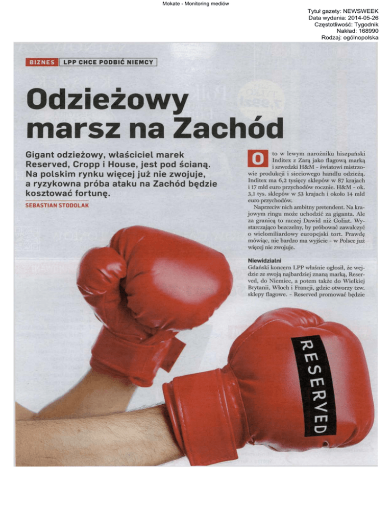 Mokate - Monitoring mediów Tytu³ gazety: NEWSWEEK Data wydania: 2014-05-26 Czêstotliwo¶æ: Tygodnik Nak³ad: 168990 Rodzaj: ogólnopolska BIZNES LPP CHCE PODBIĆ NIEMCY Odzieżowy marsz na Zachód Gigant odzieżowy, właściciel marek Reserved, Cropp i House, jest pod ścianą. Na polskim rynku więcej już nie zwojuje, a ryzykowna próba ataku na Zachód będzie kosztować fortunę. SEBASTIAN STODOLAK to w lewym narożniku hiszpański Inditex z Zarą jako flagową marką i szwedzki H&M - światowi mistrzo wie produkcji i sieciowego handlu odzieżą. Inditex ma 6,2 tysięcy sklepów w 87 krajach i 17 mld euro przychodów rocznie. H&M - ok. 3,1 tys. sklepów w 53 krajach i około 14 mld euro przychodów. Naprzeciw nich ambitny pretendent Na kra jowym ringu może uchodzić za giganta. Ale za granicą to raczej Dawid niż Goliat. Wy starczająco bezczelny, by próbować zawalczyć o wielomiliardowy europejski tort. Prawdę mówiąc, nie bardzo ma wyjście - w Polsce już więcej nie zwojuje. Niewidzialni Gdański koncern LPP właśnie ogłosił, że wej dzie ze swoją najbardziej znaną marką, Reser ved, do Niemiec, a potem także do Wielkiej Brytanii, Włoch i Francji, gdzie otworzy tzw. sklepy flagowe. - Reserved promować będzie Mokate - Monitoring mediów Tytu³ gazety: NEWSWEEK Data wydania: 2014-05-26 Czêstotliwo¶æ: Tygodnik Nak³ad: 168990 Rodzaj: ogólnopolska i & t A Georgia Jagger, córka Micka Jaggera, a już w lipcu otworzymy w Niemczech sklep in ternetowy - zapowiedział współwłaściciel i prezes spółki Marek Piechocki na łamach „Rzeczpospolitej". - Gdy wchodzi się na zachodni rynek, to wydatki na marketing będą szły w setki mi lionów euro. Nie można więc poprzestać na jednym rynku. Albo jest się wszędzie, albo nigdzie - tłumaczy Paweł Rabiej, znawca problematyki kreowania marek i wydawca magazynu „Thinktank". Szefostwo LPP plany traktuje poważnie, skoro prezes Piechocki udzielił pierwsze go w życiu wywiadu. Dotąd wraz ze wspól nikiem Jerzym Lubiańcem kierował się maksymą „tisze jediesz, dalsze budiesz". Za łożyciele LPP unikają mediów bardziej na wet niżfiskusa. Informacje o nich pochodzą z drugiej ręki - od anonimowych menedże rów bądź byłych pracowników. W interne cie nie ma ich zdjęć, bo na bieżąco zlecają odszukiwa nie ich autorów, a potem odkupują je i usuwają. Pie chocki to podobno blondyn z niebieskimi oczami, a Lubianiec to wąsacz o pociągłej twarzy. Tak samo zresztą postępuje od 40 lat ich największy konkurent Amando Ortega, właściciel hiszpańskiego Inditeksu. Do tego stopnia, że gdy do jego firmy przy chodzi z wizytą na przykład premier Hi szpanii, Ortega wysyła mu na powitanie podwładnych, by uniknąć blasku fleszy. Bodaj jedynym jego wystąpieniem pub licznym był udział w pogrzebie byłej żony w zeszłym roku. Jak hartowała się metka Nasi tajemniczy królowie mody zaczynali w 1990 roku, gdy po transformacji ustro jowej zaczęły się zapełniać puste przez lata półki sklepowe. Wtedy wszystko się sprzedawało, więc dwaj przedsiębiorczy absolwenci Politechniki Gdańskiej rzuci li pracę w zakładzie elektrotechnicznym i postanowili poszukać swojej szansy. Po mysł był prosty - sprowadzali hurtowo T-shirty z TUrcji i metkowali je zachodni mi markami. Udało im się zdobyć licencję na sprzedaż marki Fruit of the Loom, a po tem dodali do tego kolorowe dresy z Chin, sprzedawane pod marką Ross, co dopro wadziło do sądowych nieprzyjemności z firmą Hugo Boss - nazwy były zbyt zbliżone. Ale choć T-shirty i dresy uczyni ły z nich ludzi zamożnych, to wciąż nie był to biznes ich życia. Wszystko się zmie niło w 1995 r., gdy powstała firma LPP i jej marka Reserved. Firmowa legenda głosi, że nazwę wymyślił Piechocki, zainspiro wany wizytą w restauracji i umieszczony mi na stolikach karteczkami z informacją o rezerwacji. Reserved - to brzmi jak marka między narodowa. Wtedy, w latach 90., klienci nie mieli pojęcia, że kupują rodzimy wy rób. Myśleli, że to coś, co przyszło z Za chodu. Wielu pewnie tak sądzi do dziś. - Nazwa, która brzmi z angielska, na pew no pomoże teraz w ekspansji na Zachód, gdzie nasz kraj kojarzy się z dobrą wód ką, a nie z dobrymi ubraniami - zauważa dr hab. Marzanna Witek-Hajduk, ekspert od marketingu z warszawskiej Szkoły Głównej Handlowej. LPP od początku kopiowało model bi znesowy Inditeksu. Tak jak hiszpańska fir ma z centralą w mieście La Corona szycie zlecała w Azji. I podobnie jak Hiszpanie inspiracje dla projektów czerpała od naj bardziej znanych projektantów i domów mody. To, co tam kosztuje krocie, LPP czyniło ogólnodostępnym towarem. W1999 r. przychody firmy osiągnęły 107 mln zł (zysk wyniósł 6 mln zł), choć była ona obecna z niewielką liczbą sklepów tyl ko na polskim rynku. W kolejnej deka dzie LPP otwierało salony także w Estonii, Czechach, na Węgrzech, potem na Li twie, Ukrainie, Słowacji i w Rosji. Jedno cześnie tworzyło bądź przejmowało nowe marki. Dziś spółka ma 1,3 tys. salonów w 12 krajach i 5 marek - oprócz Reser ved także Cropp, Mohito, House i Sinsay. Klienci rocznie zostawiają w sklepach LPP • \ Mokate - Monitoring mediów Tytu³ gazety: NEWSWEEK Data wydania: 2014-05-26 Czêstotliwo¶æ: Tygodnik Nak³ad: 168990 Rodzaj: ogólnopolska • około 4 mld zł, co przekłada się na ponad 400 mln zł zysku. Pomyst na sukces W akcjach firmy Piechocki i Lubianiec mają po prawie półtora miliarda złotych. Piechocki w niedawnym wywiadzie za pewniał, że „pracuje nie dla pieniędzy, ale dla przyjemności". Akurat z pieniędzmi ostatnio jakby sła biej. Poza Polską najbardziej dochodowe dla LPP były rynki wschodnie - rosyjski i ukraiński. Teraz - ze względu na ryzyko polityczne związane z wtrącaniem się pre zydenta Putina w sprawy Ukrainy - LPP zmniejsza tam aktywność. Wstrzymuje także plany wejścia na rynek chiński. Wia domo, że Chińczycy kupują t