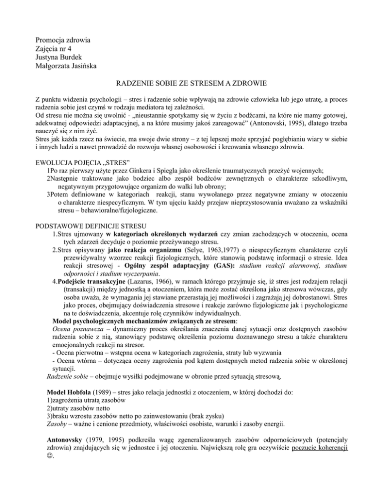Promocja zdrowia Zajęcia nr 4 Justyna Burdek Małgorzata Jasińska RADZENIE SOBIE ZE STRESEM A ZDROWIE Z punktu widzenia psychologii – stres i radzenie sobie wpływają na zdrowie człowieka lub jego utratę, a proces radzenia sobie jest czymś w rodzaju mediatora tej zależności. Od stresu nie można się uwolnić - „nieustannie spotykamy się w życiu z bodźcami, na które nie mamy gotowej, adekwatnej odpowiedzi adaptacyjnej, a na które musimy jakoś zareagować” (Antonovski, 1995), dlatego trzeba nauczyć się z nim żyć. Stres jak każda rzecz na świecie, ma swoje dwie strony – z tej lepszej może sprzyjać pogłębianiu wiary w siebie i innych ludzi a nawet prowadzić do rozwoju własnej osobowości i kreowania własnego zdrowia. EWOLUCJA POJĘCIA „STRES” 1Po raz pierwszy użyte przez Ginkera i Spiegla jako określenie traumatycznych przeżyć wojennych; 2Następnie traktowane jako bodziec albo zespół bodźców zewnętrznych o charakterze szkodliwym, negatywnym przygotowujące organizm do walki lub obrony; 3Potem definiowane w kategoriach reakcji, stanu wywołanego przez negatywne zmiany w otoczeniu o charakterze niespecyficznym. W tym ujęciu każdy przejaw nieprzystosowania uważano za wskaźniki stresu – behawioralne/fizjologiczne. PODSTAWOWE DEFINICJE STRESU 1.Stres ujmowany w kategoriach określonych wydarzeń czy zmian zachodzących w otoczeniu, ocena tych zdarzeń decyduje o poziomie przeżywanego stresu. 2.Stres opisywany jako reakcja organizmu (Selye, 1963,1977) o niespecyficznym charakterze czyli przewidywalny wzorzec reakcji fizjologicznych, które stanowią podstawę informacji o stresie. Idea reakcji stresowej - Ogólny zespół adaptacyjny (GAS): stadium reakcji alarmowej, stadium odporności i stadium wyczerpania. 4.Podejście transakcyjne (Lazarus, 1966), w ramach którego przyjmuje się, iż stres jest rodzajem relacji (transakcji) między jednostką a otoczeniem, która może zostać określona jako stresowa wówczas, gdy osoba uważa, że wymagania jej stawiane przerastają jej możliwości i zagrażają jej dobrostanowi. Stres jako proces, obejmujący doświadczenia stresowe i reakcje zarówno fizjologiczne jak i psychologiczne na te doświadczenia, akcentuje rolę czynników indywidualnych. Model psychologicznych mechanizmów związanych ze stresem: Ocena poznawcza – dynamiczny proces określania znaczenia danej sytuacji oraz dostępnych zasobów radzenia sobie z nią, stanowiący podstawę określenia poziomu doznawanego stresu a także charakteru emocjonalnych reakcji na stresor. - Ocena pierwotna – wstępna ocena w kategoriach zagrożenia, straty lub wyzwania - Ocena wtórna – dotycząca oceny zagrożenia pod kątem dostępnych metod radzenia sobie w określonej sytuacji. Radzenie sobie – obejmuje wysiłki podejmowane w obronie przed sytuacją stresową. Model Hobfola (1989) – stres jako relacja jednostki z otoczeniem, w której dochodzi do: 1)zagrożenia utratą zasobów 2)utraty zasobów netto 3)braku wzrostu zasobów netto po zainwestowaniu (brak zysku) Zasoby – ważne i cenione przedmioty, właściwości osobiste, warunki i zasoby energii. Antonovsky (1979, 1995) podkreśla wagę zgeneralizowanych zasobów odpornościowych (potencjały zdrowia) znajdujących się w jednostce i jej otoczeniu. Największą rolę gra oczywiście poczucie koherencji J. Stresorem jest takie doświadczenie życiowe, które charakteryzuje się brakiem spójności, niedociążeniem lub przeciążeniem oraz brakiem udziału w podejmowaniu decyzji. Wymogi dla których nie ma gotowych ani zautomatyzowanych reakcji adaptacyjnych. Rodzaje: a)stresory przewlekłe b)ważne wydarzenia życiowe c)dokuczliwe kłopoty codzienne Antonovsky wyróżnia 3 komponenty poznawcze strategii radzenia sobie: - racjonalność – pozwalająca na trafną, obiektywną ocenę sytuacji - elastyczność – prowadzi do wyboru najbardziej adekwatnej strategii w danej kulturze - dalekowzroczność – pozwalająca na przewidywanie konsekwencji różnych strategii radzenia sobie. W ujęciu Strelaua (1988,1996) stres jest stanem spowodowanym wystąpieniem rozbieżności pomiędzy wymaganiami a możliwościami jednostki co do radzenia sobie z nimi. Wymagania i możliwości mogą mieć charakter subiektywny i obiektywny. INTERAKCYJNY MODEL STRESU Z punktu widzenia zdrowia wskazane jest ujmowanie stresu jako konstruktu – zbioru wielu elementów będących we wzajemnej zależności i wchodzących w interakcje. Elementami interakcyjnego modelu stresu są: - stresory - ocena poznawcza - reakcja krótkotrwała prowadząca do stresu, eustresu lub efektów neutralnych. W ujęciu systemowym uważa się, że stres jest konsekwencją braku równowagi czyli pojawienia się rozbieżności między wymaganiami płynącymi z otoczenia a możliwościami jednostki, która wyzwala czynności zaradcze. Tematyka stresu i radzenia sobie zajmują istotne miejsce we współczesnej psychologii zdrowia. W ostatnich latach przeniesiono akcent z problematyki stresu na aktywność człowieka podejmowaną w celu przezwyciężenia sytuacji stresowej – określanej terminem coping = radzenie sobie/ zmaganie się. Terminy pokrewne: radzenie sobie, radzenie, zmaganie się, czynności zaradcze, proces zaradczy. Radzenie sobie ze stresem – wysiłki poznawcze i behawioralne podejmowane w celu poradzenia sobie z sytuacją stresową, lub usiłowania sprostania specyficznym wymaganiom zewnętrznym i wewnętrznym ocenianym jako wyczerpujące lub przekraczające zasoby jednostki. Dużą rolę w radzeniu sobie ze stresem odgrywają zasoby podmiotowe, takie jak: - samoocena - poczucie kontroli - poczucie koherencji - asertywność służąca rozwojowi pozytywnego obrazu własnej osoby i zwiększaniu samoakceptacji. STYLE RADZENIA SOBIE ZE STRESEM A ZDROWIE Najogólniej styl odnosi się do indywidualnej dyspozycji, od której zależy rodzaj zachowania się człowieka w stresie i decyduje o istnieniu różnic między l