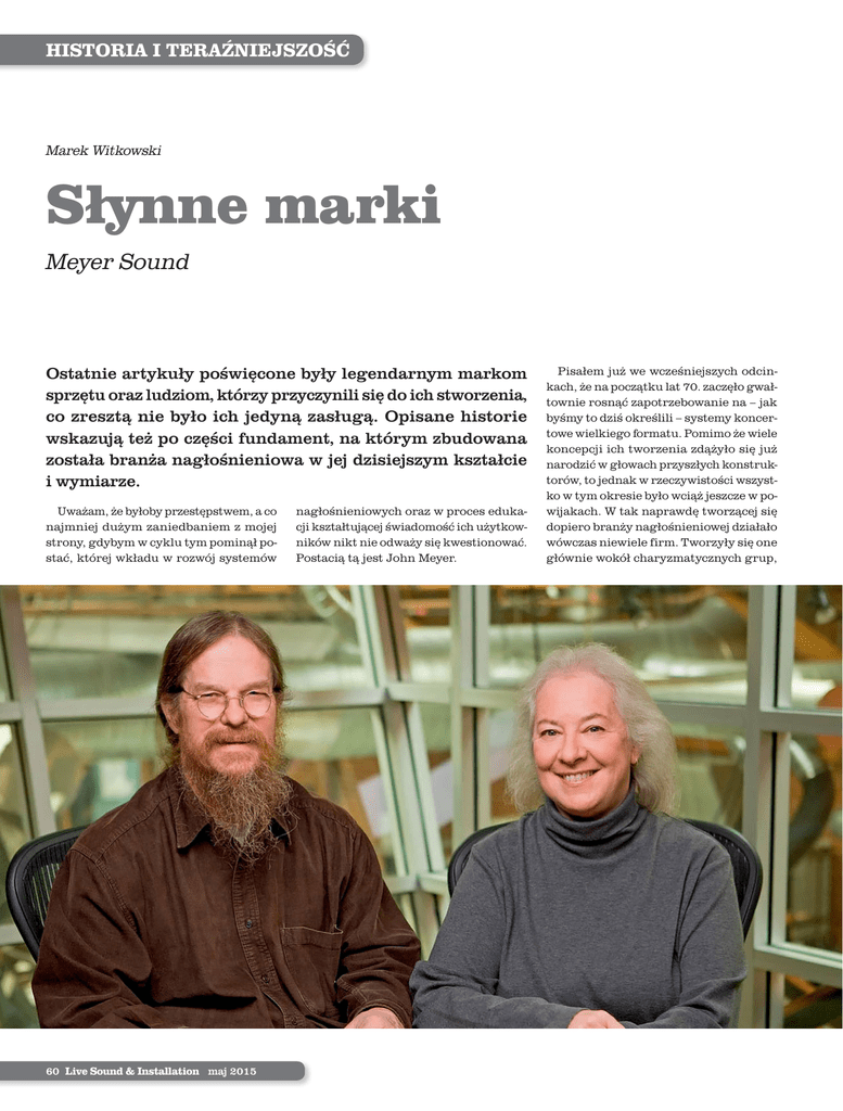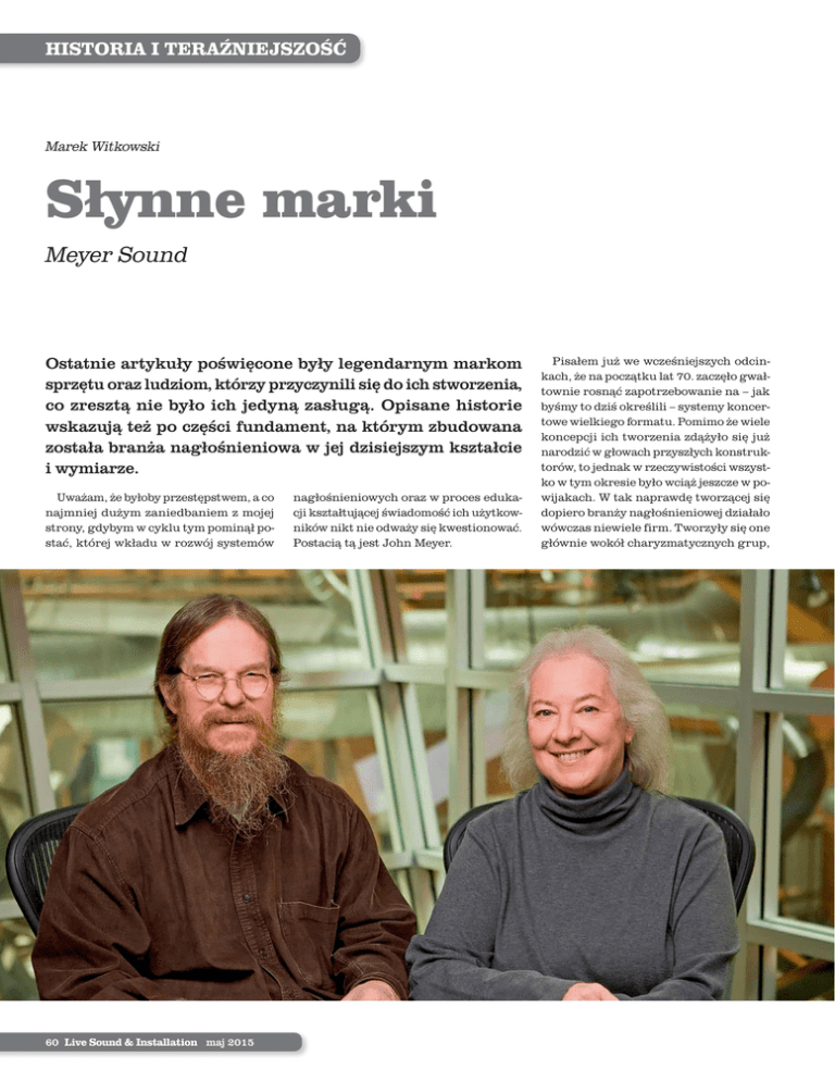 HISTORIA I TERAŹNIEJSZOŚĆ Marek Witkowski Słynne marki Meyer Sound Ostatnie artykuły poświęcone były legendarnym markom sprzętu oraz ludziom, którzy przyczynili się do ich stworzenia, co zresztą nie było ich jedyną zasługą. Opisane historie wskazują też po części fundament, na którym zbudowana została branża nagłośnieniowa w jej dzisiejszym kształcie i wymiarze. Uważam, że byłoby przestępstwem, a co najmniej dużym zaniedbaniem z mojej strony, gdybym w cyklu tym pominął postać, której wkładu w rozwój systemów 60 Live Sound & Installation maj 2015 nagłośnieniowych oraz w proces edukacji kształtującej świadomość ich użytkowników nikt nie odważy się kwestionować. Postacią tą jest John Meyer. Pisałem już we wcześniejszych odcinkach, że na początku lat 70. zaczęło gwałtownie rosnąć zapotrzebowanie na – jak byśmy to dziś określili – systemy koncertowe wielkiego formatu. Pomimo że wiele koncepcji ich tworzenia zdążyło się już narodzić w głowach przyszłych konstruktorów, to jednak w rzeczywistości wszystko w tym okresie było wciąż jeszcze w powijakach. W tak naprawdę tworzącej się dopiero branży nagłośnieniowej działało wówczas niewiele firm. Tworzyły się one głównie wokół charyzmatycznych grup, SŁYNNE MARKI Jedna z pierwszych konstrukcji Johna Meyera – system Glyph. zyskujących coraz większą popularność, a co za tym idzie grających coraz więcej koncertów dla coraz liczniejszej widowni. Dostępne wówczas zespoły głośnikowe, takie jak na przykład WEM czy RCA „W”, były nieporęczne w warunkach regularnej trasy koncertowej – głównie z racji swoich rozmiarów oraz ciężaru. Nie ma w tym nic dziwnego, gdyż były to bardzo często zestawy konstruowane dla potrzeb kinowych, więc nikt nie brał pod uwagę tego, że ktokolwiek zechce je regularnie przemieszczać z miejsca na miejsce. Równie istotnym mankamentem tych konstrukcji okazało się w krótkim czasie także i to, że przestały być one wystarczająco skutecznym narzędziem do realizacji koncertów dla dużej liczby uczestników na otwartej przestrzeni. Co więcej, działanie tego zaadoptowanego do nowej sytuacji sprzętu było swego rodzaju loterią, gdyż wiele ekip technicznych po prostu nie wiedziało w jaki sposób odpowiednio dobrać konfigurację wzmacniaczy i zespołów głośnikowych. Przez długi okres czasu niezawodność działania systemów nagłośnieniowych była więc niespełniającym się marzeniem obsługujących je ekip, artystów, no i oczywiście słuchaczy, gdyż wiele koncertów było przerywanych lub też przedwcześnie kończonych właśnie z powodu awarii nagłośnienia. Pamiętam również u nas takie czasy, gdy bez podręcznego warsztatu (w dosłownym znaczeniu), bogato zaopatrzonego w zapas tranzystorów i „elektrolitów”, dobrą lutownicę oraz kilogramy cyny, a także serwisanta, który najczęściej był jednocześnie konstruktorem używanych przez firmę wzmacniaczy, żadna z ekip nagłośnieniowych nie ryzykowała wyruszenia na festiwal lub w trasę koncertową, których – pomimo siermiężnych warunków – znacznie więcej niż obecnie się w kraju wówczas grywało. Praktycznie żadna z firm w tworzącej się powoli branży nagłośnieniowej w Stanach i UK nie myślała o tym, by swoją przyszłość budować przede wszystkim na własnym doświadczeniu i oprzeć ją głównie na bazie własnego sprzętu w postaci mikserów, zespołów głośnikowych oraz pozostałej, niezbędnej elektroniki. Inną sprawą jest to, że bogatego doświadczenia w tej materii nikt wówczas jeszcze nie posiadał. Na to potrzeba było czasu oraz wielu, niekiedy bardzo dramatycznych, sytuacji. Jednymi z pierwszych, którzy przyjęli taką właśnie politykę działania, byli bracia Roy i Gene Clair. Założona przez nich w Stanach w latach 60-tych „garażowa firma”, nazwana od ich nazwiska Clair Brothers, ma dziś swoje oddziały na całym świecie. Do dziś też konsekwentnie realizuje przyjęte przed laty założenie, opierając się na projektowanych samodzielnie systemach, oznaczonych własnym logo. Dziś jest to już legenda wśród firm nagłośnieniowych, o wyjątkowo barwnej historii i wręcz niewyobrażalnie bogatym dorobku. Być może w niedługim czasie wrócę również i do tego tematu. SZCZĘŚLIWY TRAF Firma McCune Sound Service z San Francisco była jedną z nielicznych wówczas firm usiłujących mierzyć się z wyzwaniem tworzenia dużych, nowoczesnych – jak na owe czasy – systemów nagłośnieniowych. Kiedy McCune usłyszał po raz pierwszy w miejscowym klubie unikalny system nagłośnieniowy o nazwie „Glyph”, nie miał żadnych wątpliwości co do tego, że powinien natychmiast zatrudnić jego konstruktora, by ten projektował systemy nagłośnieniowe dla jego firmy. Konstruktorem tym był młody, nie znany bliżej nikomu entuzjasta elektroakustyki, a jak się miało w niedługim czasie okazać, również ukryty geniusz w tej dziedzinie – John Meyer. UPORZĄDKUJMY NIECO CHRONOLOGIĘ John Meyer przygodę z dźwiękiem rozpoczął bardzo wcześnie – właściwie będąc jeszcze dzieckiem. Zainteresowanie zagadnieniami dotyczącymi tej dziedziny rozbudził w nim wuj, który pracował „przy dźwięku” w wytwórni Disneya. Później zdarzyła się przygoda z lokalną stacją radiową, gdzie jako 12-letni chłopiec uzyskał pierwszą zawodową licencję. W okresie nauki w Oakland High School John wciąż rozwijał swoje Wczesny zestaw Meyer Sound na koncercie The Grateful Dead. maj 2015 Live Sound & Installation 61 zainteresowania elektroniką i dźwiękiem, budując niewielkie konsolety mikserskie. Jednak tym, co zdecydowało o związaniu przyszłości z systemami nagłośnieniowymi był dzień, w którym Steve Miller zwrócił się do Johna z prośbą o zaprojektowanie zestawu nagłośnieniowego dla basisty z jego zespołu. Zestaw ten miał być użyty podczas (legend