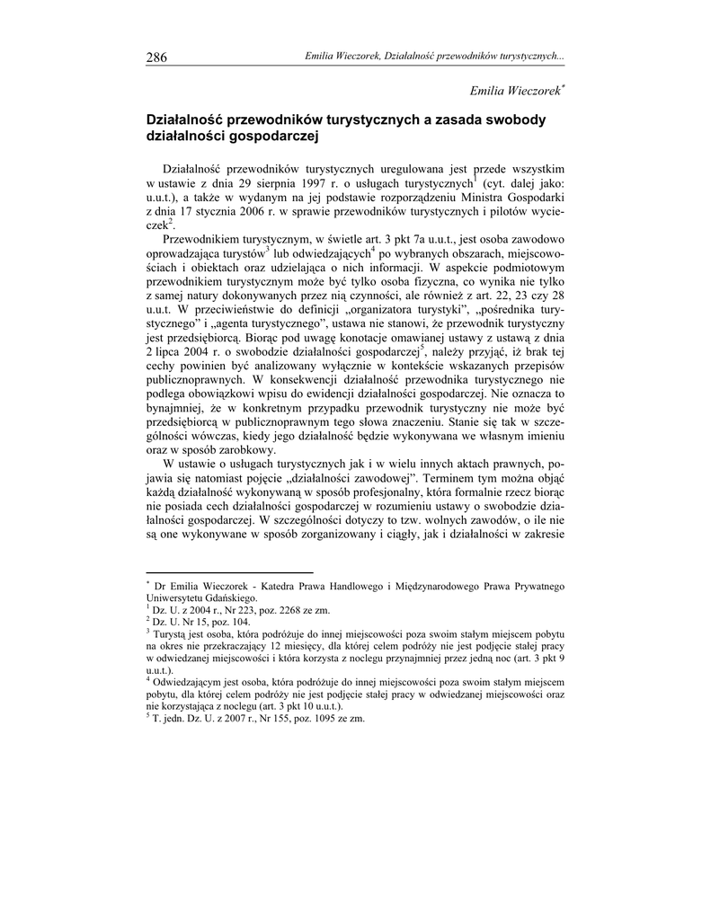286 Emilia Wieczorek, Działalność przewodników turystycznych... Emilia Wieczorek∗ Działalność przewodników turystycznych a zasada swobody działalności gospodarczej Działalność przewodników turystycznych uregulowana jest przede wszystkim w ustawie z dnia 29 sierpnia 1997 r. o usługach turystycznych1 (cyt. dalej jako: u.u.t.), a także w wydanym na jej podstawie rozporządzeniu Ministra Gospodarki z dnia 17 stycznia 2006 r. w sprawie przewodników turystycznych i pilotów wycieczek2. Przewodnikiem turystycznym, w świetle art. 3 pkt 7a u.u.t., jest osoba zawodowo oprowadzająca turystów3 lub odwiedzających4 po wybranych obszarach, miejscowościach i obiektach oraz udzielająca o nich informacji. W aspekcie podmiotowym przewodnikiem turystycznym może być tylko osoba fizyczna, co wynika nie tylko z samej natury dokonywanych przez nią czynności, ale również z art. 22, 23 czy 28 u.u.t. W przeciwieństwie do definicji „organizatora turystyki”, „pośrednika turystycznego” i „agenta turystycznego”, ustawa nie stanowi, że przewodnik turystyczny jest przedsiębiorcą. Biorąc pod uwagę konotacje omawianej ustawy z ustawą z dnia 2 lipca 2004 r. o swobodzie działalności gospodarczej5, należy przyjąć, iż brak tej cechy powinien być analizowany wyłącznie w kontekście wskazanych przepisów publicznoprawnych. W konsekwencji działalność przewodnika turystycznego nie podlega obowiązkowi wpisu do ewidencji działalności gospodarczej. Nie oznacza to bynajmniej, że w konkretnym przypadku przewodnik turystyczny nie może być przedsiębiorcą w publicznoprawnym tego słowa znaczeniu. Stanie się tak w szczególności wówczas, kiedy jego działalność będzie wykonywana we własnym imieniu oraz w sposób zarobkowy. W ustawie o usługach turystycznych jak i w wielu innych aktach prawnych, pojawia się natomiast pojęcie „działalności zawodowej”. Terminem tym można objąć każdą działalność wykonywaną w sposób profesjonalny, która formalnie rzecz biorąc nie posiada cech działalności gospodarczej w rozumieniu ustawy o swobodzie działalności gospodarczej. W szczególności dotyczy to tzw. wolnych zawodów, o ile nie są one wykonywane w sposób zorganizowany i ciągły, jak i działalności w zakresie Dr Emilia Wieczorek - Katedra Prawa Handlowego i Międzynarodowego Prawa Prywatnego Uniwersytetu Gdańskiego. 1 Dz. U. z 2004 r., Nr 223, poz. 2268 ze zm. 2 Dz. U. Nr 15, poz. 104. 3 Turystą jest osoba, która podróżuje do innej miejscowości poza swoim stałym miejscem pobytu na okres nie przekraczający 12 miesięcy, dla której celem podróży nie jest podjęcie stałej pracy w odwiedzanej miejscowości i która korzysta z noclegu przynajmniej przez jedną noc (art. 3 pkt 9 u.u.t.). 4 Odwiedzającym jest osoba, która podróżuje do innej miejscowości poza swoim stałym miejscem pobytu, dla której celem podróży nie jest podjęcie stałej pracy w odwiedzanej miejscowości oraz nie korzystająca z noclegu (art. 3 pkt 10 u.u.t.). 5 T. jedn. Dz. U. z 2007 r., Nr 155, poz. 1095 ze zm. ∗ Turystyka a prawo. Aktualne problemy legislacyjne i konstrukcyjne. 287 wykonywania władzy publicznej6. Cecha zawodowego charakteru prowadzonej działalności znalazła swój wyraz w art. 431 k.c., który zawiera definicję przedsiębiorcy sformułowaną na użytek całego prawa prywatnego7. Mimo iż zakres wskazanej definicji jest szerszy aniżeli w przypadku powołanej wyżej ustawy publicznoprawnej, to jednak przesłanka odwołująca się do wykonywania działalności we własnym imieniu powoduje, iż w znaczeniu tam przyjętym przewodnik turystyczny nie w każdym przypadku będzie przedsiębiorcą. Działalność przewodnika turystycznego nie jest reglamentowana w sposób przewidziany w ustawie o swobodzie działalności gospodarczej - jego działalność nie wymaga uzyskania koncesji, zezwolenia czy licencji, ani też nie jest to działalność regulowana. Tą ostatnią jest działalność gospodarcza, której wykonywanie wymaga spełnienia szczególnych warunków, określonych przepisami prawa i po uzyskaniu wpisu do określonego rejestru działalności regulowanej. Instytucja działalności regulowanej stanowi novum w polskim prawie dotyczącym podejmowania i prowadzenia działalności gospodarczej. Jest to forma zliberalizowanej w stosunku do zezwoleń reglamentacji działalności gospodarczej. Przedsiębiorca nie musi bowiem uzyskać zgody odpowiedniego organu na podjęcie i prowadzenie działalności reglamentowanej. Przesłanką podjęcia takiej działalności jest spełnienie szczególnych warunków wskazanych w przepisach prawnych oraz uzyskanie wpisu do rejestru działalności regulowanej. Spełnienie tych warunków podlega jednak kontroli i w tym sensie działalność ta jest działalnością reglamentowaną. O statusie działalności gospodarczej jako działalności regulowanej decyduje wyłącznie ustawa. Status ten musi być określony wyraźnie, w przeciwnym razie dany rodzaj działalności gospodarczej nie należy do działalności regulowanej8. Od działalności regulowanej należy odróżnić instytucję zawodu regulowanego. Pojęciem takim posługuje się ustawa z dnia 26 kwietnia 2001 r. o zasadach uznawania nabytych w państwach członkowskich Unii Europejskiej kwalifikacji do wykonywania zawodów regulowanych9. Na podstawie art. 15 ustawy o zawodach regulowanych zostało wydane rozporządzenie Ministra Gospodarki i Pracy z dnia 7 października 2005 r. w sprawie stażu adaptacyjnego i testu umiejętności przeprowadzanych w toku postępowania o uznanie kwalifikacji do wykonywania zawodu przewodnika turystycznego10. W świetle art. 1 ust. 2 tejże ustawy zawodem regulowanym jest zawód, którego wykonywanie jest uzależnione od spełnienia wymagań kwalifikacyjnych i warunków określonych w odrębnych przepisach, zwanych „przepisami regulacyjnymi”. Do przepisów takich należy ustawa o usługach turystycznych. Zawód regulo