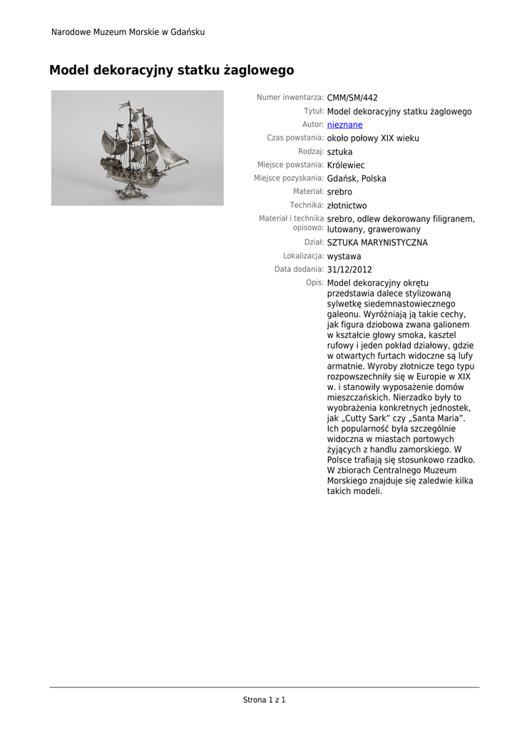 Narodowe Muzeum Morskie w Gdańsku Model dekoracyjny statku żaglowego Numer inwentarza: CMM/SM/442 Tytuł: Model dekoracyjny statku żaglowego Autor: nieznane Czas powstania: około połowy XIX wieku Rodzaj: sztuka Miejsce powstania: Królewiec Miejsce pozyskania: Gdańsk, Polska Materiał: srebro Technika: złotnictwo Materiał i technika srebro, odlew dekorowany filigranem, opisowo: lutowany, grawerowany Dział: SZTUKA MARYNISTYCZNA Lokalizacja: wystawa Data dodania: 31/12/2012 Opis: Model dekoracyjny okrętu przedstawia dalece stylizowaną sylwetkę siedemnastowiecznego galeonu. Wyróżniają ją takie cechy, jak figura dziobowa zwana galionem w kształcie głowy smoka, kasztel rufowy i jeden pokład działowy, gdzie w otwartych furtach widoczne są lufy armatnie. Wyroby złotnicze tego typu rozpowszechniły się w Europie w XIX w. i stanowiły wyposażenie domów mieszczańskich. Nierzadko były to wyobrażenia konkretnych jednostek, jak „Cutty Sark” czy „Santa Maria”. Ich popularność była szczególnie widoczna w miastach portowych żyjących z handlu zamorskiego. W Polsce trafiają się stosunkowo rzadko. W zbiorach Centralnego Muzeum Morskiego znajduje się zaledwie kilka takich modeli. Strona 1 z 1