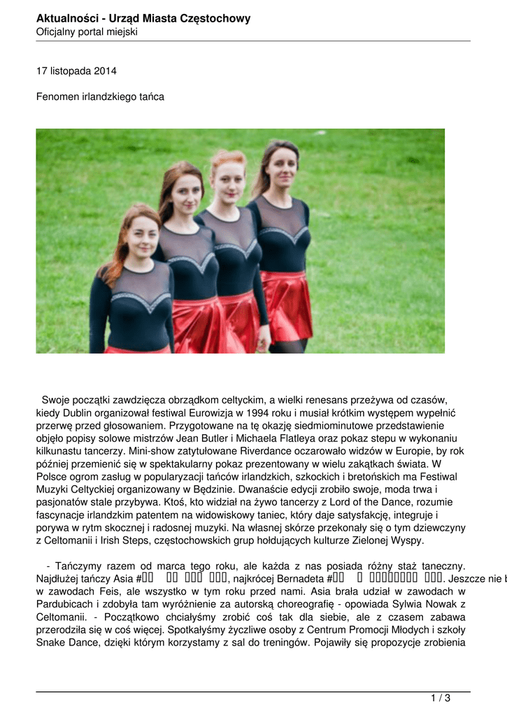 Aktualności - Urząd Miasta Częstochowy Oficjalny portal miejski 17 listopada 2014 Fenomen irlandzkiego tańca Swoje początki zawdzięcza obrządkom celtyckim, a wielki renesans przeżywa od czasów, kiedy Dublin organizował festiwal Eurowizja w 1994 roku i musiał krótkim występem wypełnić przerwę przed głosowaniem. Przygotowane na tę okazję siedmiominutowe przedstawienie objęło popisy solowe mistrzów Jean Butler i Michaela Flatleya oraz pokaz stepu w wykonaniu kilkunastu tancerzy. Mini-show zatytułowane Riverdance oczarowało widzów w Europie, by rok później przemienić się w spektakularny pokaz prezentowany w wielu zakątkach świata. W Polsce ogrom zasług w popularyzacji tańców irlandzkich, szkockich i bretońskich ma Festiwal Muzyki Celtyckiej organizowany w Będzinie. Dwanaście edycji zrobiło swoje, moda trwa i pasjonatów stale przybywa. Ktoś, kto widział na żywo tancerzy z Lord of the Dance, rozumie fascynacje irlandzkim patentem na widowiskowy taniec, który daje satysfakcję, integruje i porywa w rytm skocznej i radosnej muzyki. Na własnej skórze przekonały się o tym dziewczyny z Celtomanii i Irish Steps, częstochowskich grup hołdujących kulturze Zielonej Wyspy. - Tańczymy razem od marca tego roku, ale każda z nas posiada różny staż taneczny. Najdłużej tańczy Asia #℣佐⌡⌀ 氀愀琀⌡⍃倣℣, najkrócej Bernadeta #℣佐⌡⌀㜀 洀椀攀猀椁ᤀ挀礀⌡⍃倣℣. Jeszcze nie b w zawodach Feis, ale wszystko w tym roku przed nami. Asia brała udział w zawodach w Pardubicach i zdobyła tam wyróżnienie za autorską choreografię - opowiada Sylwia Nowak z Celtomanii. - Początkowo chciałyśmy zrobić coś tak dla siebie, ale z czasem zabawa przerodziła się w coś więcej. Spotkałyśmy życzliwe osoby z Centrum Promocji Młodych i szkoły Snake Dance, dzięki którym korzystamy z sal do treningów. Pojawiły się propozycje zrobienia 1/3 Aktualności - Urząd Miasta Częstochowy Oficjalny portal miejski pokazu, poprowadzenia zajęć dla dzieci. Zajęcia tańca irlandzkiego charakteryzują się wysoką intensywnością. Doświadczone tancerki z Irish Steps, grupy funkcjonującej już od 9 lat, zgodnie przyznają, że to bardzo wymagający taniec. - Najważniejsza jest technika. To bardziej jak wysiłkowy sport, ale nie można się zrażać, poza tym są zabawy, a na początek wystarczy poczucie rytmu – komentuje Sara Nabrdalik. - Podstawa to „przekrzyżowane” nogi i obciągnięte stopy jak w balecie, wyprostowana sylwetka, ręce wzdłuż tułowia. Pomimo dużego wysiłku utrzymujemy prostą postawę, a na twarzy maluje się uśmiech, co nadaje lekkości temu tańcu. To twardzielki. Nierzadko trening kończyły w opatrunku czy bandażu, ale żadna nie dała po sobie nic poznać. To pewnie dzięki dobroczynnemu wpływowi głównej siły napędzającej, czyli dzięki muzyce – jak same tancerki dopowiadają – innej niż wszystkie. Sam wysiłek i płynąca z niego radość działa na każdą w sposób niemal uzależniający. - Dobór muzyki ma duże znaczenie, ale najważniejsze, żeby tańczyć równo, wtedy powstaje w grupie więź. To daje satysfakcję, wspólna praca nad choreografią i układami, a później niemal wyczynowe ich wykonywanie – przyznaje Sylwia Nowak. - W Irish Steps porządek i dyscyplina odgrywają kluczową rolę. Wzajemnie się pilnujemy, bo każdemu zależy na jak najlepszych występach - mówi Anna Szumilewicz. - Same układamy choreografię, szyjemy stroje. Część rzeczy musi zostać kupiona, jak na przykład specjalne buty do stepu czy baletki irlandzkie. Irish Steps ma na swoim koncie cztery medale i dwa tzw. awanse dla Sary i Ani w Międzynarodowych Zawodach Tańca Irlandzkiego Prague Feis 2014. Udział w tak profesjonalnym konkursie to sukces, ale wiele radości przynoszą pokazy z różnych okazji, choćby Dnia Świętego Patryka #℣佐⌡⌀瀀愀琀爀漀渀愀 䤀爀氀愀渀搀椀椀⌡⍃倣℣, Nocy Kulturalnej, finału Wielkiej Orkies Świątecznej Pomocy, Dnia Dziecka czy wielu imprezach charytatywnych. Będą gościły w Łodzi na festiwalu Offbeer, a w tym miesiącu wybierają się na Międzynarodowy Dzień Stoutu, bo jak wiadomo Irlandia nie samym tańcem żyje. Celtomania dawała pokazy w klubach „Ironia” i „Carpe Diem” oraz na Festiwalu Sztuki L’art. w Lubartowie. Tańczyły podczas zakończenia roku tanecznego Snake Dance i Nocy Kulturalnej, zorganizowały kameralne Ceili, prowadziły zabawy i warsztaty taneczne w CPM i Stowarzyszeniu Przyjaciół Gaude Mater. Wiele grup tańca irlandzkiego stara się wyróżnić swoim stylem, dlatego dokładają do niego elementy innych tradycji i gatunków muzycznych, na przykład baletu, tango czy polskiego folka. Celtomania łączy rocka, a w przygotowaniu fuzja z salsą, flamenco, step do poezji Tuwima oraz inne nietypowe niespodzianki. Z kolei Irish Steps wymyka się konwencji, upatrując oryginalności w arabskim tańcu brzucha. Obie grupy nie są sformalizowane, nie pobierają żadnych opłat za ćwiczenia, nastawione są 2/3 Aktualności - Urząd Miasta Częstochowy Oficjalny portal miejski także na poszerzanie wiedzy o kulturze celtyckiej, wreszcie obie chcą poszerzyć skład, poszukując zainteresowanych, również wśród płci męskiej. Celtomania straciła dwie osoby, które z miłości do „wyspiarskich” klimatów poniosło aż do Szkocji. - Trudno jest kogoś zwerbować, bo wielu ten taniec wydaje się czymś niszowym, albo wręcz odwrotnie mylą to z kursem tradycyjnego tańca – mówi Sylwia. Ania i Sara zapraszają wciąż nowe osoby na warsztaty, bo w każdej chwili i w każdym wieku można rozpocząć swoją przygodę z tańcem irlandzkim. Bezpłatne warsztaty tańca irlandzkiego dla każdego IRISH STEPS w każdą sobotę w budynku Spółdzielni Mieszkaniowej „Północ” #℣佐⌡⌀甀氀⸀ 圀椀琀漀猀愀 䈀⌡⍃倣℣, go 11.30-13.00. CELTOMANIA w każdy wtorek w Centrum Promocji Młody
