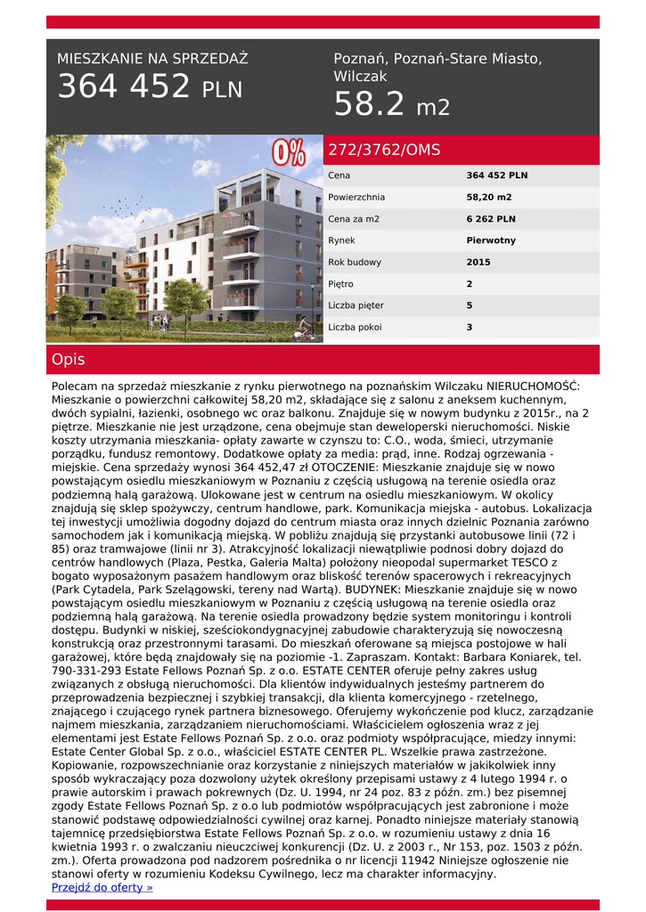 MIESZKANIE NA SPRZEDAŻ 364 452 PLN Poznań, Poznań-Stare Miasto, Wilczak 58.2 m2 272/3762/OMS Cena 364 452 PLN Powierzchnia 58,20 m2 Cena za m2 6 262 PLN Rynek Pierwotny Rok budowy 2015 Piętro 2 Liczba pięter 5 Liczba pokoi 3 Opis Polecam na sprzedaż mieszkanie z rynku pierwotnego na poznańskim Wilczaku NIERUCHOMOŚĆ: Mieszkanie o powierzchni całkowitej 58,20 m2, składające się z salonu z aneksem kuchennym, dwóch sypialni, łazienki, osobnego wc oraz balkonu. Znajduje się w nowym budynku z 2015r., na 2 piętrze. Mieszkanie nie jest urządzone, cena obejmuje stan deweloperski nieruchomości. Niskie koszty utrzymania mieszkania- opłaty zawarte w czynszu to: C.O., woda, śmieci, utrzymanie porządku, fundusz remontowy. Dodatkowe opłaty za media: prąd, inne. Rodzaj ogrzewania miejskie. Cena sprzedaży wynosi 364 452,47 zł OTOCZENIE: Mieszkanie znajduje się w nowo powstającym osiedlu mieszkaniowym w Poznaniu z częścią usługową na terenie osiedla oraz podziemną halą garażową. Ulokowane jest w centrum na osiedlu mieszkaniowym. W okolicy znajdują się sklep spożywczy, centrum handlowe, park. Komunikacja miejska - autobus. Lokalizacja tej inwestycji umożliwia dogodny dojazd do centrum miasta oraz innych dzielnic Poznania zarówno samochodem jak i komunikacją miejską. W pobliżu znajdują się przystanki autobusowe linii (72 i 85) oraz tramwajowe (linii nr 3). Atrakcyjność lokalizacji niewątpliwie podnosi dobry dojazd do centrów handlowych (Plaza, Pestka, Galeria Malta) położony nieopodal supermarket TESCO z bogato wyposażonym pasażem handlowym oraz bliskość terenów spacerowych i rekreacyjnych (Park Cytadela, Park Szelągowski, tereny nad Wartą). BUDYNEK: Mieszkanie znajduje się w nowo powstającym osiedlu mieszkaniowym w Poznaniu z częścią usługową na terenie osiedla oraz podziemną halą garażową. Na terenie osiedla prowadzony będzie system monitoringu i kontroli dostępu. Budynki w niskiej, sześciokondygnacyjnej zabudowie charakteryzują się nowoczesną konstrukcją oraz przestronnymi tarasami. Do mieszkań oferowane są miejsca postojowe w hali garażowej, które będą znajdowały się na poziomie -1. Zapraszam. Kontakt: Barbara Koniarek, tel. 790-331-293 Estate Fellows Poznań Sp. z o.o. ESTATE CENTER oferuje pełny zakres usług związanych z obsługą nieruchomości. Dla klientów indywidualnych jesteśmy partnerem do przeprowadzenia bezpiecznej i szybkiej transakcji, dla klienta komercyjnego - rzetelnego, znającego i czującego rynek partnera biznesowego. Oferujemy wykończenie pod klucz, zarządzanie najmem mieszkania, zarządzaniem nieruchomościami. Właścicielem ogłoszenia wraz z jej elementami jest Estate Fellows Poznań Sp. z o.o. oraz podmioty współpracujące, miedzy innymi: Estate Center Global Sp. z o.o., właściciel ESTATE CENTER PL. Wszelkie prawa zastrzeżone. Kopiowanie, rozpowszechnianie oraz korzystanie z niniejszych materiałów w jakikolwiek inny sposób wykraczający poza dozwolony użytek określony przepisami ustawy z 4 lutego 1994 r. o prawie autorskim i prawach pokrewnych (Dz. U. 1994, nr 24 poz. 83 z późn. zm.) bez pisemnej zgody Estate Fellows Poznań Sp. z o.o lub podmiotów współpracujących jest zabronione i może stanowić podstawę odpowiedzialności cywilnej oraz karnej. Ponadto niniejsze materiały stanowią tajemnicę przedsiębiorstwa Estate Fellows Poznań Sp. z o.o. w rozumieniu ustawy z dnia 16 kwietnia 1993 r. o zwalczaniu nieuczciwej konkurencji (Dz. U. z 2003 r., Nr 153, poz. 1503 z późn. zm.). Oferta prowadzona pod nadzorem pośrednika o nr licencji 11942 Niniejsze ogłoszenie nie stanowi oferty w rozumieniu Kodeksu Cywilnego, lecz ma charakter informacyjny. Przejdź do oferty » Barbara Koniarek tel. +48 790 331 293 email: [email protected] NINIEJSZE WARUNKI MAJĄ CHARAKTER INFORMACYJNY ORAZ NIE STANOWIĄ OFERTY ZAWARCIA JAKIEJKOLWIEK UMOWY W ROZUMIENIU PRZEPISÓW USTAW Z DNIA 23 KWIETNIA 1964 ROKU KODEKS CYWILNY (DZ.U. Z 1964 ROKU, NR 16, POZ. 93 Z PÓŹNIEJSZYMI ZMIANAMI. Powered by TCPDF (www.tcpdf.org)