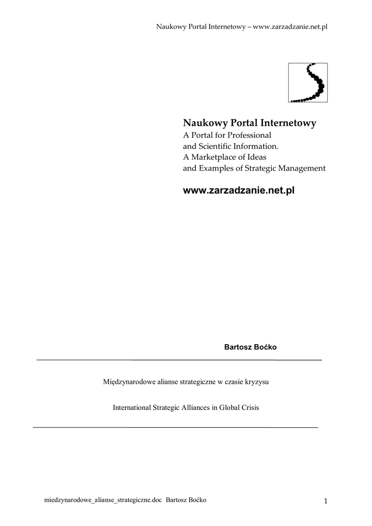 Naukowy Portal Internetowy – www.zarzadzanie.net.pl Naukowy Portal Internetowy A Portal for Professional and Scientific Information. A Marketplace of Ideas and Examples of Strategic Management www.zarzadzanie.net.pl Bartosz Boćko Międzynarodowe alianse strategiczne w czasie kryzysu International Strategic Alliances in Global Crisis miedzynarodowe_alianse_strategiczne.doc Bartosz Boćko 1 Naukowy Portal Internetowy – www.zarzadzanie.net.pl COPYRIGHT © Bartosz Boćko 2005 – 2010 Naukowy Portal Internetowy. A Portal for Professional and Scientific Information Kopiowanie, przedrukowywanie, rozpowszechnianie całości bez zgody autora zabronione. Kontakt: [email protected] ACKNOWLEDGMENT This work printed in Economics and Organization of Enterprise no 10 (717) X.2009, Institute of Organization and Management in Industry “ORGMASZ”, Warszawa 2009. Boćko B., Międzynarodowe alianse strategiczne w czasie kryzysu, Ekonomika i organizacja przedsiębiorstw, nr 10 (717), Instytut Organizacji i Zarządzania ORGMASZ, Warszawa 2009. DISCLAIMER The information is provided for informational, scientific, or educational purposes only. It is not intended to present the only, or necessarily best methods or procedures discussed in the Portal www.zarzadzanie.net.pl, but rather is intended to represent and statement, approach or opinion of the author(s) which may be helpful to others who face similar problems or business cases. This document may change without notice. miedzynarodowe_alianse_strategiczne.doc Bartosz Boćko 2 Naukowy Portal Internetowy – www.zarzadzanie.net.pl Wprowadzenie Optymalny dobór partnerów, poprawnie zaprojektowane funkcje, struktury, zadania i zasady zarządzania wiedzą w aliansie strategicznym decydują o jego sukcesie. Jednak powodzenie aliansu na płaszczyźnie geopolitycznej, jak również gospodarczej w czasie kryzysu jest zdecydowanie trudniejsze do osiągnięcia. Pomimo odpowiednio zaprojektowanej i realizowanej współpracy przedsiębiorstwa – alianci nie osiągają zakładanych celów. Współpraca międzynarodowa państw, instytucji pozarządowych, przedsiębiorstw w czasie kryzysu wymaga nowych umiejętności, wiedzy, sposobów komunikacji. Niniejsze opracowanie prezentuje wybrane przykłady międzynarodowych aliansów w kontekście złożonych powiązań w dobie kryzysu. Autor postara się odpowiedzieć na następująco postawione pytanie: Jaki może być zakres działania i zakres wpływu państwowych funduszy majątkowych oraz firm lobbystycznych na pozycję konkurencyjną partnerów aliansu w czasie kryzysu? Nowe instrumenty rywalizacji rynkowej Obserwacje ostatnich lat związane z działalnością rządów Stanów Zjednoczonych, Niemiec, Wielkiej Brytanii, aby wymienić tylko niektóre, pokazują zwiększającą się rolę państwa w gospodarce tych krajów. Jest to charakterystyczne dla wysoko kapitałochłonnych dziedzinach: przemyśle petrochemicznym, energetyce, przemyśle wydobywczym, przemyśle zbrojeniowym, przemyśle samochodowym, produkcji sprzętu maszynowego, telekomunikacji przemyśle lotniczym (I. Bremmen 2009, s.42). Przedsiębiorstwa europejskie na tle konkurencji ze Stanów Zjednoczonych i Japonii charakteryzują się niskim poziomem innowacyjności. Ten relatywnie niski poziom spowodował, iż Komisja Europejska rekomenduje powiązania publiczno-prywatne jako element stymulacji rozwoju nowych przedsięwzięć.. Wsparcie dla przedsiębiorstw poprzez rządowe działania stymulujące takie jak: kredytowanie, budowanie kontaktów międzynarodowych, przyznawanie bezzwrotnych dotacji ma spowodować, że sytuacja miedzynarodowe_alianse_strategiczne.doc Bartosz Boćko 3 Naukowy Portal Internetowy – www.zarzadzanie.net.pl Europy a w szczególności pozycja Polski na rynkach światowych ma się poprawić. Według raportu Unii Europejskiej z 2004 roku pt. „Wzrost intensywności działalności B+R w UE” (eng.: Rasing EU R&D Intensity), jak również zgodnie z sugestiami Banku Światowego (2004), Polska powinna skorzystać z bezpośrednich i pośrednich instrumentów stymulujących działalność innowacyjną, poprzez którą firmy będą mogły się rozwijać. Do tego typu instrumentów należą: przywileje i ulgi podatkowe, pożyczki, gwarancje, zamówienia rządowe środki finansowe funduszy wysokiego ryzyka (venture capital). Doświadczenie instytucji państwowych i pośredniczących w tym państwowych funduszy majątkowych, firm lobbingowych, wpływa na zmianę pozycji konkurencyjnej całych gospodarek. Dla zobrazowania tych powiązań w tab. 1 zostały wymienione tylko niektóre organizacje światowego biznesu, których powiązania z rządami państw umożliwiają im szybszy rozwój i sukces gospodarczy. Tabela 1 Przedsiębiorstwa międzynarodowe i ich powiązania Strony powiązań Rola państwa Przemysł Gazprom & ENI Rosja – Włochy Wsparcie Rosji w zakresie udzielenia Paliwowy & Gazprom Neft pożyczki dla firmy Gazprom na Nazwa przedsiębiorstwa realizację opcji zakupu akcji firmy Gazprom Neft od firmy ENI (2009) Airbus (Alians Niemcy, Francja, Rząd Wielkiej Brytanii udziela MBB, Hiszpania, wsparcia w zakresie pożyczek na Aerospatiale, Wielka Brytania utrzymanie miejsc pracy w firmie CASA, British Przemysł lotniczy Airbus (2009) Aerospace) Tata & Land Rover Jaguar Indie – Wielka Wsparcie firmy Tata przez rząd w Przemysł Brytania Wielkiej Brytanii w zakresie samochodowy, gwarancji w spłacie pożyczki na komputerowy restrukturyzację firmy Jaguar Land Rover (2009) miedzynarodowe_alianse_strategiczne.doc Bartosz Boćko 4 Naukowy Portal Internetowy – www.zarzadzanie.net.pl Siemens & Niemcy – Rosja Współpraca w zakresie budowy 50 elektrowni Rosatom jądrowych na Przemysł całym jądrowy, świecie (2009) AeroJet & NEC Japonia – USA Współpraca w zakresie prac nad Przemysł zastosowaniem Microwave Ion kosmiczny Engine (2009) Boeing & Iridium USA Współpraca w zakresie opracowania Przemysł Satellite LLC systemu zlecen