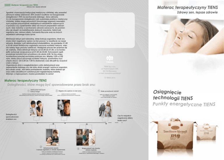 Materac terapeutyczny TIENS Materac terapeutyczyny TIENS Zdrowy sen, lepsze zdrowie Zdrowy sen, lepsze zdrowie Zgodnie z koncepcją tradycyjnej medycyny chińskiej, aby pozostać zdrowym należy skierować 30% swoich wysiłków na korygowanie dolegliwości i 70% na zachowanie dobrego stanu zdrowia. Co do korygowania dolegliwości, jak wyjaśniają praktycy medycyny chińskiej, ludzie mogą przywrócić równowagę organom wewnętrznym poprzez przyswajanie niezbędnych składników odżywczych z żywności czy suplementów diety lub innych preparatów naturalnych. Gdy mówimy o zachowaniu zdrowia oznacza to, że powinniśmy się skupić na kształtowaniu dobrych nawyków, takich jak regularny sen, zdrowa dieta, ćwiczenia fizyczne oraz na innych aspektach zdrowego trybu życia. Eliminacja toksyn jest naturalną, stałą funkcją organizmu. Brak snu może mieć negatywny wpływ na ten proces i w rezultacie na nasze zdrowie. Badając cykl detoksykacji stwierdziliśmy, że pomiędzy 21.00 a 23.00 układ limfatyczny organizmu zaczyna wydalać toksyny, więc nie należy tego procesu zakłócać. Następnie proces ten przenosi się do wątroby, która eliminuje toksyny od 23.00 do 01.00, a na koniec jelito wykonuje swoją pracę od 01.00 do 03.00. Tymczasem szpik produkuje komórki krwi od północy do około 4.00. Te trzy etapy wymienione powyżej zachodzą podczas snu. Między 3.00 a 5.00 rano, kiedy płuca zaczynają wydalać toksyny, powinniśmy być ciepło okryci. Od 5.00 do 7.00 to doskonały czas dla jelit by oczyścić ciało z toksyn. Organizacja dnia z uwzględnieniem cyklu detoksykacji oraz zapewnienie dobrego snu nie tylko doda energii i wzmocni organizm, lecz doda urody. Jest takie powiedzenie: kobieta, która dobrze śpi oraz unika szkodliwych substancji jest najpiękniejszą kobietą. Mówiąc o mężczyznach, można powiedzieć to samo! TIENS Sp. z o.o. ul. Podchorążych 39A 00-722 Warszawa e-mail: [email protected] Ⓡ TIENS 2014 Materac terapeutyczny TIENS Dolegliwości, które mogą być spowodowane przez brak snu: ① Zakłócenie twórczych funkcji mózgu brak snu narusza zdolność właściwej oceny sytuacji oraz podejmowania decyzji, czasem powodując utratę pamięci ③ Negatywnie wpływa na stan skóry brak snu wpływa na koloryt skóry i przyspiesza powstawanie zmarszczek ⑤ Może powodować otyłość brak snu potęguje uczucie głodu, więc zwiększony apetyt może doprowadzić do otyłości Dolegliwości spowodowane brakiem snu Czy to wszystkie negatywne efekty braku snu? ② Zahamowanie wzrostu i rozwoju organizmu w okresie dojrzewania brak snu zmniejsza wydzielanie hormonu wzrostu i wpływa na prawidłowy rozwój, co skutkuje obniżeniem IQ i zakłóceniem wzrostu ④ Mogą pojawić się choroby układu krążenia brak snu może powodować rozwój chorób serca, nadciśnienia tętniczego i cukrzycy Materac terapeutyczny TIENS Zdrowy sen, lepsze zdrowie Opis produktu Opracowany z uwzględnieniem zasad tradycyjnej medycyny chińskiej oraz teorii głównych i dodatkowych kanałów, materac terapeutyczny TIENS liczy 108 punktów energetycznych w wersji jednoosobowej i 156 w dwuosobowej, uwalniających energię magnetyczną, energię podczerwieni oraz jony ujemne (aby komórki ciała prawidłowo funkcjonowały i były odpowiednio dotlenione). Ponadto produkt zawiera włókna z ujemnymi jonami oraz naturalne bambusowe włókna węglowe. Dopasowane do kształtu ludzkiego ciała Materace terapeutyczne TIENS, są opracowane z myślą o zachowaniu równowagi biologicznego pola magnetycznego człowieka, łagodzeniu zmęczenia, poprawie snu, zwiększeniu odporności i uzupełnianiu innych funkcji. Dzięki nim otrzymujemy zapas energii na 24 godziny. Spokojny sen, wspomagający serce i ciało, to łatwy sposób na poprawę zdrowia! Funkcje produktu i struktura Druga warstwa bawełna wzbogacona w jony ujemne, oddziałujące na punkty energetyczne W tej warstwie, sproszkowany, rzadki, naturalny turmalin jest wpleciony we włókna za pomocą zaawansowanej technologii tak, aby wydzielać dużą ilość jonów ujemnych oraz fal podczerwieni. Materac terapeutyczny TIENS ma unikatową budowę, składającą się z sześciu warstw: Pierwsza warstwa trójwymiarowa dzianina żakardowa Wierzchnia warstwa materaca wykonana jest z dzianiny żakardowej. Jest gładka, przyjemna w dotyku i nie elektryzuje się. Zalecany dla tych, którzy: Potrzebują poprawy jakości snu. Mają pogorszony stan zdrowia. Chcą poprawić jakość życia. Nie jest zalecany dla tych, którzy: Cierpią na poważne nadciśnienie i choroby serca. W przypadku takich dolegliwości, przed użyciem należy skonsultować się z lekarzem. Jak to działa? Materac terapeutyczny TIENS wprowadza w życie teorię Huangdi zawartą w klasycznym tekście medycyny chińskiej – zimna głowa plus nogi w cieple równa się dobry sen. Działanie punktów energetycznych TIENS ma podłoże naukowe: zebrany rozproszony magnetyzm wnika do ciała i oddziałuje na punkty akupunkturowe pleców i kończyn. Silny rezonans magnetyczny oddziałuje na głębokie punkty akupunktury, Qi oraz krążenie krwi w głównych kanałach, a to otwiera punkty akupunkturowe i poszerza kanały. Trzecia warstwa punkty energetyczne TIENS Punkty energetyczne TIENS uwalniają promieniowanie magnetyczne, podczerwone, jony ujemne oraz inne aktywne czynniki energetyczne. Punkty te są połączone ze sobą, a przez to skuteczniej działają emitując dobroczynną dla zdrowia energię. bambusowe włókna węglowe Za pomocą specjalnej technologii bambusowy proszek węglowy jest równomiernie wpleciony we włókna. W ten sposób węgiel bambusowy skutecznie pochłania nieprzyjemny zapach oraz eliminuje szkodliwe substancje. Huangdi Neijing Theories Teoria akupunktury Piąta warstwa Innowacyjny system TIENS Właściwości: 1. Nie wymaga podłączenia do energii elektrycznej. Bezpieczny i wygodny 2. Opatentowana, biologiczna technologia punktów energetycznych 3. Ek