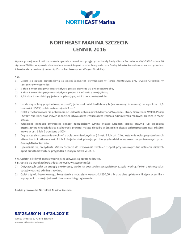 NORTHEAST MARINA SZCZECIN CENNIK 2016 Opłata postojowa określona została zgodnie z cennikiem przyjętym uchwałą Rady Miasta Szczecin nr XV/359/16 z dnia 26 stycznia 2016 r. w sprawie określenia wysokości opłat za dzierżawę nabrzeży Gminy Miasto Szczecin oraz za korzystanie z infrastruktury portowej nabrzeży Portu Jachtowego na Wyspie Grodzkiej. § 3. 1. Ustala się opłatę przystaniową za postój jednostek pływających w Porcie Jachtowym przy wyspie Grodzkiej w Szczecinie w wysokości: 1) 5 zł za 1 metr bieżący jednostki pływającej za pierwsze 30 dni postoju/doba, 2) 4 zł za 1 metr bieżący jednostki pływającej od 31-90 dnia postoju/doba, 3) 3,75 zł za 1 metr bieżący jednostki pływającej od 91 dnia postoju/doba. 2. 3. 4. 5. 6. Ustala się opłatę przystaniową za postój jednostek wielokadłubowych (katamarany, trimarany) w wysokości 1,5 krotności (150%) opłaty ustalonej w § 3 ust.1. Opłat przystaniowych nie pobiera się od jednostek pływających Marynarki Wojennej, Straży Granicznej, WOPR, Policji i Straży Miejskiej oraz innych jednostek pływających realizujących zadania administracji rządowej zlecone z mocy ustaw. Właściciel jednostki pływającej będący mieszkańcem Gminy Miasto Szczecin, osobą prawną lub jednostką organizacyjną nieposiadającą osobowości prawnej mającą siedzibę w Szczecinie uiszcza opłatę przystaniową, o której mowa w ust. 1 lub 2 obniżoną o 30%. Dopuszcza się stosowanie zwolnień z opłat wymienionych w § 3 ust. 1 lub ust. 2 lub ustalenie opłat przystaniowych niższych niż określone w ust. 1 lub 2 dla jednostek pływających biorących udział w imprezach organizowanych przez Gminę Miasto Szczecin. Upoważnia się Prezydenta Miasta Szczecin do stosowania zwolnień z opłat przystaniowych lub ustalania niższych opłat przystaniowych, w przypadku o którym mowa w ust. 5 § 4. Opłaty, o których mowa w niniejszej uchwale, są opłatami brutto. § 5. Ustala się wysokość opłat dodatkowych, w szczególności: 1) Dotyczących opłat za energię elektryczną, wodę na podstawie rzeczywistego zużycia według faktur dostawcy plus kosztów obsługi administracyjnej, 2) Opłat z tytułu bezumownego korzystania z nabrzeży w wysokości 250,00 zł brutto plus opłata wynikająca z cennika w przypadku postoju jednostki bez uprzedniego zgłoszenia. Podpis pracownika NorthEast Marina Szczecin Wyspa Grodzka 1, 70-655 Szczecin www.northeast-marina.eu