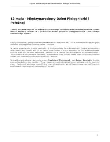 Szpital Powiatowy Imienia Miłosierdzia Bożego w Limanowej 12 maja - Międzynarodowy Dzień Pielęgniarki i Położnej Z okazji przypadającego na 12 maja Międzynarodowego Dnia Pielęgniarki i Położnej Dyrektor Szpitala Marcin Radzięta spotkał się z przedstawicielkami personelu pielęgniarskiego i położniczego limanowskiego szpitala. Były życzenia i kwiaty, poczęstunek oraz podziękowania dla wszystkich pań, a także panów reprezentujących grupę zawodową darzoną powszechnym szacunkiem i uznaniem. W swoim przemówieniu dyrektor podkreślił, iż Międzynarodowy Dzień Pielęgniarki i Położnej przypomina o wyjątkowości tego zawodu, jego roli dla całego społeczeństwa, a przede wszystkim dla konkretnego człowieka, pacjenta, który dzięi staraniom pielęgniarek i położnych ma w chorobie zapewniony komfort profesjonalnej opieki. "Doceniam Wasze zaangażowanie, cierpliwość i trud codziennej pracy, fachową opiekę, dzięki której pacjenci naszego szpitala mają zapewnione poczucie bezpieczeństwa i wsparcie". W dowód uznania dla pracy personelu na ręce Przełożonej Pielęgniarek - pani Bożeny Bugajskiej dyrektor przekazał symboliczny kosz kwiatów. - "Życzę z całego serca wszystkim pielęgniarkom, pielęgniarzom - bo panów też mamy - i położnym, aby każdy nowy dzień na nowo odkrywał sens i wartość Waszej pracy oraz mobilizował do podejmowania coraz to nowych i odważniejszych wyzwań". 1