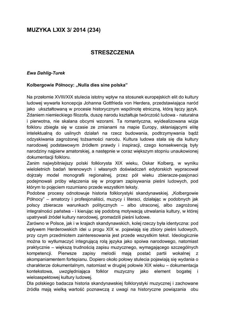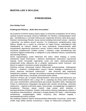 MUZYKA LXIX 3/ 2014 (234) STRESZCZENIA Ewa Dahlig-Turek Kolbergowie Północy: „Nulla dies sine polska” Na przełomie XVIII/XIX stulecia istotny wpływ na stosunek europejskich elit do kultury ludowej wywarła koncepcja Johanna Gottfrieda von Herdera, przedstawiająca naród jako ukształtowaną w procesie historycznym wspólnotę etniczną, którą łączy język. Zdaniem niemieckiego filozofa, duszę narodu kształtuje twórczość ludowa - naturalna i pierwotna, nie skalana obcymi wzorami. Ta romantyczna, wyidealizowana wizja folkloru zbiegła się w czasie ze zmianami na mapie Europy, skłaniającymi elitę intelektualną do usilnych działań na rzecz budowania, podtrzymywania bądź odzyskiwania zagrożonej tożsamości narodu. Kultura ludowa stała się dla kultury narodowej podstawowym źródłem prawdy i inspiracji, czego konsekwencją były narodziny najpierw amatorskiej, a następnie w coraz większym stopniu unaukowionej dokumentacji folkloru. Zanim najwybitniejszy polski folklorysta XIX wieku, Oskar Kolberg, w wyniku wieloletnich badań terenowych i własnych doświadczeń edytorskich wypracował dojrzały model monografii regionalnej, przez pół wieku zbieracze-pasjonaci podejmowali próby włączenia się w program zapisywania pieśni ludowych, pod którym to pojęciem rozumiano przede wszystkim teksty. Podobne procesy odnotowuje historia folklorystyki skandynawskiej. „Kolbergowie Północy” – amatorzy i profesjonaliści, muzycy i literaci, działając w podobnych jak polscy zbieracze warunkach politycznych – albo utraconej, albo zagrożonej integralności państwa - i kierując się podobną motywacją utrwalania kultury, w której upatrywali źródeł kultury narodowej, gromadzili pieśni ludowe. Zarówno w Polsce, jak i w krajach skandynawskich, kolej rzeczy była identyczna: pod wpływem Herderowskich idei u progu XIX w. pojawiają się zbiory pieśni ludowych, przy czym przedmiotem zainteresowania jest przede wszystkim tekst. Ideologicznie można to wytłumaczyć integrującą rolą języka jako spoiwa narodowego, natomiast praktycznie – większą trudnością zapisu muzycznego, wymagającego szczególnych kompetencji. Pierwsze zapisy melodii mają postać partii wokalnej z akompaniamentem fortepianu. Dopiero około połowy stulecia pojawiają się wydania o charakterze dokumentalnym, natomiast w drugiej połowie XIX wieku – dokumentacja kontekstowa, uwzględniająca folklor muzyczny jako element bogatej i wieloaspektowej kultury ludowej. Dla polskiego badacza historia skandynawskiej folklorystyki muzycznej i zachowane źródła mają wielką wartość poznawczą z uwagi na historyczne powiązania obu państw na przełomie XVI i XVII wieku, w wyniku których doszło do muzycznego eksportu “tańców polskich” do wszystkich krajów Półwyspu Skandynawskiego. Tańce te, początkowo popularne w repertuarze dworskim, a następnie przyswojone trwale przez kulturę ludową, przetrwały do dziś jako istotne elementy współtworzące lokalną tradycję muzyczną, zwłaszcza w Szwecji. Fascynujące jest zwłaszcza bogactwo szwedzkich zapisów „tańców polskich” (polska), wykazujących wielkie podobieństwo rytmiczne do trójmiarowych polskich tańców narodowych i ludowych. Najcenniejszym źródłem ich poznania jest monumentalny zbiór Svenska låtar, obejmujący blisko 8 tysięcy melodii ludowych zebranych w terenie i opublikowanych w 24 tomach w latach 1922-1940. Kolekcja ta, mimo zupełnie odmiennego charakteru, zawartości i sposobu jej gromadzenia, traktowana jest w Szwecji podobnie jak zbiory Oskara Kolberga w Polsce – jako podstawowy zasób źródłowy, do którego sięga się w celach poznawczych, badawczych, edukacyjnych i artystycznych. Ogromna reprezentacja tańców polska dowodzi, że w oczach ówczesnych zbieraczy stanowiły one repertuar szczególnie cenny i wart utrwalenia. Tak więc „Kolbergowie Północy”, skupiając się na dokumentacji rodzimej kultury muzycznej, w jakimś sensie dopełnili dzieło Oskara Kolberga, stwarzając możliwość badań porównawczych nad morfologią, ale i specyfiką kulturową rytmów, które mimo iż w Skandynawii występują w tańcach określanych jako „polskie”, w istocie rzeczy współtworzą lokalny idiom muzyczny w takim niemal stopniu, jak w polskiej muzyce ludowej i narodowej. Ludwik Bielawski Oskar Kolberg i powojenna dokumentacja folkloru muzycznego W artykule „Oskar Kolberg i powojenna dokumentacja folkloru muzycznego” autor, wieloletni kierownik Pracowni Etnomuzykologii Instytutu Sztuki Polskiej Akademii Nauk, przedstawił historię dokumentowania i krytycznego opracowywania gromadzonych przez lata zbiorów sztuki ludowej, w tym zbiorów muzycznych. Sam Ludwik Bielawski studia muzykologiczne odbywał w Poznaniu, gdzie jeszcze przed wojną Łucjan Kamieński stworzył przy prowadzonej przez siebie katedrze muzykologii miejscowego uniwersytetu jeden z głównych ośrodków zbierania i archiwizowania dźwiękowych dokumentów polskiej muzyki ludowej. Po wojnie przygotowani przez Kamieńskiego kolejni badacze – Jadwiga i Marian Sobiescy – kontynuowali przedwojenną akcję zbierania folkloru oraz kształcili następne pokolenie etnomuzykologów. Według autora, polska etnomuzykologia wyrosła z nauki pozytywistycznej i taka w znacznej mierze pozostała do dziś – przykładem mogą być prace Anny Czekanowskiej, Jana Stęszewskiego, a spośród badaczy kolejnego pokolenia – Ewy Dahlig i Zbigniewa Przerembskiego. Autor wskazuje też na zainspirowane anglosaską antropologią (prace Alana Merriama) zmiany, jakie w polskiej etnografii muzycznej nastąpiły w latach siedemdziesiątych XX wieku. Ważnym wątkiem, jaki wskazał autor, jest kwestia stałej obecności w polskiej etnografii świadomości istnienia dzieła Oskara Kolberga, oraz inicjatyw związanych z publikowaniem tej spuścizny. Przypomina tu nazwiska Karola Hławiczki, który jeszcze przed drugą wojną światową