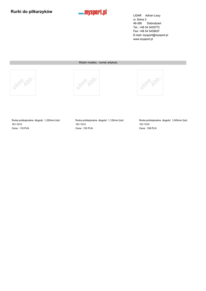 Rurki do piłkarzyków LIDAR Adrian Lissy ul. Solna 3 46-380 Dobrodzień Tel.: +48 34 3435773 Fax: +48 34 3435637 E-mail: [email protected] www.mysport.pl Wybór modelu : numer artykułu Rurka profesjonalna długość 1,220mm.2szt. Rurka profesjonalna długość 1,120mm.2szt. Rurka profesjonalna długość 1,045mm.2szt. 191-1012 191-1013 191-1015 Cena : 118 PLN Cena : 153 PLN Cena : 156 PLN