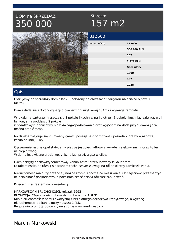 DOM na SPRZEDAŻ 350 000 Stargard 157 m2 312600 Numer oferty 312600 350 000 PLN 157 2 229 PLN Secondary 1600 157 1928 Opis Oferujemy do sprzedaży dom z lat 20, położony na obrzeżach Stargardu na działce o pow. 1 600m2. Dom składa się z 3 kondygnacji o powierzchni użytkowej 154m2 i wymaga remontu. W lokalu na parterze mieszczą się 3 pokoje i kuchnia, na I piętrze - 3 pokoje, kuchnia, łazienka, wc i balkon, a na poddaszu 2 pokoje z dodatkowym pomieszczeniem do zagospodarowania oraz wyjściem na dach przybudówki gdzie można zrobić taras. Na działce znajduje się murowany garaż , posesja jest ogrodzona i posiada 2 bramy wjazdowe, każda od innej ulicy. Ogrzewanie jest na opał stały, a na piętrze jest piec kaflowy z wkładem elektrycznym, oraz bojler na ciepłą wodę. W domu jest własne ujęcie wody, kanaliza, prąd, a gaz w ulicy. Dach pokryty dachówką cementową, komin został przebudowany kilka lat temu. Lokale mieszkalne różnią się stanem technicznym z uwagi na różne okresy zamieszkiwania. Nieruchomość ma duży potencjał, można zrobić 3 oddzielne mieszkania lub częściowo przeznaczyć na działalność gospodarczą, a pozostałą część działki również zabudować. Polecam i zapraszam na prezentację. MARKOWSCY NIERUCHOMOŚCI, rok zał. 1993 PROMOCJA: "Wycena nieruchomości do banku za 1 PLN" Kup nieruchomość z nami i skorzystaj z bezpłatnego doradztwa kredytowego, a wycenę nieruchomości do banku otrzymasz za 1 PLN. Regulamin promocji dostępny na stronie www.markowscy.pl Marcin Markowski Markowscy Nieruchomości tel. +48 790 333 444 email: [email protected] Markowscy Nieruchomości Powered by TCPDF (www.tcpdf.org)