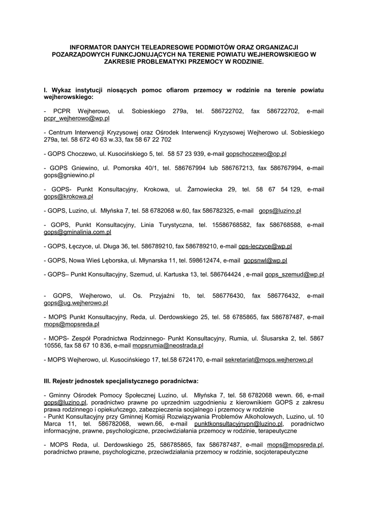 INFORMATOR DANYCH TELEADRESOWE PODMIOTÓW ORAZ ORGANIZACJI POZARZĄDOWYCH FUNKCJONUJĄCYCH NA TERENIE POWIATU WEJHEROWSKIEGO W ZAKRESIE PROBLEMATYKI PRZEMOCY W RODZINIE. I. Wykaz instytucji niosących pomoc ofiarom przemocy w rodzinie na terenie powiatu wejherowskiego: - PCPR Wejherowo, [email protected] ul. Sobieskiego 279a, tel. 586722702, fax 586722702, e-mail - Centrum Interwencji Kryzysowej oraz Ośrodek Interwencji Kryzysowej Wejherowo ul. Sobieskiego 279a, tel. 58 672 40 63 w.33, fax 58 67 22 702 - GOPS Choczewo, ul. Kusocińskiego 5, tel. 58 57 23 939, e-mail [email protected] - GOPS Gniewino, ul. Pomorska 40/1, tel. 586767994 lub 586767213, fax 586767994, e-mail [email protected] - GOPS- Punkt Konsultacyjny, Krokowa, ul. Żarnowiecka 29, tel. 58 67 54 129, e-mail [email protected] - GOPS, Luzino, ul. Młyńska 7, tel. 58 6782068 w.60, fax 586782325, e-mail [email protected] - GOPS, Punkt Konsultacyjny, Linia Turystyczna, tel. 15586768582, fax 586768588, e-mail [email protected] - GOPS, Łęczyce, ul. Długa 36, tel. 586789210, fax 586789210, e-mail [email protected] - GOPS, Nowa Wieś Lęborska, ul. Młynarska 11, tel. 598612474, e-mail [email protected] - GOPS– Punkt Konsultacyjny, Szemud, ul. Kartuska 13, tel. 586764424 , e-mail [email protected] - GOPS, Wejherowo, [email protected] ul. Os. Przyjaźni 1b, tel. 586776430, fax 586776432, e-mail - MOPS Punkt Konsultacyjny, Reda, ul. Derdowskiego 25, tel. 58 6785865, fax 586787487, e-mail [email protected] - MOPS- Zespół Poradnictwa Rodzinnego- Punkt Konsultacyjny, Rumia, ul. Ślusarska 2, tel. 5867 10556, fax 58 67 10 836, e-mail [email protected] - MOPS Wejherowo, ul. Kusocińskiego 17, tel.58 6724170, e-mail [email protected] III. Rejestr jednostek specjalistycznego poradnictwa: - Gminny Ośrodek Pomocy Społecznej Luzino, ul. Młyńska 7, tel. 58 6782068 wewn. 66, e-mail [email protected], poradnictwo prawne po uprzednim uzgodnieniu z kierownikiem GOPS z zakresu prawa rodzinnego i opiekuńczego, zabezpieczenia socjalnego i przemocy w rodzinie - Punkt Konsultacyjny przy Gminnej Komisji Rozwiązywania Problemów Alkoholowych, Luzino, ul. 10 Marca 11, tel. 586782068, wewn.66, e-mail [email protected], poradnictwo informacyjne, prawne, psychologiczne, przeciwdziałania przemocy w rodzinie, terapeutyczne - MOPS Reda, ul. Derdowskiego 25, 586785865, fax 586787487, e-mail [email protected], poradnictwo prawne, psychologiczne, przeciwdziałania przemocy w rodzinie, socjoterapeutyczne - MOPS Dział Poradnictwa Specjalistycznego, Rumia, ul. Ślusarska 2, tel.586710556, fax 5867 10836, e-mail [email protected], poradnictwo prawne, psychologiczne, przeciwdziałania przemocy w rodzinie, socjoterapeutyczne, informacyjne, pedagogiczne - GOPS Szemud, ul. Obrońców Szemuda 2A, tel. 586765151, poradnictwo socjalne, informacyjne e-mail [email protected], - Punkt Konsultacyjny przy Gminnej Komisji Rozwiązywania Problemów Alkoholowych, Szemud, ul. Obrońców Szemuda 2A, tel. 586765151 lub 586764440, poradnictwo psychologiczne, prawne - GOPS, Wejherowo, ul. Os. Przyjaźni 1b, tel. 58 6776430, fax 586776432, [email protected], poradnictwo prawne, socjalne, terapeutyczne, uzależnień e-mail - GOPS Wejherowo- filia w Gościcinie, ul. Wejherowska 24, [email protected], poradnictwo prawne, socjalne, terapeutyczne e-mail tel. 587386640, - MOPS Wejherowo, ul. Kusocińskiego 17, tel. 58 6777960, e-mail [email protected], poradnictwo prawne, psychologiczne - PCPR- Zespół Interwencji Kryzysowej, Wejherowo, ul. Sobieskiego 279a, tel. 586724063, fax 58 67 22 702, e-mail [email protected], poradnictwo prawne, psychologiczne, rodzinne, obywatelskie, socjalne, przeciwdziałania przemocy w rodzinie IV. Rejestr placówek zapewniających miejsca noclegowe: - Łaźnia i przytulisko dla osób bezdomnych – Zgromadzenie Sióstr Albertynek Posługujących Ubogim, Wejherowo, ul. Kopernika 16, tel. 586724959, e-mail [email protected], miejsca interwencyjnego pobytu, możliwość skorzystania z łaźni i wymiany odzieży II. Wykaz telefonów ogólnopolskich: - Ogólnopolskie Pogotowie dla Ofiar Przemocy w Rodzinie "Niebieska Linia" dyżury psychologów, pedagogów, konsultantów do spraw przemocy 801120002 [email protected] - Dziecięcy Telefon Zaufania Rzecznika Praw Dziecka 800 12 12 12 - Telefon Zaufania dla Dzieci i Młodzieży (całodobowy, bezpłatny, anonimowy) 116111 - Komitet Ochrony Praw Dziecka 502034728