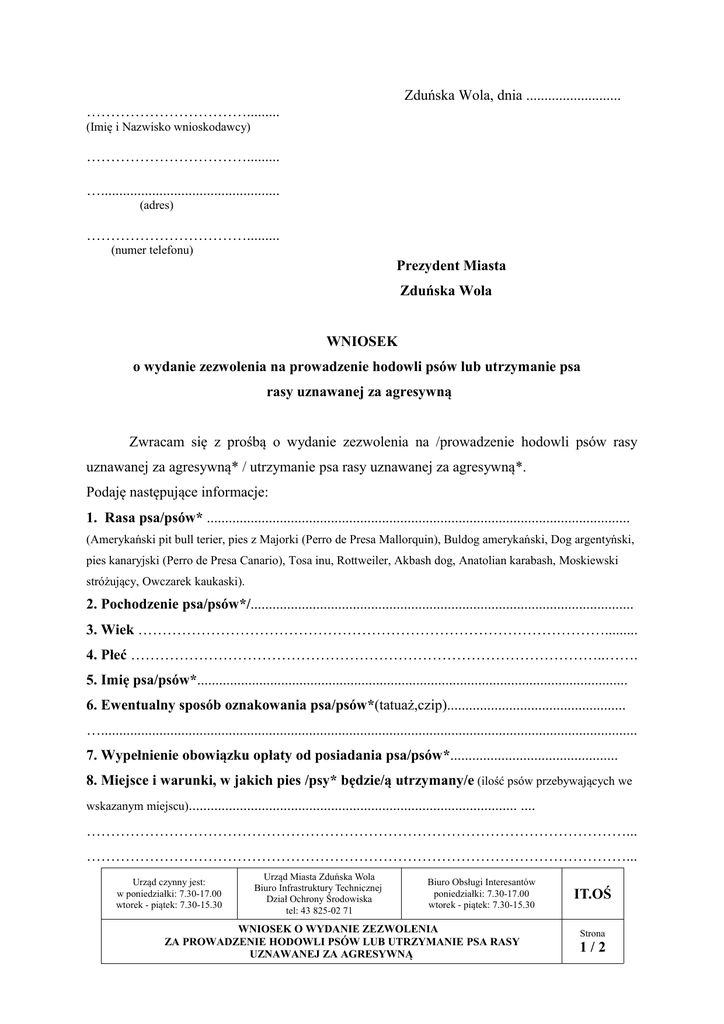 Zduńska Wola, dnia .......................... ……………………………......... (Imię i Nazwisko wnioskodawcy) ……………………………......... …................................................. (adres) ……………………………......... (numer telefonu) Prezydent Miasta Zduńska Wola WNIOSEK o wydanie zezwolenia na prowadzenie hodowli psów lub utrzymanie psa rasy uznawanej za agresywną Zwracam się z prośbą o wydanie zezwolenia na /prowadzenie hodowli psów rasy uznawanej za agresywną* / utrzymanie psa rasy uznawanej za agresywną*. Podaję następujące informacje: 1. Rasa psa/psów* .................................................................................................................... (Amerykański pit bull terier, pies z Majorki (Perro de Presa Mallorquin), Buldog amerykański, Dog argentyński, pies kanaryjski (Perro de Presa Canario), Tosa inu, Rottweiler, Akbash dog, Anatolian karabash, Moskiewski stróżujący, Owczarek kaukaski). 2. Pochodzenie psa/psów*/......................................................................................................... 3. Wiek ……………………………………………………………………………………......... 4. Płeć ……………………………………………………………………………………..……. 5. Imię psa/psów*...................................................................................................................... 6. Ewentualny sposób oznakowania psa/psów*(tatuaż,czip)................................................. …................................................................................................................................................... 7. Wypełnienie obowiązku opłaty od posiadania psa/psów*.............................................. 8. Miejsce i warunki, w jakich pies /psy* będzie/ą utrzymany/e (ilość psów przebywających we wskazanym miejscu).......................................................................................... .... …………………………………………………………………………………………………... …………………………………………………………………………………………………... Urząd czynny jest: w poniedziałki: 7.30-17.00 wtorek - piątek: 7.30-15.30 Urząd Miasta Zduńska Wola Biuro Infrastruktury Technicznej Dział Ochrony Środowiska tel: 43 825-02 71 Biuro Obsługi Interesantów poniedziałki: 7.30-17.00 wtorek - piątek: 7.30-15.30 WNIOSEK O WYDANIE ZEZWOLENIA ZA PROWADZENIE HODOWLI PSÓW LUB UTRZYMANIE PSA RASY UZNAWANEJ ZA AGRESYWNĄ IT.OŚ Strona 1/2 Oświadczam, że podane we wniosku dane są zgodne ze stanem faktycznym. .……………………………............. (czytelny podpis wnioskodawcy lub osoby uprawnionej do jego reprezentowania) Załączniki do wniosku: 1. Kopia książeczki zdrowia psa. 2. Kopia aktualnego świadectwa szczepienia psa przeciw wściekliźnie (dotyczy psów powyżej 3 m-ca życia). 3. Kopia uiszczenia opłaty od posiadania psa za rok bieżący. 4. Dowód uiszczenia opłaty skarbowej. * niepotrzebne skreślić Urząd czynny jest: w poniedziałki: 7.30-17.00 wtorek - piątek: 7.30-15.30 Urząd Miasta Zduńska Wola Biuro Infrastruktury Technicznej Dział Ochrony Środowiska tel: 43 825-02 71 Biuro Obsługi Interesantów poniedziałki: 7.30-17.00 wtorek - piątek: 7.30-15.30 WNIOSEK O WYDANIE ZEZWOLENIA ZA PROWADZENIE HODOWLI PSÓW LUB UTRZYMANIE PSA RASY UZNAWANEJ ZA AGRESYWNĄ IT.OŚ Strona 2/2