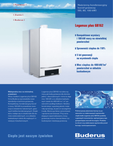 Naścienny kondensacyjny kocioł grzewczy (65, 80, 100 kW) [ Powietrze ] [ Woda ] [ Ziemia ] [ Buderus ] Logamax plus GB162 Kompaktowe wymiary i 100 kW mocy na niewielkiej powierzchni Sprawność cieplna do 110% 5 lat gwarancji na wymiennik ciepła Moc cieplna do 400 kW/1m2 powierzchni w układzie kaskadowym Maksymalna moc na minimalnej przestrzeni. Wraz z kotłem Logamax plus GB162 firma Buderus wprowadziła nowe standardy w technice grzewczej. Kompaktowy, kondensacyjny kocioł o mocy 100 kW to prawdziwa rewolucja w dziedzinie naściennych, gazowych kotłów kondensacyjnych. Dzięki temu nadaje się on doskonale dla domów wielorodzinnych, a w układzie kaskadowym także dla większych inwestycji mieszkaniowych. Logamax plus GB162 ma takie wymiary jak kotły grzewcze dla domów jedno- i dwurodzinnych i mimo to daje moc 100 kW, a w układzie kaskadowym nawet do 400 kW na 1 m2 powierzchni podłogi kotłowni. Solidna konstrukcja i wysokiej jakości materiały sprawiają, że jest on szczególnie trwały. Można go łatwo zamontować i sprawnie serwisować. Przy wzrastającym zapotrzebowaniu mocy grzewczej można również łatwo rozbudowywać instalację grzewczą. Polimeryzacja plazmowa tworzy na powierzchni rur ożebrowanych wymiennika ciepła kotła Logamax plus GB162 powłokę z gazowych monomerów, wytrzymującą najagresywniejsze warunki korozyjne. Powłoka ta chroni rury ożebrowane wymiennika przed korozją i zanieczyszczeniami. Ciepło jest naszym żywiołem Naścienny kondensacyjny kocioł grzewczy Logamax plus GB162 (65, 80, 100 kW) Logamax plus GB162 – kompaktowy, kondensacyjny pakiet mocy AS P R AW N O Ś Ć Naścienny kocioł Logamax plus GB162 otwiera nowe obszary zastosowań zarówno w nowym budownictwie, jak i przy kapitalnym remoncie, dla domów wielorodzinnych i większych obiektów mieszkalnych. Kocioł pracuje ze sprawnością cieplną aż do 110%. Obniża to koszty ogrzewania i chroni środowisko naturalne. SZ KO ND EN S AC JA = W YŻ Kaskada Logamax plus GB162 Nasza jakość zaczyna się od właściwej koncepcji Logamax plus GB162 jest wiodącym kondensacyjnym kotłem grzewczym nowej generacji firmy Buderus. Ożebrowane rury wymiennika ciepła produkowane są z wysokiej jakości nierdzewnych stopów aluminium. To wysokowartościowe tworzywo łączy w sobie niewielki ciężar, wysoką żywotność i bardzo dobrą przewodność cieplną. wymiany ciepła, przepływów i trwałego uszlachetniania powierzchni w celu zwiększenia jej trwałości. Aluminiowe rury ożebrowane pozwalają na łatwe i szybkie czyszczenie. Wystarczy do tego jedynie wypłukanie wodą lub użycie sprężonego powietrza. Warstwa uszlachetniająca, powstająca przez polimeryzację plazmową, jest bardzo cienka i nie ma wpływu na sprawność i wydajność wymiennika ciepła. Oprócz tego wymiennik ciepła wykonany w technologii ALU plus jest bardzo odporny chemicznie. Nowy kształt wewnętrzny rur wymiennika ciepła poprawia wyraźnie wymianę ciepła. Taka technologia umożliwiła zbudowanie wymiennika ciepła o mocy 100 kW w tak zwartej formie. „To niewiarygodne, że tak dużą moc zamknięto w tak niewielkiej formie. Dobrze wiedzieć, że produkty firmy Buderus funkcjonują idealnie.” Zalety kotła Logamax plus GB162: wymiennik ciepła w technologii ALU plus daje największą z możliwych żywotność i łatwy serwis sprawność cieplna do 110% kompaktowe wymiary i moc 65, 80 lub 100 kW na niewielkiej przestrzeni bardzo duży zakres modulacji od 14 do 100% bardzo dobra wymiana ciepła, dzięki korzystnemu ukształtowaniu aluminiowych rur żebrowych „plug&burn”: innowacyjna koncepcja kaskady dla łatwego montażu kaskada do 400 kW na 1 m2 powierzchni Wykonanie w technologii ALU plus Wymiennik ciepła kotła Logamax plus GB162 wykonany jest w technologii ALU plus. Ta innowacyjna technologia zoptymalizowana jest pod kątem Autoryzowany Partner Handlowy: podłogi kotłowni cicha praca i oszczędność prądu, dzięki technologiom FLOW plus i ETA plus Wymiennik ciepła kotła Logamax plus GB162 Logamax plus GB162-65 GB162-80 GB162-100 Znamionowa moc kotła (kW) 14,2-65,0 18,9-84,5 18,9-99,5 Sprawność cieplna (%) Temp. wody grzewczej (°C) do 108 Średnica rury spalinowej (mm) Wymiary (wys./szer./gł.) (mm) Ciężar (kg) Robert Bosch Sp. z o.o. • ul. Jutrzenki 105, 02-231 Warszawa • Infolinia Buderus 801 777 801 • www.buderus.pl do 110 do 90 110/160 Zasilanie elektryczne (VAC/Hz) Pobór mocy elektrycznej (W) do 110 230/50 99 97 980/520/465 70 97