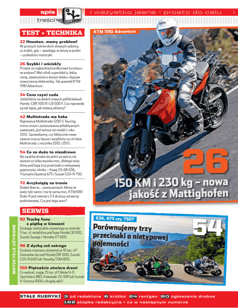 spis treści i wszystko jasne - prosto do celu TEST + TECHNIKA KTM 1190 Adventure 22 Houston, mamy problem! W prostych żołnierskich słowach radzimy, co zrobić, gdy – wpadając w dziurę w jezdni – uszkodzisz motocykl. 26 Szybki i wściekły Przepis na najbardziej hardkorowe turystyczne enduro? Weź silnik superbike’a, lekką ramę, zawieszenia o dużym skoku i dopraw nowoczesną elektroniką. Tak powstał KTM 1190 Adventure. 34 Cena czyni cuda Jeździliśmy na dwóch nowych półlitrówkach Hondy: CBR 500 R i CB 500 F. Czy naprawdę są tak fajne, jak mówią reklamy? 42 Multistrada ma haka Najnowsza Multistrada 1200 S Touring, mimo zmian i zastosowania półaktywnych zawieszeń, jest tańsza niż model z roku 2012. Sprawdzamy, czy faktycznie nowe zawsze znaczy lepsze i wzięliśmy na cel dwie Multistrady: z rocznika 2012 i 2013. 26 54 Co za dużo to niezdrowo Na zwykłej drodze do pełni szczęścia nie wystarczy tylko wysoka moc, dlatego wzięliśmy pod lupę trzy przecinaki o nietypowej pojemności silnika – Kawę ZX-6R 636, Triumpha Daytonę 675 i Suzuki GSX-R 750. 72 Arcyksiążę na tronie Diabeł tkwi w... zawieszeniach. Mimo że waży tyle samo i ma tę samą moc, KTM 690 Duke R jest niemal o 1/3 droższy od wersji podstawowej. Czy jest tego wart? MOTOCYKLE UŻYWANE SERWIS 92 Trochę funu z piątką w kieszeni Szukając motocykla używanego w cenie do 5 tys. zł, wzięliśmy pod lupę Hondę CB 500, Suzuki Savage i Yamahę XT 600. 96 Z dychą coś ostrego Szukasz maszyny używanej za 10 tys. zł? Zastanów się nad Hondą CBF 600, Suzuki GSX-R 600 lub Yamahą TDM 850. 636, 675 czy 750? Porównujemy trzy przecinaki o nietypowej pojemności 54 100 Piętnaście otwiera drzwi Co wybrać, mając 15 tys. zł? Może H-D Sportstera 883, Kawasaki ZX-10R lub Suzuki V-Stroma 1000 z drugiej ręki? STAŁE RUBRYKI 3 od redaktora 6 krót ko 24 rentgen 80 ogłoszenia drobne 162 stopka redakcyjna + co w następnym numerze i wszystko wszy ystko jasn jasne - prosto do celu 118 Mocne plecy to podstawa. Nie pozwól, by stała im się krzywda Testujemy 10 żółwi i wszystko jasne Wszystko o łańcuchach 110 Podpowiadamy, co zrobić, by łańcuch posłużył jak najdłużej 34 104 Wiosenna faza Razem z mechanikiem wybraliśmy się po zakup używanej maszyny. Oto, na co musisz zwrócić uwagę, zanim podpiszesz umowę i wydasz pieniądze. 110 Liczy się napięcie Łańcuchy – wystarczy 20 minut, żebyś poprawnie naciągnął łańcuch motocykla. Nie wierzysz? No to przeczytaj. 118 Mocne plecy Co dziesiąta kontuzja odniesiona na motocyklu dotyczy pleców i kręgosłupa. Da się temu zaradzić, ale ponieważ nie od dziś wiadomo, że żółw żółwiowi nierówny, przetestowaliśmy dziesięć ochraniaczy pleców. MAGAZYN 128 Mięśnie na warsztat Kondycja jeźdźca jest równie ważna, jak stan techniczny motocykla. Radzimy więc, jak ćwiczyć, żeby nabrać krzepy. Silniejszy, będziesz miał więcej radości z jazdy. Fajne, tanie i oszczędne. Wiemy już, jakie są najnowsze „500” ze stajni Hondy 132 Garnki z Japonii Podczas wyprawy do Japonii na własne oczy widzieliśmy, jak powstają kaski Shoei. Hondy CBR 500 R i CB 500 F motocykle używane Kupujemy sprzęta za 5, 10 lub 15 tys. zł. Nasz raport 136 Europejski zamach stanu Przedstawiamy wyniki Best Bikes 2013 – plebiscytu na najpopularniejsze Waszym zdaniem maszyny tego sezonu. 138 Czy mniej znaczy więcej? V Ogólnopolska Wystawa Motocykli i Skuterów udowodniła, że bikerzy – mimo kryzysu gospodarczego – ciągle marzą. 144 Mur berliński stoi w polu ...niedaleko Wrocławia. Oto jedna z atrakcji weekendowego rajdu po Dolnym Śląsku. 146 Renifer na talerzu Lekko zgłupieli, gdy w Norwegii w deszczu i przy +10O zobaczyli laski w minispódniczkach i klapkach... Relacja z miesięcznej podróży po Skandynawii i Europie Północnej. SPORT 92 82 kalendarz kwietniowych imprez 86 garaż 156 Aprilia króluje Aprilia nie dała najmniejszych szans rywalom i podczas pierwszej w tym sezonie rundy World Superbike na Phillip Island wywalczyła pięć z sześciu miejsc na podium.