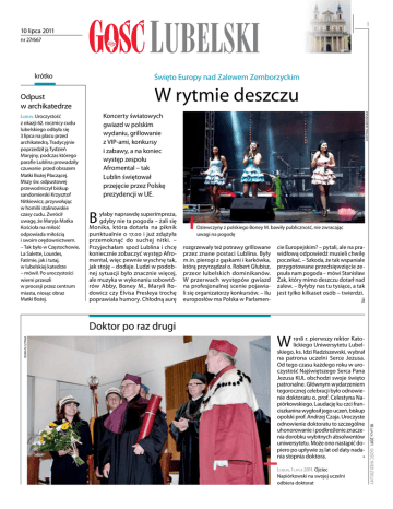 I 10 lipca 2011 nr 27/667 krótko Święto Europy nad Zalewem Zemborzyckim Lublin. Uroczystość z okazji 62. rocznicy cudu lubelskiego odbyła się 3 lipca na placu przed archikatedrą. Tradycyjnie poprzedził ją Tydzień Maryjny, podczas którego parafie Lublina prowadziły czuwanie przed obrazem Matki Bożej Płaczącej. Mszy św. odpustowej przewodniczył biskup sandomierski Krzysztof Nitkiewicz, przywołując w homilii stalinowskie czasy cudu. Zwrócił uwagę, że Maryja Matka Kościoła na miłość odpowiada miłością i swoim orędownictwem. – Tak było w Częstochowie, La Salette, Lourdes, Fatimie, jak i tutaj, w lubelskiej katedrze – mówił. Po uroczystości wierni przeszli w procesji przez centrum miasta, niosąc obraz Matki Bożej. Koncerty światowych gwiazd w polskim wydaniu, grillowanie z VIP-ami, konkursy i zabawy, a na koniec występ zespołu Afromental – tak Lublin świętował przejęcie przez Polskę prezydencji w UE. B yłaby naprawdę superimpreza, gdyby nie ta pogoda – żali się Monika, która dotarła na piknik punktualnie o 17.00 i już zdążyła przemoknąć do suchej nitki. – Przyjechałam spod Lublina i chcę koniecznie zobaczyć występ Afromental, więc pewnie wyschnę tak, jak stoję – dodaje. Ludzi w podobnej sytuacji było znacznie więcej, ale muzyka w wykonaniu sobowtórów Abby, Boney M., Maryli Rodowicz czy Elvisa Presleya trochę poprawiała humory. Chłodną aurę Doktor po raz drugi Roman Czyrka Justyna Jarosińska W rytmie deszczu Odpust w archikatedrze Dziewczyny z polskiego Boney M. bawiły publiczność, nie zwracając uwagi na pogodę rozgrzewały też potrawy grillowane przez znane postaci Lublina. Były m.in. pierogi z gąskami i karkówka, którą przyrządzał o. Robert Głubisz, przeor lubelskich dominikanów. W przerwach występów gwiazd na profesjonalnej scenie pojawiali się organizatorzy konkursów. – Ilu europosłów ma Polska w Parlamen- cie Europejskim? – pytali, ale na prawidłową odpowiedź musieli chwilę poczekać. – Szkoda, że tak wspaniale przygotowane przedsięwzięcie zepsuła nam pogoda – mówi Stanisław Żak, który mimo deszczu dotarł nad zalew. – Byłyby nas tu tysiące, a tak jest tylko kilkaset osób – twierdzi. jj W Lublin, 1 lipca 2011. Ojciec Napiórkowski na swojej uczelni odbiera doktorat 10 lipca 2011 Gość Niedzielny 1918 r. pierwszy rektor Katolickiego Uniwersytetu Lubelskiego, ks. Idzi Radziszewski, wybrał na patrona uczelni Serce Jezusa. Od tego czasu każdego roku w uroczystość Najświętszego Serca Pana Jezusa KUL obchodzi swoje święto patronalne. Głównym wydarzeniem tegorocznej celebracji było odnowienie doktoratu o. prof. Celestyna Napiórkowskiego. Laudację ku czci franciszkanina wygłosił jego uczeń, biskup opolski prof. Andrzej Czaja. Uroczyste odnowienie doktoratu to szczególne uhonorowanie i podkreślenie znaczenia dorobku wybitnych absolwentów uniwersytetu. Może ono nastąpić dopiero po upływie 25 lat od daty nadania stopnia doktora. • gość lubelski gość lubelski Zaproszenie do wolności K azimierz D olny. Występem duetu: tenora Wiesława Ochmana i mezzosopranistki Renaty Dobrosz, którzy wykonali pieśni sakralne, zainaugurowano 2 lipca kolejny sezon Letnich Wieczorów Muzycznych. Będą się one odbywały w każdą sobotę do końca wakacji w kazimierskim kościele farnym. Wśród artystów usłyszymy między innymi Małgorzatę Walewską oraz mistrza organów Roberta Grudnia i gości z zagranicy. Najlepsi z najlepszych Wyjazdy na zakończenie roku szkolnego to nagroda za całoroczną pracę Archiwum LUW Marzeny Kornet, Zakładu Stolarsko-Budowlanego Zdzisława Serheja z Łomaz, Przedsiębiorstwa Handlowo-Usługowo-Transportowego TRANSHURT sp. z o.o. w Lublinie oraz Przedsiębiorstwa Wykonawstwa Remontów i Inwestycji REMZAP sp. z o.o. z Puław. Gości bawił kabaret Smile. O formacji kapłańskiej, codziennym życiu i problemach, przed którymi stają przyszli księża, z ks. dr. Markiem Szymańskim, prefektem Metropolitalnego Seminarium Duchownego w Lublinie, rozmawia Justyna Jarosińska. Archiwum FSD Archiwum Roberta Grudnia Znani artyści już po raz kolejny wystąpili w kazimierskiej farze Lublin. Rozstrzygnięto ósmą edycję konkursu na Wojewódzkiego Lidera Biznesu. Zwycięzcom wręczono statuetki, certyfikaty oraz Złote Certyfikaty. Nagrody przyznano w czterech kategoriach: firmy mikro, firmy małe, średnie oraz duże. W tym roku statuetki trafiły do zamojskiej firmy AUTO-DIAG Lubelskie seminarium czeka na kandydatów Za dobrą naukę – pielgrzymka Lato z muzyką Uroczystość odbyła się w Teatrze Muzycznym M łodzież . Lwów, Niepokalanów i Święty Krzyż to miejsca, które w tym roku były punktem docelowym tras akademickich pielgrzymek wychowanków Fundacji Szczęśliwe Dzieciństwo. Pielgrzymki rozpoczęły się 27 maja od wyprawy najmłodszych wychowanków fundacji do sanktuarium Relikwii Krzyża Świętego, a zakończyły wyjazdem pod Justyna Jarosińska: Czego może się spodziewać młody chłopak, stanąwszy pierwszy raz przed bramą seminaryjną? K s. dr Marek Szymański: – Przede wszystkim na pewno pojawi się pytanie o całą jego drogę związaną z decyzją wstąpienia do seminarium. Co go tu sprowadziło? Jakie ma za sobą doświadczenia? I dlaczego decyduje się na to, by najpiękniejsze lata swojego życia poświęcić pracy nad swoim charakterem i w przyszłości stać się kapłanem? Na pewno w naszej pierwszej rozmowie zapytamy o te najgłębsze motywacje, wskazując też na wydarzenia czy osoby, które ukształtowały taki a nie inny sposób myślenia. Dobrze wiemy, że część tych młodych ludzi wywodzi się ze środowisk, które są bardzo blisko Kościoła. Przez długie lata kształtowali swój sposób myślenia, swoją wrażliwość w duchu żywej liturgii. Ale są też i tacy, którzy odkrywają nagle w swoim życiu obecność Boga i mają świadomość, że On chce od nich głębokiej od