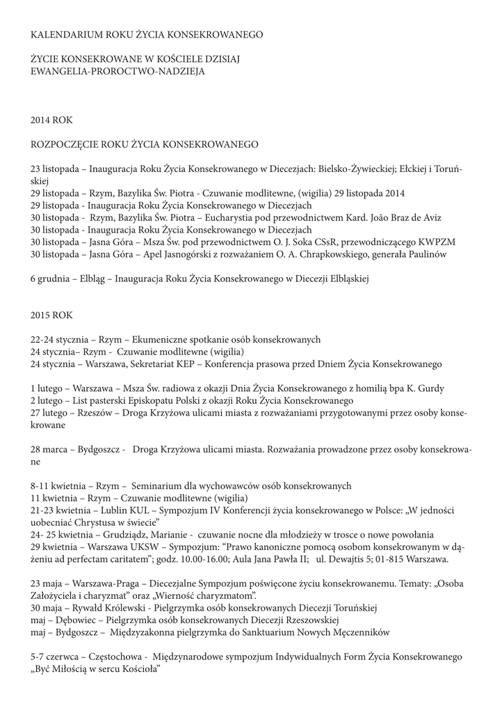 KALENDARIUM ROKU ŻYCIA KONSEKROWANEGO ŻYCIE KONSEKROWANE W KOŚCIELE DZISIAJ EWANGELIA-PROROCTWO-NADZIEJA 2014 ROK ROZPOCZĘCIE ROKU ŻYCIA KONSEKROWANEGO 23 listopada – Inauguracja Roku Życia Konsekrowanego w Diecezjach: Bielsko-Żywieckiej; Ełckiej i Toruńskiej 29 listopada – Rzym, Bazylika Św. Piotra - Czuwanie modlitewne, (wigilia) 29 listopada 2014 29 listopada - Inauguracja Roku Życia Konsekrowanego w Diecezjach 30 listopada - Rzym, Bazylika Św. Piotra – Eucharystia pod przewodnictwem Kard. João Braz de Aviz 30 listopada - Inauguracja Roku Życia Konsekrowanego w Diecezjach 30 listopada – Jasna Góra – Msza Św. pod przewodnictwem O. J. Soka CSsR, przewodniczącego KWPZM 30 listopada – Jasna Góra – Apel Jasnogórski z rozważaniem O. A. Chrapkowskiego, generała Paulinów 6 grudnia – Elbląg – Inauguracja Roku Życia Konsekrowanego w Diecezji Elbląskiej 2015 ROK 22-24 stycznia – Rzym – Ekumeniczne spotkanie osób konsekrowanych 24 stycznia– Rzym - Czuwanie modlitewne (wigilia) 24 stycznia – Warszawa, Sekretariat KEP – Konferencja prasowa przed Dniem Życia Konsekrowanego 1 lutego – Warszawa – Msza Św. radiowa z okazji Dnia Życia Konsekrowanego z homilią bpa K. Gurdy 2 lutego – List pasterski Episkopatu Polski z okazji Roku Życia Konsekrowanego 27 lutego – Rzeszów – Droga Krzyżowa ulicami miasta z rozważaniami przygotowanymi przez osoby konsekrowane 28 marca – Bydgoszcz - Droga Krzyżowa ulicami miasta. Rozważania prowadzone przez osoby konsekrowane 8-11 kwietnia – Rzym – Seminarium dla wychowawców osób konsekrowanych 11 kwietnia – Rzym – Czuwanie modlitewne (wigilia) 21-23 kwietnia – Lublin KUL – Sympozjum IV Konferencji życia konsekrowanego w Polsce: „W jedności uobecniać Chrystusa w świecie” 24- 25 kwietnia – Grudziądz, Marianie - czuwanie nocne dla młodzieży w trosce o nowe powołania 29 kwietnia – Warszawa UKSW – Sympozjum: “Prawo kanoniczne pomocą osobom konsekrowanym w dążeniu ad perfectam caritatem”; godz. 10.00-16.00; Aula Jana Pawła II; ul. Dewajtis 5; 01-815 Warszawa. 23 maja – Warszawa-Praga – Diecezjalne Sympozjum poświęcone życiu konsekrowanemu. Tematy: „Osoba Założyciela i charyzmat” oraz „Wierność charyzmatom”. 30 maja – Rywałd Królewski - Pielgrzymka osób konsekrowanych Diecezji Toruńskiej maj – Dębowiec – Pielgrzymka osób konsekrowanych Diecezji Rzeszowskiej maj – Bydgoszcz – Międzyzakonna pielgrzymka do Sanktuarium Nowych Męczenników 5-7 czerwca – Częstochowa - Międzynarodowe sympozjum Indywidualnych Form Życia Konsekrowanego „Być Miłością w sercu Kościoła” 13 czerwca – Kadyny, Franciszkanie – Spotkanie osób konsekrowanych Diecezji Elbląskiej. Mszy św. przewodniczy Bp Jacek Jezierski 19 września – Kwidzyn, Benedyktynki – Spotkanie osób konsekrowanych Diecezji Elbląskiej. Mszy św. przewodniczy Bp Jacek Jezierski 23-26 września - Jasna Góra - Kongres Młodych Osób Konsekrowanych: „Radość Konsekracji” 23 - 26 września – Rzym – Warsztaty dla młodych osób konsekrowanych 25 września – Rzym – Czuwanie modlitewne 3 października – Gietrzwałd - Pielgrzymka osób konsekrowanych z północno-wschodnich diecezji Polski listopad – Rzeszów – Sympozjum diecezjalne w 50-rocznice Dekretu o przystosowanej do współczesności odnowie życia zakonnego „Perfectae caritatis” 2016 ROK 24 stycznia - 02 lutego – Rzym – ŚWIATOWY TYDZIEŃ ŻYCIA KONSEKROWANEGO Jedność życia konsekrowanego w Kościele. Ewangeliczne pielgrzymowanie (sequela evangelica) ku przyszłości Uczestniczą: Życie monastyczne - Instytuty i Stowarzyszenia Apostolskie- Instytuty świeckie - Ordo virginum - Nowe formy życia konsekrowanego 27 - 30 stycznia 2016 – Rzym – Sympozjum Międzynarodowe: Ewangeliczne pójście za Jezusem (sequela evangelica) jako stała forma życia w Kościele. Spojrzenie w przyszłość w świetle aktualnych procesów. Uczestniczą Instytuty Życia Konsekrowanego i Stowarzyszenia Życia Apostolskiego 28 - 31 stycznia – Rzym – Sympozjum Międzynarodowe dla Zakonów Monastycznych 29 - 31 stycznia – Rzym – Sympozjum Międzynarodowe dla Instytutów Świeckich 29 - 31 stycznia – Rzym – Sympozjum Międzynarodowe dla Ordo Virginum 30 stycznia – Rzym – Czuwanie modlitewne w Bazylice Św. Piotra: „Proroctwo, świętość i męczeństwo w świecie zlaicyzowanym” 01 lutego - Watykan - Audiencja u Ojca Świętego 01 lutego – Rzym – Bazylika Św. Piotra - Czuwanie modlitewne (wigilia) ZAKOŃCZENIE ROKU ŻYCIA KONSEKROWANEGO 02 lutego – Rzym – Światowy Dzień Życia Konsekrowanego, 02 lutego – Rzym – Bazylika Św. Piotra - Eucharystia na zakończenie Roku Życia Konsekrowanego 02 lutego – Zakończenie Roku Życia Konsekrowanego w Diecezjach _______________________________________________________________________________________ ____________________________ SIEDEM KIERUNKÓW PRZEŻYWANIA ROKU ŻYCIA KONSEKROWANEGO (określone przez Kongregację ds. Instytutów Życia Konsekrowanego i Stowarzyszeń Życia Apostolskiego) _______________________________________________________________________________________ ____________________________ 1. Sympozja naukowe i spotkania dyskusyjne organizowane przez Uniwersytety Papieskie prowadzone przez zakony, a poświęcone tematyce i problemom życia konsekrowanego. 2. „Memoria sanctorum” w życiu konsekrowanym. „Stationes” w miejscach o szczególnej wymowie apostolskiej. 3. „Memoria martyrum” osób konsekrowanych w XX i XXI wieku. „Stationes” w miejscach szczególnego świadectwa. 4. Łańcuch modlitwy klasztorów kontemplacyjnych. „Stationes” w klasztorach o szczególnym znaczeniu dla życia monastycznego. 5. Studium „online” dla zakonnic z klasztorów kontemplacyjnych. 6. Szczególne doświadczenia życia ewangelicznego, zrealizowane i podjęte na serio w różnych formach życia konsekrowanego i dialogu m