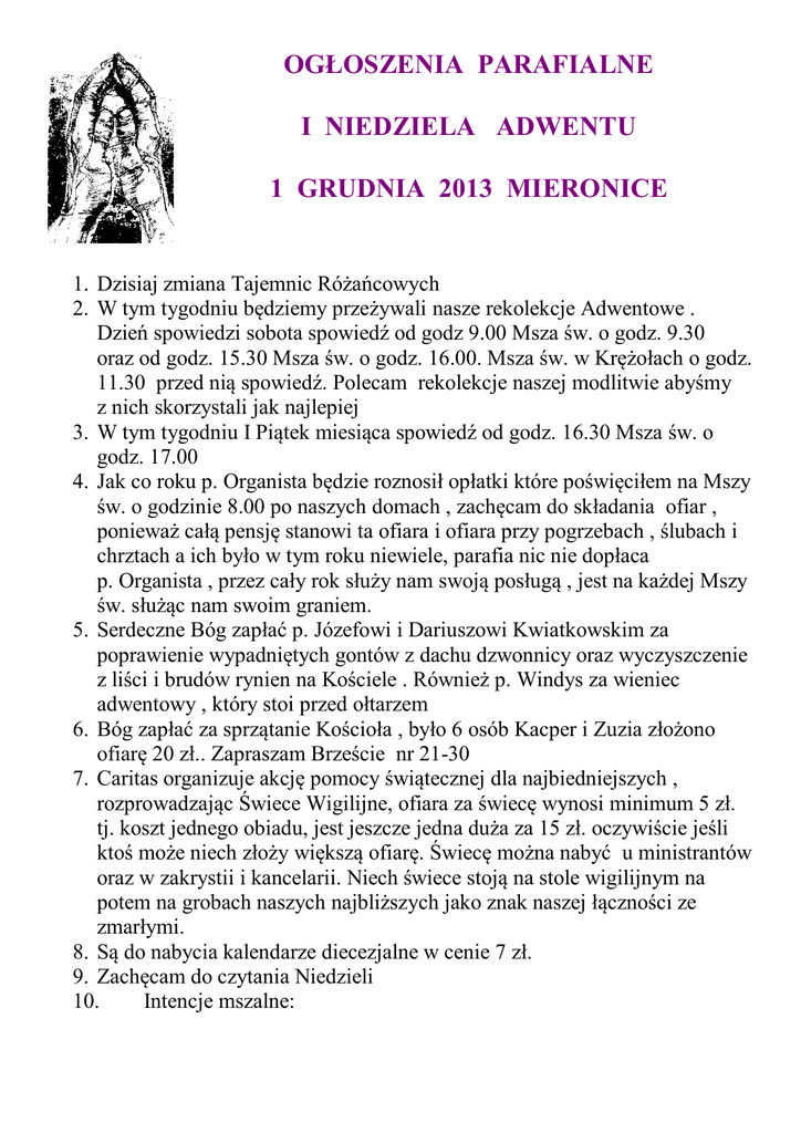 ogłoszenia parafialne i niedziela adwentu 1 grudnia 2013 mieronice