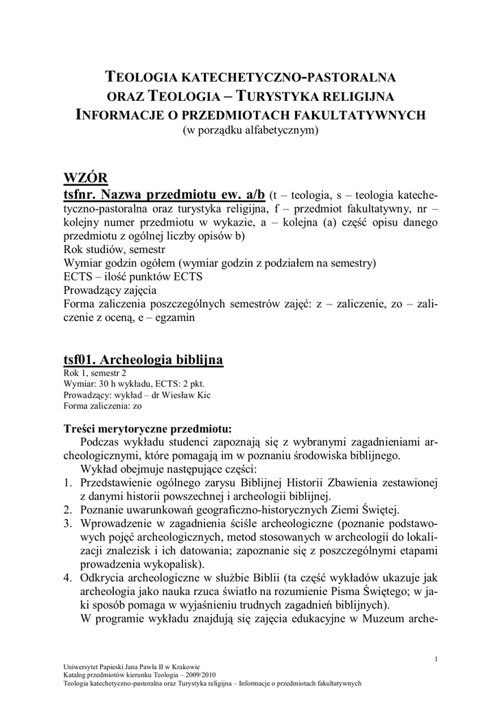 TEOLOGIA KATECHETYCZNO-PASTORALNA ORAZ TEOLOGIA – TURYSTYKA RELIGIJNA INFORMACJE O PRZEDMIOTACH FAKULTATYWNYCH (w porządku alfabetycznym) WZÓR tsfnr. Nazwa przedmiotu ew. a/b (t – teologia, s – teologia katechetyczno-pastoralna oraz turystyka religijna, f – przedmiot fakultatywny, nr – kolejny numer przedmiotu w wykazie, a – kolejna (a) część opisu danego przedmiotu z ogólnej liczby opisów b) Rok studiów, semestr Wymiar godzin ogółem (wymiar godzin z podziałem na semestry) ECTS – ilość punktów ECTS Prowadzący zajęcia Forma zaliczenia poszczególnych semestrów zajęć: z – zaliczenie, zo – zaliczenie z oceną, e – egzamin tsf01. Archeologia biblijna Rok 1, semestr 2 Wymiar: 30 h wykładu, ECTS: 2 pkt. Prowadzący: wykład – dr Wiesław Kic Forma zaliczenia: zo Treści merytoryczne przedmiotu: Podczas wykładu studenci zapoznają się z wybranymi zagadnieniami archeologicznymi, które pomagają im w poznaniu środowiska biblijnego. Wykład obejmuje następujące części: 1. Przedstawienie ogólnego zarysu Biblijnej Historii Zbawienia zestawionej z danymi historii powszechnej i archeologii biblijnej. 2. Poznanie uwarunkowań geograficzno-historycznych Ziemi Świętej. 3. Wprowadzenie w zagadnienia ściśle archeologiczne (poznanie podstawowych pojęć archeologicznych, metod stosowanych w archeologii do lokalizacji znalezisk i ich datowania; zapoznanie się z poszczególnymi etapami prowadzenia wykopalisk). 4. Odkrycia archeologiczne w służbie Biblii (ta część wykładów ukazuje jak archeologia jako nauka rzuca światło na rozumienie Pisma Świętego; w jaki sposób pomaga w wyjaśnieniu trudnych zagadnień biblijnych). W programie wykładu znajdują się zajęcia edukacyjne w Muzeum arche- 1 Uniwersytet Papieski Jana Pawła II w Krakowie Katalog przedmiotów kierunku Teologia – 2009/2010 Teologia katechetyczno-pastoralna oraz Turystyka religijna – Informacje o przedmiotach fakultatywnych ologicznym w Krakowie oraz w nowo otwartym, pierwszym w Polsce, ogrodzie biblijnym w Proszowicach. Wymagania wstępne: Podstawowe wiadomości na temat Pisma Świętego i Biblijnej Historii Zbawienia Cele przedmiotu: 1. Zdobycie ogólnych wiadomości na temat archeologii jako dyscypliny badawczej. 2. Poznanie mapy Ziemi Świętej łącznie z umiejętnością lokalizacji najważniejszych miejsc związanych z historią biblijną. 3. Uzyskanie podstawowej wiedzy na temat znaczenia najważniejszych stanowisk archeologicznych Ziemi Świętej. 4. Zdobycie ogólnej orientacji w zakresie możliwości i ograniczeń archeologii biblijnej jako dyscypliny pomocniczej biblistyki. Metody nauczania: Wykłady mają formę prezentacji multimedialnej. Wykłady, w tym: zajęcia w Muzeum Archeologicznym w Krakowie (2 h), zajęcia w Ogrodzie Biblijnym w Proszowicach (2 h). Metody oceny: Zaliczenie z oceną: 1. Studenci po pierwszej części wykładów zaliczają pisemny test ze znajomości Historii Zbawienia i wprowadzenia do archeologii; 2. W ciągu semestru przygotowują pracę semestralną na temat wybranego stanowiska archeologii biblijnej przedstawianą na zaliczeniu lub poddawani są sprawdzianowi wiedzy z chronologii epok archeologicznych Palestyny; 3. Na zaliczeniu muszą wykazać się umiejętnością lokalizacji na mapie Ziemi Świętej najważniejszych stanowisk archeologii biblijnej (wybranych z przedstawionej im wcześniej listy). Spis zalecanych lektur: Gądecki S., Archeologia biblijna, Gniezno 1994; Muszyński H, Mędala S., Archeologia Palestyny w zarysie, Pelplin 1984; Negev A., Silberman N. (red.), Encyklopedia archeologiczna Ziemi Świętej, Warszawa 2002; Pritchard I. B. (red.), Wielki Atlas Biblijny, Warszawa 1994; Shanks H. (red.), Starożytny Izrael. Od Abrahama do zburzenia świątyni jerozolimskiej przez Rzymian, Warszawa 2007; Śliwa J., Sztuka i Archeologia Starożytnego Wschodu, Kraków 1997; de Vaux R., Instytucje Starego Testamentu, Poznań 2004. tsf02. Emisja głosu Rok 5, semestr 10 Wymiar: 30 h wykładu, ECTS: 2 pkt. Prowadzący: wykład – mgr Marcin Wasilewski-Kruk Forma zaliczenia: z 2 Uniwersytet Papieski Jana Pawła II w Krakowie Katalog przedmiotów kierunku Teologia – 2009/2010 Teologia katechetyczno-pastoralna oraz Turystyka religijna – Informacje o przedmiotach fakultatywnych Treści merytoryczne przedmiotu: Wykłady obejmują zagadnienia teoretyczne związane z budową i higieną aparatu głosowego, zjawiska impostacji głosu oraz szereg zagadnień i ćwiczeń dotyczących praktycznej metody pracy nad głosem. Cele przedmiotu: Umiejętność zawodowego posługiwania się głosem w toku pracy pedagogicznej. Metody nauczania: Wykłady / zajęcia praktyczne. Metody oceny: Ćwiczenia praktyczne. Spis zalecanych lektur: Strzałkowska M., Gimnastyka dla języka, Poznań 2004; Tarasiewicz B., Mówię i śpiewam świadomie, Kraków 2003; Toczyska B., Elementarne ćwiczenia dykcji, Gdańsk 1998. tsf03. Filozofia Boga Rok 2, semestr 3 Wymiar: 30 h wykładu, ECTS: 2 pkt. Prowadzący: wykład – ks. dr Dariusz Oko Forma zaliczenia: zo Treści merytoryczne przedmiotu: Wykład, którego treścią jest współczesna systematyczna teologia naturalna przedstawiona na tle dziejów filozofii Boga. Szczególna uwaga zostaje poświęcona krytyce idei Boga przeprowadzonej przez Kanta oraz L. Feuerbacha, K. Marksa, F. Nietzschego, M. Heideggera i J.-P. Sartra. Jako koncepcja zawierająca odpowiedź na te krytyki, a zarazem uwzględniająca różnorakie uwarunkowania afirmacji Boga prezentowana jest filozofia Boga rozwijana w ramach tzw. transcendentalizmu katolickiego (między innymi przez B. Lonergana, E. Coretha, J. B. Lotza, K. Rahnera) – zakorzeniona zarówno w tradycji klasycznej, jak i transcendentalnej filozofii niemieckiej. 1. Filozoficzne koncepcje Boga w starożytności, średniowieczu i nowożytności. 2. Główni krytycy idei Boga. 3. Metoda transcendentalna. 4. Egzystencjalne, racjonalne i religijne uwarunkowania afirmacji Boga. 5. Drogi