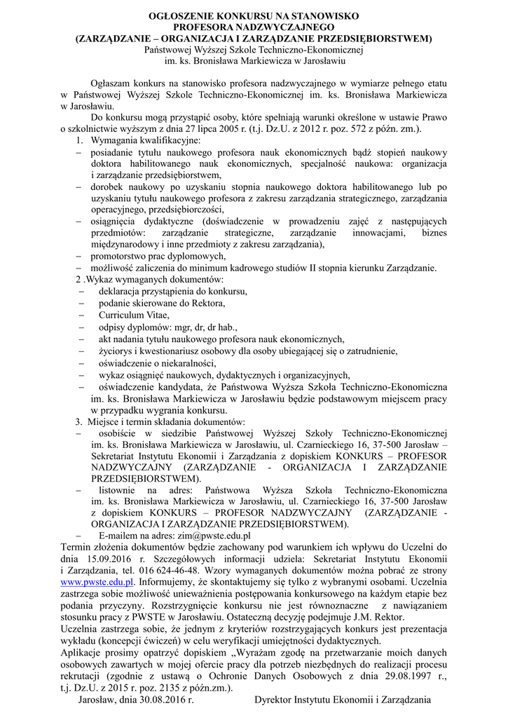 OGŁOSZENIE KONKURSU NA STANOWISKO PROFESORA NADZWYCZAJNEGO (ZARZĄDZANIE – ORGANIZACJA I ZARZĄDZANIE PRZEDSIĘBIORSTWEM) Państwowej Wyższej Szkole Techniczno-Ekonomicznej im. ks. Bronisława Markiewicza w Jarosławiu Ogłaszam konkurs na stanowisko profesora nadzwyczajnego w wymiarze pełnego etatu w Państwowej Wyższej Szkole Techniczno-Ekonomicznej im. ks. Bronisława Markiewicza w Jarosławiu. Do konkursu mogą przystąpić osoby, które spełniają warunki określone w ustawie Prawo o szkolnictwie wyższym z dnia 27 lipca 2005 r. (t.j. Dz.U. z 2012 r. poz. 572 z późn. zm.). 1. Wymagania kwalifikacyjne: posiadanie tytułu naukowego profesora nauk ekonomicznych bądź stopień naukowy doktora habilitowanego nauk ekonomicznych, specjalność naukowa: organizacja i zarządzanie przedsiębiorstwem, dorobek naukowy po uzyskaniu stopnia naukowego doktora habilitowanego lub po uzyskaniu tytułu naukowego profesora z zakresu zarządzania strategicznego, zarządzania operacyjnego, przedsiębiorczości, osiągnięcia dydaktyczne (doświadczenie w prowadzeniu zajęć z następujących przedmiotów: zarządzanie strategiczne, zarządzanie innowacjami, biznes międzynarodowy i inne przedmioty z zakresu zarządzania), promotorstwo prac dyplomowych, możliwość zaliczenia do minimum kadrowego studiów II stopnia kierunku Zarządzanie. 2 .Wykaz wymaganych dokumentów: deklaracja przystąpienia do konkursu, podanie skierowane do Rektora, Curriculum Vitae, odpisy dyplomów: mgr, dr, dr hab., akt nadania tytułu naukowego profesora nauk ekonomicznych, życiorys i kwestionariusz osobowy dla osoby ubiegającej się o zatrudnienie, oświadczenie o niekaralności, wykaz osiągnięć naukowych, dydaktycznych i organizacyjnych, oświadczenie kandydata, że Państwowa Wyższa Szkoła Techniczno-Ekonomiczna im. ks. Bronisława Markiewicza w Jarosławiu będzie podstawowym miejscem pracy w przypadku wygrania konkursu. 3. Miejsce i termin składania dokumentów: osobiście w siedzibie Państwowej Wyższej Szkoły Techniczno-Ekonomicznej im. ks. Bronisława Markiewicza w Jarosławiu, ul. Czarnieckiego 16, 37-500 Jarosław – Sekretariat Instytutu Ekonomii i Zarządzania z dopiskiem KONKURS – PROFESOR NADZWYCZAJNY (ZARZĄDZANIE - ORGANIZACJA I ZARZĄDZANIE PRZEDSIĘBIORSTWEM). listownie na adres: Państwowa Wyższa Szkoła Techniczno-Ekonomiczna im. ks. Bronisława Markiewicza w Jarosławiu, ul. Czarnieckiego 16, 37-500 Jarosław z dopiskiem KONKURS – PROFESOR NADZWYCZAJNY (ZARZĄDZANIE ORGANIZACJA I ZARZĄDZANIE PRZEDSIĘBIORSTWEM). E-mailem na adres: [email protected] Termin złożenia dokumentów będzie zachowany pod warunkiem ich wpływu do Uczelni do dnia 15.09.2016 r. Szczegółowych informacji udziela: Sekretariat Instytutu Ekonomii i Zarządzania, tel. 016 624-46-48. Wzory wymaganych dokumentów można pobrać ze strony www.pwste.edu.pl. Informujemy, że skontaktujemy się tylko z wybranymi osobami. Uczelnia zastrzega sobie możliwość unieważnienia postępowania konkursowego na każdym etapie bez podania przyczyny. Rozstrzygnięcie konkursu nie jest równoznaczne z nawiązaniem stosunku pracy z PWSTE w Jarosławiu. Ostateczną decyzję podejmuje J.M. Rektor. Uczelnia zastrzega sobie, że jednym z kryteriów rozstrzygających konkurs jest prezentacja wykładu (koncepcji ćwiczeń) w celu weryfikacji umiejętności dydaktycznych. Aplikacje prosimy opatrzyć dopiskiem „Wyrażam zgodę na przetwarzanie moich danych osobowych zawartych w mojej ofercie pracy dla potrzeb niezbędnych do realizacji procesu rekrutacji (zgodnie z ustawą o Ochronie Danych Osobowych z dnia 29.08.1997 r., t.j. Dz.U. z 2015 r. poz. 2135 z późn.zm.). Jarosław, dnia 30.08.2016 r. Dyrektor Instytutu Ekonomii i Zarządzania