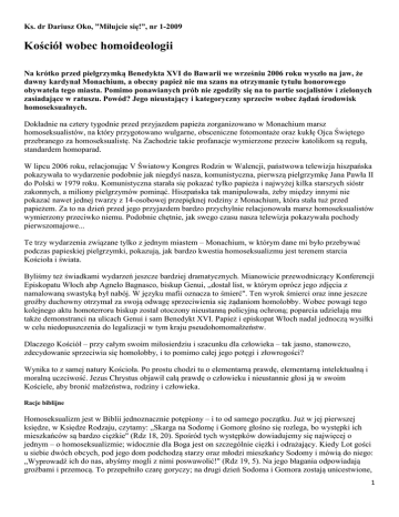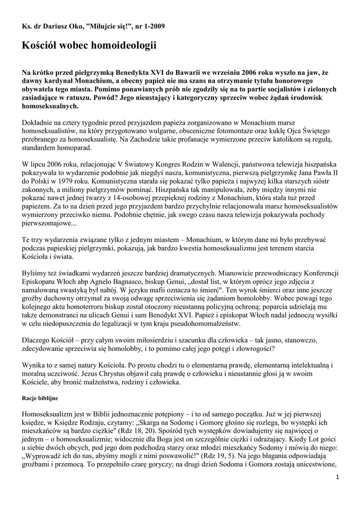 Ks. dr Dariusz Oko, ”Miłujcie się!”, nr 1-2009 Kościół wobec homoideologii Na krótko przed pielgrzymką Benedykta XVI do Bawarii we wrześniu 2006 roku wyszło na jaw, że dawny kardynał Monachium, a obecny papież nie ma szans na otrzymanie tytułu honorowego obywatela tego miasta. Pomimo ponawianych prób nie zgodziły się na to partie socjalistów i zielonych zasiadające w ratuszu. Powód? Jego nieustający i kategoryczny sprzeciw wobec żądań środowisk homoseksualnych. Dokładnie na cztery tygodnie przed przyjazdem papieża zorganizowano w Monachium marsz homoseksualistów, na który przygotowano wulgarne, obsceniczne fotomontaże oraz kukłę Ojca Świętego przebranego za homoseksualistę. Na Zachodzie takie profanacje wymierzone przeciw katolikom są regułą, standardem homoparad. W lipcu 2006 roku, relacjonując V Światowy Kongres Rodzin w Walencji, państwowa telewizja hiszpańska pokazywała to wydarzenie podobnie jak niegdyś nasza, komunistyczna, pierwszą pielgrzymkę Jana Pawła II do Polski w 1979 roku. Komunistyczna starała się pokazać tylko papieża i najwyżej kilka starszych sióstr zakonnych, a miliony pielgrzymów pominąć. Hiszpańska tak manipulowała, żeby między innymi nie pokazać nawet jednej twarzy z 14-osobowej przepięknej rodziny z Monachium, która stała tuż przed papieżem. Za to na dzień przed jego przyjazdem bardzo przychylnie relacjonowała marsz homoseksualistów wymierzony przeciwko niemu. Podobnie chętnie, jak swego czasu nasza telewizja pokazywała pochody pierwszomajowe... Te trzy wydarzenia związane tylko z jednym miastem – Monachium, w którym dane mi było przebywać podczas papieskiej pielgrzymki, pokazują, jak bardzo kwestia homoseksualizmu jest terenem starcia Kościoła i świata. Byliśmy też świadkami wydarzeń jeszcze bardziej dramatycznych. Mianowicie przewodniczący Konferencji Episkopatu Włoch abp Agnelo Bagnasco, biskup Genui, „dostał list, w którym oprócz jego zdjęcia z namalowaną swastyką był nabój. W języku mafii oznacza to śmierć". Ten wyrok śmierci oraz inne jeszcze groźby duchowny otrzymał za swoją odwagę sprzeciwienia się żądaniom homolobby. Wobec powagi tego kolejnego aktu homoterroru biskup został otoczony nieustanną policyjną ochroną; poparcia udzielają mu także demonstranci na ulicach Genui i sam Benedykt XVI. Papież i episkopat Włoch nadal jednoczą wysiłki w celu niedopuszczenia do legalizacji w tym kraju pseudohomomałżeństw. Dlaczego Kościół – przy całym swoim miłosierdziu i szacunku dla człowieka – tak jasno, stanowczo, zdecydowanie sprzeciwia się homolobby, i to pomimo całej jego potęgi i złowrogości? Wynika to z samej natury Kościoła. Po prostu chodzi tu o elementarną prawdę, elementarną intelektualną i moralną uczciwość. Jezus Chrystus objawił całą prawdę o człowieku i nieustannie głosi ją w swoim Kościele, aby bronić małżeństwa, rodziny i człowieka. Racje biblijne Homoseksualizm jest w Biblii jednoznacznie potępiony – i to od samego początku. Już w jej pierwszej księdze, w Księdze Rodzaju, czytamy: „Skarga na Sodomę i Gomorę głośno się rozlega, bo występki ich mieszkańców są bardzo ciężkie" (Rdz 18, 20). Spośród tych występków dowiadujemy się najwięcej o jednym – o homoseksualizmie; widocznie dla Boga jest on szczególnie ciężki i odrażający. Kiedy Lot gości u siebie dwóch obcych, pod jego dom podchodzą starzy oraz młodzi mieszkańcy Sodomy i mówią do niego: „Wyprowadź ich do nas, abyśmy mogli z nimi poswawolić!" (Rdz 19, 5). Na jego błagania odpowiadają groźbami i przemocą. To przepełniło czarę goryczy; na drugi dzień Sodoma i Gomora zostają unicestwione, 1 ocalony zostaje tylko jeden jedyny sprawiedliwy – Lot i jego rodzina. To od tego wydarzenia bierze się wyrażenie „sodoma i gomora" na określenie skrajnego ludzkiego rozpasania i zaślepienia moralnego. Bardzo podobną historię znajdujemy w Księdze Sędziów, w rozdziale 19. Również tam ludzie, którzy gotowi są nawet do współżycia homoseksualnego jako kolejnej formy swojego wyuzdania, dopuszczają się strasznego grzechu, którego konsekwencją jest zgładzenie prawie całego pokolenia Beniamitów. Potępienie homoseksualizmu jest powtórzone z jeszcze większą mocą w Nowym Testamencie. Święty Paweł wyraźnie mówi, że czynni homoseksualiści, podobnie jak inni grzesznicy, którzy nie chcą się nawrócić, ryzykują potępienie: „Nie łudźcie się! Ani rozpustnicy, ani bałwochwalcy, ani cudzołożnicy, ani rozwieźli, ani mężczyźni współżyjący ze sobą, (...) nie odziedziczą królestwa Bożego” (1 Kor 6, 9 i n.). Dla św. Pawła jednym z podstawowych znaków tego, jak głęboko człowiek upadł, jak bardzo sam sobie zaprzecza, jak daleko odszedł od Boga, jest właśnie homoseksualizm (Rz 1, 18-32). Znana jest mu też propaganda homoseksualistów (jak dzisiaj) drwiąca w twarz Bogu. Pisze: „Oni to, mimo że dobrze znają wyrok Boży, iż ci, którzy się takich czynów dopuszczają, winni są śmierci, nie tylko je popełniają, ale nadto chwalą tych, którzy to czynią" (Rz 1, 32). Podobne słowa znajdujemy w Liście do Tymoteusza (1, 3-11) oraz w Księdze Kapłańskiej (18, 19-23). Tak zdecydowane podeptanie zamysłu Bożego, zanegowanie naturalnej komplementarności mężczyzny i kobiety, musi na wielu polach dogłębnie ranić i niszczyć człowieka, musi z czasem przynosić katastrofalne skutki – musi więc pociągać za sobą Boże potępienie Racje teologiczne – z Tradycji Dla Kościoła nieodwołalne znaczenie ma nauka głoszona zawsze i powszechnie. Taką jest potępienie czynnego homoseksualizmu, które Kościół powtarza nieustannie. Znajdujemy je także w ostatnim Katechizmie Kościoła Katolickiego, w punktach 2357-2359 i 2396. Podkreśla się tam, że same (niezawinione przecież) skłonności homoseksualne nie są grzechem, lecz próbą, wyzwaniem, 