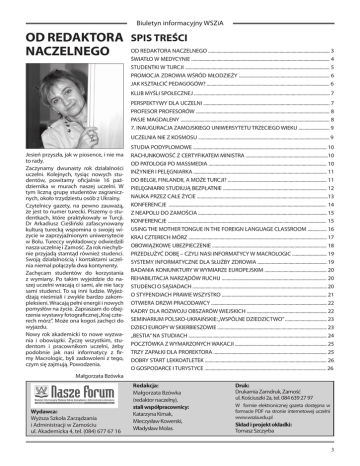 Biuletyn informacyjny WSZiA OD REDAKTORA NACZELNEGO SPIS TREŚCI OD REDAKTORA NACZELNEGO ...................................................................................................... 3 ŚWIATŁO W MEDYCYNIE .................................................................................................................... 4 STUDENTKI W TURCJI ......................................................................................................................... 5 PROMOCJA ZDROWIA WŚRÓD MŁODZIEŻY ............................................................................ 6 JAK KSZTAŁCIĆ PEDAGOGÓW? ....................................................................................................... 6 KLUB MYŚLI SPOŁECZNEJ .................................................................................................................. 7 PERSPEKTYWY DLA UCZELNI .......................................................................................................... 7 PROFESOR PROFESORÓW ................................................................................................................ 8 PASJE MAGDALENY ............................................................................................................................. 8 7. INAUGURACJA ZAMOJSKIEGO UNIWERSYTETU TRZECIEGO WIEKU .......................... 9 UCZELNIA NIE Z KOSMOSU .............................................................................................................. 9 Jesień przyszła, jak w piosence, i nie ma to rady. Zaczynamy dwunasty rok działalności uczelni. Kolejnych, tysiąc nowych studentów, powitamy oficjalnie 16 października w murach naszej uczelni. W tym liczną grupę studentów zagranicznych, około trzydziestu osób z Ukrainy. Czytelnicy gazety, na pewno zauważą, że jest to numer turecki. Piszemy o studentkach, które praktykowały w Turcji. Dr Arkadiusz Cieśliński zafascynowany kulturą turecką wspomina o swojej wizycie w zaprzyjaźnionym uniwersytecie w Bolu. Tureccy wykładowcy odwiedzili nasza uczelnię i Zamość. Za rok niechybnie przyjadą stamtąd również studenci. Swoją działalnością i kontaktami uczelnia niemal połączyła dwa kontynenty. Zachęcam studentów do korzystania z wymiany. Po takim wyjeździe do naszej uczelni wracają ci sami, ale nie tacy sami studenci. To są inni ludzie. Wyjeżdżają nieśmiali i zwykle bardzo zakompleksieni. Wracają pełni energii i nowych pomysłów na życie. Zapraszam do obejrzenia wystawy fotograficznej „Kraj czterech mórz”. Może ona kogoś zachęci do wyjazdu. Nowy rok akademicki to nowe wyzwania i obowiązki. Życzę wszystkim, studentom i pracownikom uczelni, żeby podobnie jak nasi informatycy z firmy Macrologic, byli zadowoleni z tego, czym się zajmują. Powodzenia. STUDIA PODYPLOMOWE ................................................................................................................ 10 RACHUNKOWOŚĆ Z CERTYFIKATEM MINISTRA .....................................................................10 OD PATOLOGII PO MASSMEDIA ................................................................................................... 10 INŻYNIER I PELĘGNIARKA ................................................................................................................ 11 DO BELGII, FINLANDII, A MOŻE TURCJI? ................................................................................... 11 PIELĘGNIARKI STUDIUJĄ BEZPŁATNIE ....................................................................................... 12 NAUKA PRZEZ CAŁE ŻYCIE ..............................................................................................................13 KONFERENCJE .................................................................................................................................... 14 Z NEAPOLU DO ZAMOŚCIA ............................................................................................................ 15 KONFERENCJE ..................................................................................................................................... 15 USING THE MOTHER TONGUE IN THE FOREIGN LANGUAGE CLASSROOM ................ 16 KRAJ CZTERECH MÓRZ .................................................................................................................... 17 OBOWIĄZKOWE UBEZPIECZENIE ................................................................................................ 18 PRZEDŁUŻYĆ DOBĘ – CZYLI NASI INFORMATYCY W MACROLOGIC ............................. 19 SYSTEMY INFORMATYCZNE DLA SŁUŻBY ZDROWIA .......................................................... 19 BADANIA KONIUNKTURY W WYMIARZE EUROPEJSKIM .................................................... 20 REHABILITACJA NARZĄDÓW RUCHU ........................................................................................ 20 STUDENCI O SĄSIADACH ................................................................................................................. 20 O STYPENDIACH PRAWIE WSZYSTKO ........................................................................................ 21 OTWIERA DRZWI PRACODAWCY ................................................................................................. 22 KADRY DLA ROZWOJU OBSZARÓW WIEJSKICH ................................................................... 22 SEMINARIUM POLSKO-UKRAIŃSKIE: „WSPÓLNE DZIEDZICTWO” ................................... 23 DZIECI EUROPY W SKIERBIESZOWIE ............................................................................................ 23 „BESTIA” NA STUDIACH .................................................................................................................... 24 POCZTÓWKA Z WYMARZONYCH WAKACJI ............................................................................. 25 TRZY ZAPAŁKI DLA PROREKTORA ......................................................................