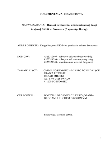 DOKUMENTACJA PROJEKTOWA NAZWA ZADANIA: Remont nawierzchni asfaltobetonowej drogi krajowej DK-94 w Sosnowcu (fragmenty- II etap). ADRES OBIEKTU: Droga Krajowa DK-94 w granicach miasta Sosnowca KOD CPV: 45233120-6 - roboty w zakresie budowy dróg 45233142-6 - roboty w zakresie naprawy dróg 45233223-8 - wymiana nawierzchni drogowej ZAMAWIAJĄCY: GMINA SOSNOWIEC – MIASTO POSIADAJĄCE PRAWA POWIATU URZĄD MIEJSKI AL. ZWYCIĘSTWA 20 41-200 SOSNOWIEC OPRACOWAŁ: WYDZIAŁ ORGANIZACJI ZARZĄDZANIA DROGAMI I RUCHEM DROGOWYM Sosnowiec, sierpień 2009r. 1 Spis dokumentacji: I. II. III. Opis techniczny, Plan sytuacyjny lokalizacji uszkodzeń i remontu, Przyjęcie zgłoszenia robót nie wymagających pozwolenia na budowę. 2 I. OPIS TECHNICZNY 1. Lokalizacja – położenie. Przedmiotem zadania jest remont Drogi Krajowej DK-94 : - w rejonie ul. Będzińskiej ; na obiekcie mostowym nad torami kolejowymi i na połączeniu między obiektami, - od ul. Jabłoniowej do połączenia z DK-86. 2. Cel zadania. Celem remontu jest poprawa stanu istniejącego jezdni na drodze i obiekcie mostowym, usunięcie obecnie stwierdzonych uszkodzeń, ograniczenie zagrożenia dla użytkowników ruchu, ograniczenie tempa dalszej degradacji nawierzchni, zwiększenie komfortu jazdy. 3. Opis stanu istniejącego 3.1 Stan istniejący określono na podstawie wizji w terenie dokonanej przez służby Wydziału Organizacji Zarządzania Drogami i Ruchem Drogowym Urzędu Miasta w Sosnowcu oraz rozpoznania konstrukcji dla odcinka od ul. Jana Długosza do granicy z miastem Dąbrowa Górnicza wykonanego przez BUREAU VERITAS Sp. z o.o. dla odcinka drogi od ul. Jana Długosza do ul. Jabłoniowej a także posiadanej dokumentacji obiektu mostowego. 4. Stan istniejący i technologia naprawy. 4.1 Założenia wyjściowe: a) podstawy prawne: Art. 3 ust. 8 Prawo budowlane (tekst jednolity - Dz. U. z 2006r. Nr 156, poz. 1118, z późn. zm.) remont – wykonanie w istniejącym obiekcie budowlanym polegających na odtworzeniu stanu pierwotnego, a nie stanowiących bieżącej konserwacji, przy czym dopuszcza się stosowanie wyrobów budowlanych innych niż użyto w stanie pierwotnym, Art.28 ust. 2, pkt 1 Prawo budowlane (tekst jednolity - Dz. U. z 2006r. Nr 156, poz. 1118, z późn. zm.) pozwolenia na budowę nie wymaga wykonania robót budowlanych polegających na remoncie istniejących obiektów budowlanych, z wyjątkiem obiektów wpisanych do zabytków kultury. 3 4.2 Stan istniejący usytuowania w planie Stan istniejący na odcinku objętym opracowaniem droga DK-94 w swoim przekroju poprzecznym posiada dwie jezdnie dwupasowe z utwardzonym poboczem (pas awaryjny) rozdzielone pasem dzielącym. Droga nie posiada opasek ale miejscami jest ograniczona krawężnikami. 4.3 Stan istniejący nawierzchni jezdni drogi Na podstawie wizji przeprowadzonych w terenie stwierdza się brak połączenia międzywarstwowego. Na lokalnych odcinkach jezdni drogi stwierdza się uszkodzenia krawędzi jezdni z uwagi na brak prawidłowo wykonanego i utwardzonego podłoża. Stwierdza się, lokalne ubytki w nawierzchni jezdni, lokalne wyłuszczenia w warstwie ścieralnej nawierzchni drogi, lokalne spękania podłużne i poprzeczne nawierzchni ścieralnej jezdni drogi . Na podstawie posiadanych badań , oraz opinii BUREAU VERITAS Sp. z o.o. stwierdza się że ugięcia miarodajne nie są przekroczone. Na obiekcie mostowym nad torami kolejowymi stwierdza się lokalne ubytki i lokalne wyłuszczenia w warstwie ścieralnej nawierzchni. 4.4. Technologia remontu nawierzchni jezdni drogi. W celu poprawy stanu istniejącego zakłada się remont nawierzchni jezdni, polegający na wymianie warstw nawierzchni bez podnoszenia niwelety drogi. Zakłada się naprawę w technologii na gorąco za pomocą gotowej mieszanki mineralno-asfaltowej zagęszczanej mechanicznie. Wszystkie prace remontowe będą prowadzone przy zachowaniu ruchu kołowego. Technika napraw nawierzchni jezdni : dla drogi: usunięcie starych nawierzchni poprzez frezowanie na głębokość 8cm, ułożenie siatki stalowej na masie nie gorszej niż „slurry seal”, ułożenie nowych nawierzchni z mieszanek mineralno- asfaltowych warstwa wiążąca, ułożenie nawierzchni z mieszanek mineralno- asfaltowych warstwa ścieralna odporna na deformacje trwałe SMA. Dla obiektu mostowego usunięcie starych nawierzchni poprzez frezowanie na głębokość 5cm, oczyszczenie i skropienie sfrezowanej nawierzchni bitumem, ułożenie nawierzchni z mieszanek mineralno- asfaltowych warstwa ścieralna odporna na deformacje trwałe SMA. 4 Remontowane fragmenty nawierzchni jezdni DK-94: Zakres robót: - w rejonie ul. Będzińskiej ; na obiekcie mostowym nad torami kolejowymi 5.822,00m2 na połączeniu między obiektami 860,00m2 - od ul. Jabłoniowej do połączenia z DK-86. 2.020,00m2 Opis robót : - na obiekcie mostowym - frezowanie gł. 5cm; ułożeniu nawierzchni ścieralnej SMA gr.5cm; uszczelnienie nawierzchni przy dylatacjach, krawężnikach i kratkach ściekowych taśmą, - na drodze – frezowanie gł. 8cm; ułożenie siatki stalowej dla wzmocnienia konstrukcji drogi; ułożenie nawierzchni asfaltobetonowej w-wa wiążąca gr 4cm; ułożenie nawierzchni asfaltobetonowej w-wa ścieralna SMA gr 4cm; Dokładne fragmenty remontowanej nawierzchni będą wskazane w dniu przejęcia placu budowy przez Wykonawcę. II Lokalizacja robót. 1. Plan sytuacyjny lokalizacji uszkodzeń i remontu– rysunek nr 1. 5 6 III. Zgłoszenie robót bud. nie wymagających pozwolenia na budowę. 7 8 9