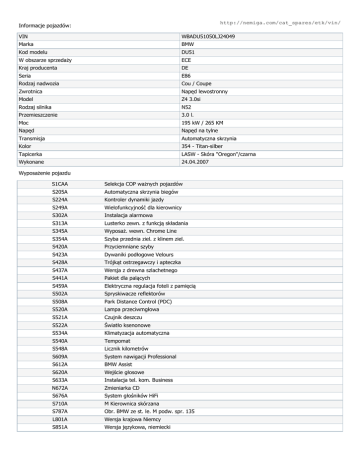 http://nemiga.com/cat_spares/etk/vin/ Informacje pojazdów: VIN WBADU51050LJ24049 Marka BMW Kod modelu DU51 W obszarze sprzedaży ECE Kraj producenta DE Seria E86 Rodzaj nadwozia Cou / Coupe Zwrotnica Napęd lewostronny Model Z4 3.0si Rodzaj silnika N52 Przemieszczenie 3.0 l. Moc 195 kW / 265 KM Napęd Napęd na tylne Transmisja Automatyczna skrzynia Kolor 354 - Titan-silber Tapicerka LASW - Skóra "Oregon"/czarna Wykonane 24.04.2007 Wyposażenie pojazdu S1CAA Selekcja COP ważnych pojazdów S205A Automatyczna skrzynia biegów S224A Kontroler dynamiki jazdy S249A Wielofunkcyjność dla kierownicy S302A Instalacja alarmowa S313A Lusterko zewn. z funkcją składania S345A Wyposaż. wewn. Chrome Line S354A Szyba przednia ziel. z klinem ziel. S420A Przyciemniane szyby S423A Dywaniki podłogowe Velours S428A Trójkąt ostrzegawczy i apteczka S437A Wersja z drewna szlachetnego S441A Pakiet dla palących S459A Elektryczna regulacja foteli z pamięcią S502A Spryskiwacze reflektorów S508A Park Distance Control (PDC) S520A Lampa przeciwmgłowa S521A Czujnik deszczu S522A Światło ksenonowe S534A Klimatyzacja automatyczna S540A Tempomat S548A Licznik kilometrów S609A System nawigacji Professional S612A BMW Assist S620A Wejście głosowe S633A Instalacja tel. kom. Business N672A Zmieniarka CD S676A System głośników HiFi S710A M Kierownica skórzana S787A Obr. BMW ze st. le. M podw. spr. 135 L801A Wersja krajowa Niemcy S851A Wersja językowa, niemiecki S863A Spis dealerów, Europa S879A Literatura pokładowa, niemiecki S8SPA Sterowanie COP S925A Dummy-SALAPA S936A Dummy-SALAPA S964A Przy dost. zażądać płyty DVD nawigacji S9AAA Zabezp. zewn. pokrycia z tworzywa szt. Dokument przygotowany przez portal Automotive Nemiga.com. Informacje na temat VIN bezpłatnie!
