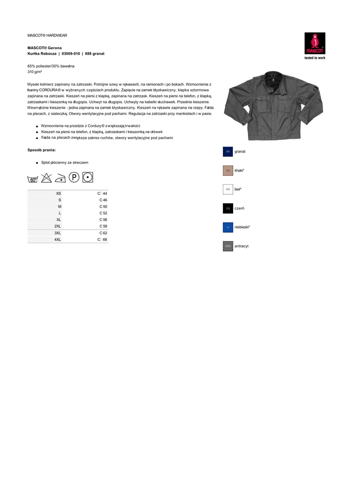 MASCOT® HARDWEAR MASCOT® Gerona Kurtka Robocza | 03009-010 | 888 granat 65% poliester/35% bawełna 310 g/m² Wysoki kołnierz zapinany na zatrzaski. Potrójne szwy w rękawach, na ramionach i po bokach. Wzmocnienia z tkaniny CORDURA® w wybranych częściach produktu. Zapięcie na zamek błyskawiczny, klapka sztormowa zapinana na zatrzaski. Kieszeń na piersi z klapką, zapinana na zatrzask. Kieszeń na piersi na telefon, z klapką, zatrzaskami i kieszonką na długopis. Uchwyt na długopis. Uchwyty na kabelki słuchawek. Przednie kieszenie. Wewnętrzne kieszenie - jedna zapinana na zamek błyskawiczny. Kieszeń na rękawie zapinana na rzepy. Fałda na plecach, z siateczką. Otwory wentylacyjne pod pachami. Regulacja na zatrzaski przy mankietach i w pasie. l Wzmocnienia na przedzie z Cordury® zwiększają trwałość l Kieszeń na piersi na telefon, z klapką, zatrzaskami i kieszonką na ołówek l Fałda na plecach zwiększa zakres ruchów, otwory wentylacyjne pod pachami Sposób prania: l granat Splot płócienny ze streczem khaki* biel* XS C44 S C 46 M C 50 L C 52 XL C 56 2XL C 58 3XL C 62 4XL C66 czerń niebieski* antracyt