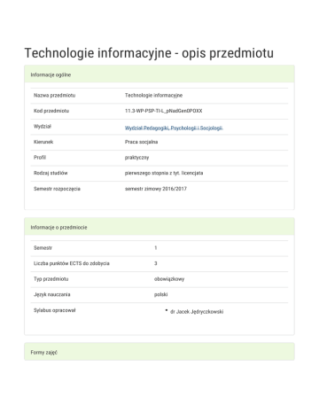 Technologie informacyjne - opis przedmiotu Informacje ogólne Nazwa przedmiotu Technologie informacyjne Kod przedmiotu 11.3-WP-PSP-TI-L_pNadGen0POXX Wydział Wydział Pedagogiki, Psychologii i Socjologii Kierunek Praca socjalna Profil praktyczny Rodzaj studiów pierwszego stopnia z tyt. licencjata Semestr rozpoczęcia semestr zimowy 2016/2017 Informacje o przedmiocie Semestr 1 Liczba punktów ECTS do zdobycia 3 Typ przedmiotu obowiązkowy Język nauczania polski Sylabus opracował Formy zajęć dr Jacek Jędryczkowski Forma zajęć Laboratorium Liczba godzin Liczba godzin Liczba godzin w Liczba godzin w Forma w semestrze w tygodniu semestrze tygodniu zaliczenia (stacjonarne) (stacjonarne) (niestacjonarne) (niestacjonarne) 30 2 18 1,2 Zaliczenie na ocenę Cel przedmiotu Przygotowanie do samodzielnego funkcjonowania we współczesnym społeczeństwie informacyjnym, a także wykształcenie praktycznych umiejętności świadomego i sprawnego posługiwania się ICT w nauce i pracy zawodowej. Wymagania wstępne Podstawowe wiadomości o komputerze i systemie operacyjnym (zakres szkoły średniej). Zakres tematyczny 1. Terminy / pojęcia: Technologia informacyjna a informatyka. TIK (ICT); rola i miejsce TIK w edukacji i pracy zawodowej; ochrona własności intelektualnej; system operacyjny; alternatywne systemy operacyjne (bezpieczeństwo danych i systemu); komputer i sieć komputerowa. urządzenia peryferyjne; edytory tekstu (Microsoft Word, OpenOffice Writer0; Internet – korzystanie z zasobów, komunikacja synchroniczna i asynchroniczna; publikowanie dokumentów HTML (protokół FTP); arkusze kalkulacyjne (Microsoft Excel, OpenOffice Calc); bazy danych (Microsoft Access, OpenOffice Base); pliki multimedialne; prezentacje multimedialne (Microsoft PowerPoint, OpenOffice Impress); prezentacje multimedialne – sieciowe (witryny, interaktywne animacje Flash): (MS Word; WebSite X5 Smart Edition PL; witryny CMS; iSpring; Aligator Flash Designer; authorPOINT). Literatura: http://www.uz.zgora.pl/~jjedrycz/publikacje.html. 2. Bezpieczeństwo danych oraz systemu operacyjnego – ćwiczenia praktyczne; blended learning, poszanowanie praw autorskich. Poszanowanie cudzej własności (prywatne dane, hasła, kody). Literatura: http://www.uz.zgora.pl/~jjedrycz/elearning/html/00bezp.htm. 3. Edytor tekstu Microsoft Word – formatowanie dokumentów. Marginesy i orientacja strony, listy wypunktowane i numerowane, nagłówki i stopki, podział tekstu na kolumny, tworzenie i formatowanie tabel, wstawianie i formatowanie obiektów graficznych, sprawdzanie pisowni i gramatyki w dokumencie, wykorzystywanie słownika synonimów, edytor równań matematycznych; style, automatyczny spis treści, automatyczne podpisywanie rysunków i tabel, Style nagłówków; tworzenie stron WWW; alternatywny edytor tekstu – OpenOffice Writer. ćwiczenia praktyczne; blended learning. Literatura: http://www.uz.zgora.pl/~jjedrycz/elearning/word/word0/00hiper.htm. 4. Arkusz kalkulacyjny - Microsoft Excel lub OpenOffice / LibreOffice Calc (do wyboru). Tworzenie i formatowanie arkuszy danych, sortowanie, tworzenie i kopiowanie funkcji, podstawowe obliczenia, formatowanie wykresów; rejestracja makr; tworzenie formularzy. Formularz jako elektroniczny test lub ankieta. Arkusze sieciowe – import danych z wielu arkuszy, kwerenda sieci Web, sumy częściowe, tabela przestawna, autofiltrowanie, wykresy. Ćwiczenia praktyczne; blended learning. Dla zainteresowanych e-elearning – tworzenie elektronicznych testów i ankiet: http://www.uz.zgora.pl/~jjedrycz/elearning/excel1/00ex.htm. 5. Multimedia: grafika i dźwięk, film. Grafika - typy plików graficznych, konwersja. Fotografia cyfrowa, programy do edycji zdjęć, skanery i skanowanie, tworzenie animowanych plików gif, tworzenie animacji w prezentacji multimedialnej. Dźwięk - rejestracja dźwięku z różnych źródeł, obróbka dźwięku, konwersja plików dźwiękowych. Osadzanie dźwięku w prezentacji multimedialnej. Film - rejestracja filmów z zastosowaniem kamery internetowej, rejestracja ekranu komputera z zastosowaniem aplikacji do tworzenia filmów ekranowych, zapisywanie i konwersja filmów rozpowszechnianych legalnie w Internecie, montaż plików filmowych, tworzenie prostych animacji, animowane napisy. 6. Internet: FTP; WWW; CMS; Edytory HTML. Aplikacje w chmurze; Google Dokumenty oraz Microsoft SkyDrive; DropBox. Przegląd narzędzi do publikowania multimedialnych witryn w sieci Internet (MS Word lub kreatora, np. WebSite X5 Smart Edition PL); Podstawowe informacje o witrynach CMS. Projekt witryny (wykonanie witryny). Metody kształcenia Pokaz, demonstracja, praca z książką (samodzielne korzystanie z multimedialnych kursów online: blended learning oraz elearning), metoda zajęć praktycznych, metoda laboratoryjna. Efekty kształcenia i metody weryfikacji osiągania efektów kształcenia Opis efektu Symbole efektów Metody weryfikacji Forma zajęć Opis efektu Symbole Metody weryfikacji Forma zajęć efektów ma elementarną wiedzę dotyczącą K_W09 aktywność w procesów, narzędzi i technik komunikowania trakcie zajęć z zastosowaniem ICT test z progami Laboratorium punktowymi, sprawdzian o charakterze praktycznym potrafi samodzielnie korzystać z różnych K_U04 aktywność w źródeł nowoczesnych technologii (ICT): trakcie zajęć wyszukiwanie, sortowanie, przetwarzanie, sprawdzian o archiwizacja i wizualizacja informacji oraz charakterze komunikowanie się synchroniczne i praktycznym - asynchroniczne. progi punktowe - dostrzega wpływ ICT na procesy społeczne i gospodarcze. - potrafi wykorzystać narzędzia ICT w nauce i pracy zawodowej. dostrzega potrzebę poszanowania cudzej własności intelektualnej, przestrzega praw autorskich. - odpowiedzialnie przygotowuje się do swojej pracy, projektuje i wykonuje działania pedagogiczne z zastosowaniem ICT. Warunki zaliczenia K_K07 projekt Laboratorium Laboratorium Wiedza teoretyczna zdobywana podczas zajęć oraz sam