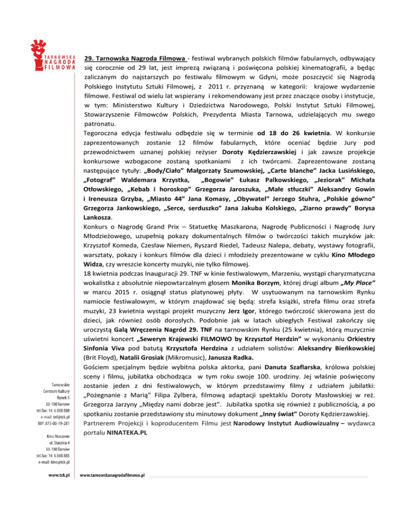 29. Tarnowska Nagroda Filmowa - festiwal wybranych polskich filmów fabularnych, odbywający się corocznie od 29 lat, jest imprezą związaną i poświęcona polskiej kinematografii, a będąc zaliczanym do najstarszych po festiwalu filmowym w Gdyni, może poszczycić się Nagrodą Polskiego Instytutu Sztuki Filmowej, z 2011 r. przyznaną w kategorii: krajowe wydarzenie filmowe. Festiwal od wielu lat wspierany i rekomendowany jest przez znaczące osoby i instytucje, w tym: Ministerstwo Kultury i Dziedzictwa Narodowego, Polski Instytut Sztuki Filmowej, Stowarzyszenie Filmowców Polskich, Prezydenta Miasta Tarnowa, udzielających mu swego patronatu. Tegoroczna edycja festiwalu odbędzie się w terminie od 18 do 26 kwietnia. W konkursie zaprezentowanych zostanie 12 filmów fabularnych, które oceniać będzie Jury pod przewodnictwem uznanej polskiej reżyser Doroty Kędzierzawskiej i jak zawsze projekcje konkursowe wzbogacone zostaną spotkaniami z ich twórcami. Zaprezentowane zostaną następujące tytuły: „Body/Ciało” Małgorzaty Szumowskiej, „Carte blanche” Jacka Lusińskiego, „Fotograf” Waldemara Krzystka, „Bogowie” Łukasz Palkowskiego, „Jeziorak” Michała Otłowskiego, „Kebab i horoskop” Grzegorza Jaroszuka, „Małe stłuczki” Aleksandry Gowin i Ireneusza Grzyba, „Miasto 44” Jana Komasy, „Obywatel” Jerzego Stuhra, „Polskie gówno” Grzegorza Jankowskiego, „Serce, serduszko” Jana Jakuba Kolskiego, „Ziarno prawdy” Borysa Lankosza. Konkurs o Nagrodę Grand Prix – Statuetkę Maszkarona, Nagrodę Publiczności i Nagrodę Jury Młodzieżowego, uzupełnią pokazy dokumentalnych filmów o twórczości takich muzyków jak: Krzysztof Komeda, Czesław Niemen, Ryszard Riedel, Tadeusz Nalepa, debaty, wystawy fotografii, warsztaty, pokazy i konkurs filmów dla dzieci i młodzieży prezentowane w cyklu Kino Młodego Widza, czy wreszcie koncerty muzyki, nie tylko filmowej. 18 kwietnia podczas Inauguracji 29. TNF w kinie festiwalowym, Marzeniu, wystąpi charyzmatyczna wokalistka z absolutnie niepowtarzalnym głosem Monika Borzym, której drugi album „My Place” w marcu 2015 r. osiągnął status platynowej płyty. W usytuowanym na tarnowskim Rynku namiocie festiwalowym, w którym znajdować się będą: strefa książki, strefa filmu oraz strefa muzyki, 23 kwietnia wystąpi projekt muzyczny Jerz Igor, którego twórczość skierowana jest do dzieci, jak również osób dorosłych. Podobnie jak w latach ubiegłych Festiwal zakończy się uroczystą Galą Wręczenia Nagród 29. TNF na tarnowskim Rynku (25 kwietnia), którą muzycznie uświetni koncert „Seweryn Krajewski FILMOWO by Krzysztof Herdzin” w wykonaniu Orkiestry Sinfonia Viva pod batutą Krzysztofa Herdzina z udziałem solistów: Aleksandry Bieńkowskiej (Brit Floyd), Natalii Grosiak (Mikromusic), Janusza Radka. Gościem specjalnym będzie wybitna polska aktorka, pani Danuta Szaflarska, królowa polskiej sceny i filmu, jubilatka obchodząca w tym roku swoje 100. urodziny. Jej właśnie poświęcony zostanie jeden z dni festiwalowych, w którym przedstawimy filmy z udziałem jubilatki: „Pożegnanie z Marią” Filipa Zylbera, filmową adaptacji spektaklu Doroty Masłowskiej w reż. Grzegorza Jarzyny „Między nami dobrze jest”. Jubilatka spotka się również z publicznością, a po spotkaniu zostanie przedstawiony stu minutowy dokument „Inny świat” Doroty Kędzierzawskiej. Partnerem Projekcji i koproducentem Filmu jest Narodowy Instytut Audiowizualny – wydawca portalu NINATEKA.PL Dodać należy, iż Danuta Szaflarska w roku 2011 została uhonorowana na tarnowskim festiwalu Nagrodą za całokształt twórczości. Tegorocznym laureatem tej Nagrody, decyzją Kapituły 29. TNF został światowej sławy polski scenograf Allan Starski, laureat Oscara. Do każdej edycji festiwalu powstaje artystyczny plakat, dotychczas autorami byli m.in.: Andrzej Dudziński, Waldemar Świerzy, Andrzej Pągowski, Rafał Olbiński, Piotr Młodożeniec, Rosław Szaybo, Edward Dwurnik. W tym roku autorem plakatu jest wybitny fotografik Ryszard Horowitz. Organizator: Tarnowskie Centrum Kultury Partnerem Głównym TNF jest Grupa Azoty. Partner: Tauron Dystrybucja Sponsorzy: C.H. Świt, Grupa Autograf, Kawiarnia Tatrzańska, RPM Sound&Voices, Hotel Tarnovia, Bodoni – Reklama Wizualna Patroni medialni: Trójka – Polskie Radio, Radio Kraków S.A., Radio Rzeszów S.A., TVP2, TVP Kultura, TVP Kraków, Imav.tv, Telewizja Kino Polska, Gazeta Wyborcza, Galicyjski Tygodnik Informacyjny Temi, Magazyn Filmowy, TelePro, Kino, Filmpolski.pl, Sfp.org.pl, Filmweb.pl, Kultura.tarnow.pl Współpraca: Sieć Kin Studyjnych i Lokalnych, Filmoteka Narodowa, Kino Za Rogiem, Legalna Kultura Patronat i współfinansowanie: Ministerstwo Kultury i Dziedzictwa Narodowego, Polski Instytut Sztuki Filmowej, Stowarzyszenie Filmowców Polskich, Urząd Miasta Tarnowa Więcej informacji o festiwalu: www.tarnowskanagrodafilmowa.pl