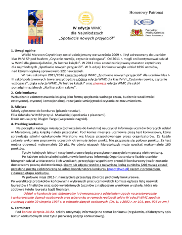 Honorowy Patronat IV edycja WMC dla Najmłodszych „Spotkacie nowych przyjaciół” 1. Uwagi ogólne Wielki Maraton Czytelniczy został zainicjowany we wrześniu 2009 r. i był adresowany do uczniów klas IV-VI SP pod hasłem „Czytanie rozwija, czytanie wzbogaca”. Od 2011 r. mogli oni kontynuować udział w WMC dla gimnazjalistów „W lustrze książki”. W 2012 roku został zainicjowany maraton czytelniczy dla najmłodszych „Spotkacie nowych przyjaciół”. W 3. edycji konkursu wzięło udział 1896 uczniów, nad którymi opiekę sprawowało 122 nauczycieli. W roku szkolnym 2015/2016 czwartej edycji WMC „Spotkacie nowych przyjaciół” dla uczniów klas IIII szkół podstawowych towarzyszyć będzie siódma edycja WMC dla klas IV-VI „Czytanie rozwija, czytanie wzbogaca”, piąta edycja WMC „W lustrze książki” oraz pierwsza edycja WMC dla szkół ponadgimnazjalnych „Na literackim szlaku”. 2. Cele konkursu Wzbudzanie zainteresowania książką jako formą spędzania wolnego czasu, budzenie wrażliwości estetycznej, etycznej i emocjonalnej, rozwijanie umiejętności czytania ze zrozumieniem. 3. Miejsce Szkoły zgłoszone do konkursu (pisanie testów). Filia Gdańska WiMBP przy ul. Mariackiej (spotkania z pisarzami). Dwór Artusa przy Długim Targu (wręczenie nagród). 4. Przebieg konkursu Na początku każdego miesiąca (od września do kwietnia) nauczyciel informuje uczniów biorących udział w Maratonie, jaką książkę należy przeczytać. Pod koniec miesiąca uczniowie piszą test konkursowy, który sprawdzają szkolni opiekunowie Maratonu wg klucza przygotowanego przez organizatorów. Za każde zadanie wykonane poprawnie uczestnik otrzymuje jeden punkt. Nie przyznaje się połowy punktu. Za test można otrzymać maksymalnie 20 pkt. Po ośmiu etapach Maratończyk może uzyskać maksymalnie 160 punktów. Tytuły kolejnych lektur i testy konkursowe będą przesyłane nauczycielom pocztą elektroniczną. Po każdym teście szkolni opiekunowie konkursu informują Organizatorów o liczbie uczniów biorących udział w Maratonie i ich wynikach, przesyłając wypełniony protokół konkursowy (wzór zostanie dostarczony pocztą elektroniczną). Skany lub zdjęcia testów z najwyższą liczbą punktów (20) muszą zostać przesłane pocztą elektroniczną na adres koordynatora konkursu ( [email protected]) razem z protokołem z danego etapu konkursu. W połowie maja 2015 r. nauczyciele przesyłają zbiorcze protokoły konkursowe. Po weryfikacji protokołów końcowych i wybranych prac uczniowskich komisja ogłasza listę nazwisk laureatów i finalistów oraz osób wyróżnionych (uczniów z najlepszym wynikiem w szkole, która nie zdobywa tytułu laureata bądź finalisty). Udział w konkursie jest dobrowolny i równoznaczny z udzieleniem zgody na przetwarzanie i wykorzystanie danych osobowych oraz wizerunku w ramach realizacji celów IV edycji WMC zgodnie z ustawą z dnia 29 sierpnia 1997 r. o ochronie danych osobowych (Dz. U. z 2002 r. nr 101, poz. 926 ze zm.) 5. Terminarz Pod koniec sierpnia 2015r. szkoły otrzymają informacje na temat konkursu (regulamin, alfabetyczny spis lektur konkursowych oraz tytuł pierwszej pozycji konkursowej). Do 15 września 2015r. szkoły zgłaszają chęć uczestnictwa w konkursie na adres: [email protected], podając swoje dane teleadresowe i nazwiska nauczycieli- opiekunów konkursu. 7 października, 4 listopada, 2 grudnia 2015 roku oraz 5 stycznia, 3 lutego, 2 marca, 6 kwietnia 2016 roku szkoły biorące udział w konkursie otrzymują kolejne testy konkursowe, klucze odpowiedzi oraz informację o kolejnej lekturze Maratonu. 5 maja 2015 r. szkoły otrzymują ostatni test konkursowy wraz z kluczem odpowiedzi. Do 20 maja 2015r. nauczyciele przesyłają drogą pocztową wypełnione zbiorcze protokoły konkursowe podpisane przez dyrektora szkoły i szkolnych opiekunów konkursu. Na przełomie maja i czerwca 2016 r. komisja konkursowa ogłasza nazwiska finalistów, laureatów i wyróżnionych oraz podaje termin i miejsce uroczystości zakończenia IV edycji Wielkiego Maratonu Czytelniczego. Za rzetelne przeprowadzenie konkursu w szkołach odpowiadają nauczyciele. Jeśli uczeń wyrazi chęć wzięcia udziału w Maratonie lub zechce zrezygnować z udziału już w czasie trwania konkursu, jego imię i nazwisko należy umieścić w protokole, podając uzyskaną liczbę punktów. W związku z sugestiami szkolnych opiekunów konkursu i rodziców komisja zastrzega sobie prawo do wglądu w arkusze konkursowe w celu sprawdzenia zgodności przyznanych punktów z kluczem odpowiedzi oraz weryfikacji prac i protokołów. Decyzja komisji jest ostateczna. 6. Alfabetyczny wykaz lektur Hans Christian Andersen, Calineczka Dorota Combrzynska- Nogala, Syberyjskie przygody Chmurki Wojciech Kołyszko, Bawian, Cudanna i pułapki zazdrości A.A. Milne, Chatka Puchatka Joanna Nadin, Panny z piekła rodem. Prawdziwe pandemonium Joanna Papuzińska, Asiunia Francesca Simon,Koszmarny Karolek. Bestia boiska atakuje Maciej Wojtyszko, Bromba i inni 8. Komisja konkursowa Małgorzata Niechwiedowicz- nauczycielka j. polskiego (SP nr 27 w Gdańsku), autorka testów konkursowych, współautorka formuły konkursu i współorganizatorka przedsięwzięcia i imprez towarzyszących. Agata Markiewicz-Babło- dyrektorka SP nr 82 w Gdańsku, nauczycielka j. polskiego autorka testów konkursowych, współautorka jego formuły oraz współorganizatorka przedsięwzięcia i imprez towarzyszących. Ewa Niechwiedowicz- nauczycielka j. polskiego (I Zespół Szkół STO w Gdańsku), autorka testów konkursowych, współautorka formuły konkursu i współorganizatorka przedsięwzięcia i imprez towarzyszących. Zbigniew Walczak - kierownik Filii Gdańskiej Wojewódzkiej i Miejskiej Biblioteki Publicznej im. Josepha Conrada- Korzeniowskiegow Gdańsku, współorganizator konkursu i imprez towarzyszących. Wszelkie pytania prosimy kierować do koordynatora konkursu Małgorzaty Niechwiedo
