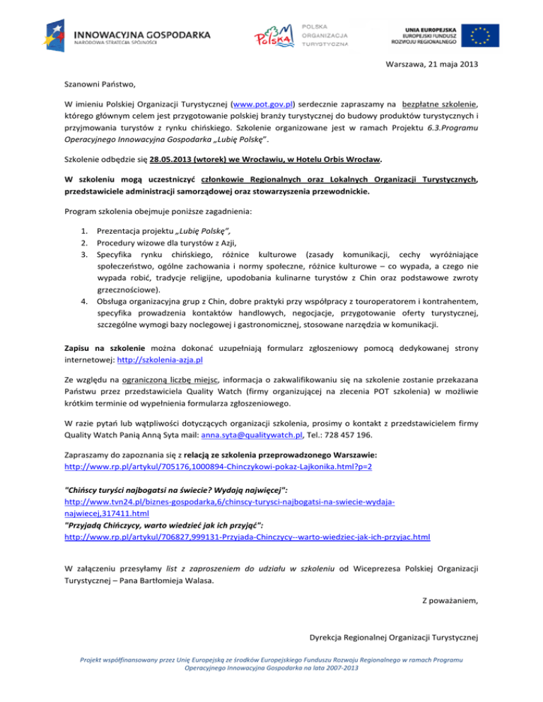 Warszawa, 21 maja 2013 Szanowni Państwo, W imieniu Polskiej Organizacji Turystycznej (www.pot.gov.pl) serdecznie zapraszamy na bezpłatne szkolenie, którego głównym celem jest przygotowanie polskiej branży turystycznej do budowy produktów turystycznych i przyjmowania turystów z rynku chińskiego. Szkolenie organizowane jest w ramach Projektu 6.3.Programu Operacyjnego Innowacyjna Gospodarka „Lubię Polskę”. Szkolenie odbędzie się 28.05.2013 (wtorek) we Wrocławiu, w Hotelu Orbis Wrocław. W szkoleniu mogą uczestniczyć członkowie Regionalnych oraz Lokalnych Organizacji Turystycznych, przedstawiciele administracji samorządowej oraz stowarzyszenia przewodnickie. Program szkolenia obejmuje poniższe zagadnienia: 1. Prezentacja projektu „Lubię Polskę”, 2. Procedury wizowe dla turystów z Azji, 3. Specyfika rynku chińskiego, różnice kulturowe (zasady komunikacji, cechy wyróżniające społeczeństwo, ogólne zachowania i normy społeczne, różnice kulturowe – co wypada, a czego nie wypada robić, tradycje religijne, upodobania kulinarne turystów z Chin oraz podstawowe zwroty grzecznościowe). 4. Obsługa organizacyjna grup z Chin, dobre praktyki przy współpracy z touroperatorem i kontrahentem, specyfika prowadzenia kontaktów handlowych, negocjacje, przygotowanie oferty turystycznej, szczególne wymogi bazy noclegowej i gastronomicznej, stosowane narzędzia w komunikacji. Zapisu na szkolenie można dokonać uzupełniają formularz zgłoszeniowy pomocą dedykowanej strony internetowej: http://szkolenia-azja.pl Ze względu na ograniczoną liczbę miejsc, informacja o zakwalifikowaniu się na szkolenie zostanie przekazana Państwu przez przedstawiciela Quality Watch (firmy organizującej na zlecenia POT szkolenia) w możliwie krótkim terminie od wypełnienia formularza zgłoszeniowego. W razie pytań lub wątpliwości dotyczących organizacji szkolenia, prosimy o kontakt z przedstawicielem firmy Quality Watch Panią Anną Syta mail: [email protected], Tel.: 728 457 196. Zapraszamy do zapoznania się z relacją ze szkolenia przeprowadzonego Warszawie: http://www.rp.pl/artykul/705176,1000894-Chinczykowi-pokaz-Lajkonika.html?p=2 "Chińscy turyści najbogatsi na świecie? Wydają najwięcej": http://www.tvn24.pl/biznes-gospodarka,6/chinscy-turysci-najbogatsi-na-swiecie-wydajanajwiecej,317411.html "Przyjadą Chińczycy, warto wiedzieć jak ich przyjąć": http://www.rp.pl/artykul/706827,999131-Przyjada-Chinczycy--warto-wiedziec-jak-ich-przyjac.html W załączeniu przesyłamy list z zaproszeniem do udziału w szkoleniu od Wiceprezesa Polskiej Organizacji Turystycznej – Pana Bartłomieja Walasa. Z poważaniem, Dyrekcja Regionalnej Organizacji Turystycznej Projekt współfinansowany przez Unię Europejską ze środków Europejskiego Funduszu Rozwoju Regionalnego w ramach Programu Operacyjnego Innowacyjna Gospodarka na lata 2007-2013